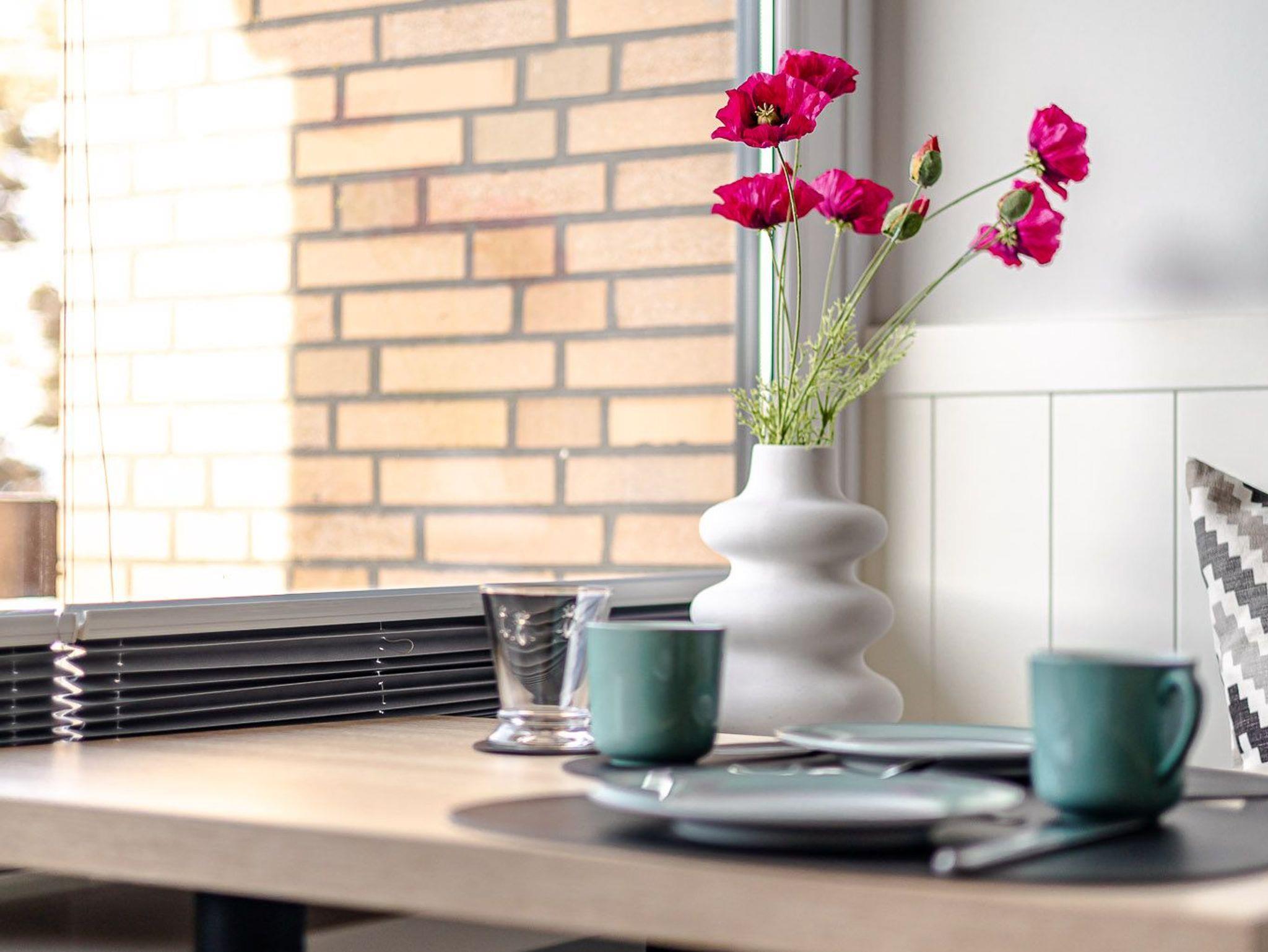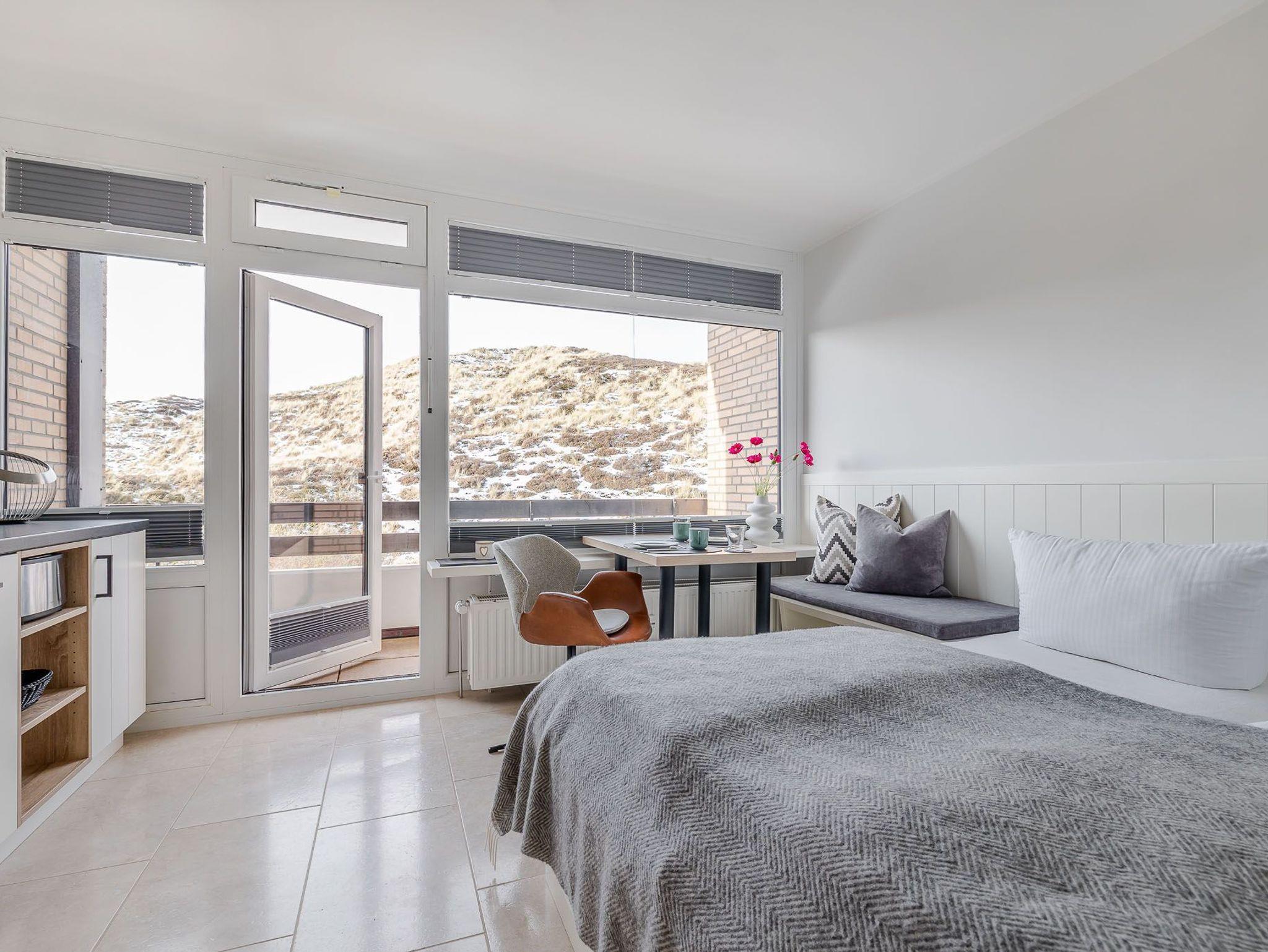 Der großzügig geschnittene Wohnraum mit modernem Interieur integriert neben einem Arbeitstisch mit Sitzgelegenheit und einem Doppelbett auch eine komplett ausgestattete Küche für ausgedehnte kulinarische Abende. Dank des großen Panoramafensters mit Tür zur Terrasse ist das gesamte Zimmer lichtdurchflutet und sorgt allzeit für eine behagliche Stimmung. Und das Schönste: Direkt dahinter beginnen die Dünen, die sich von hier bis zur offenen Nordsee erstrecken. Mehr Natur geht kaum.