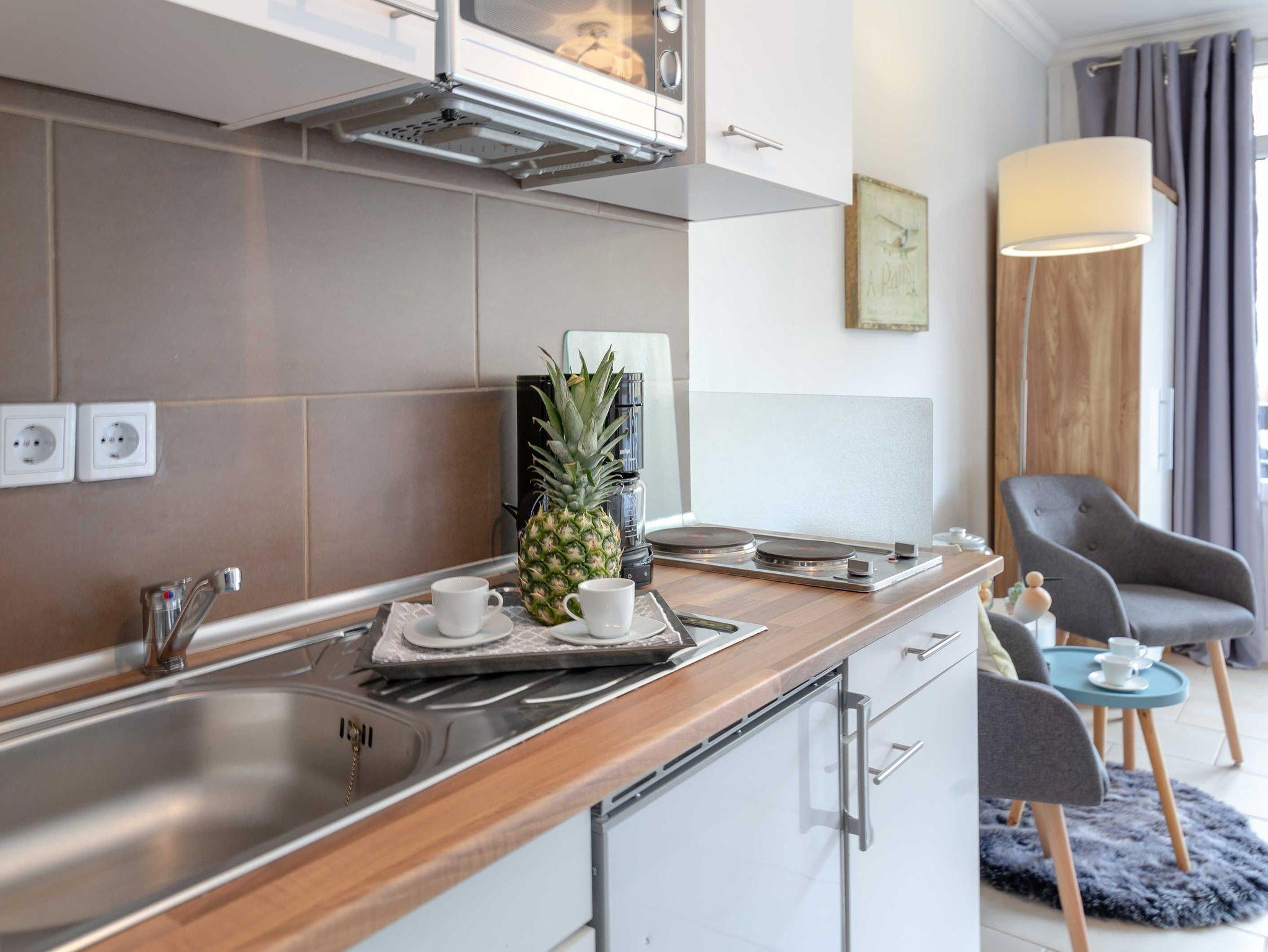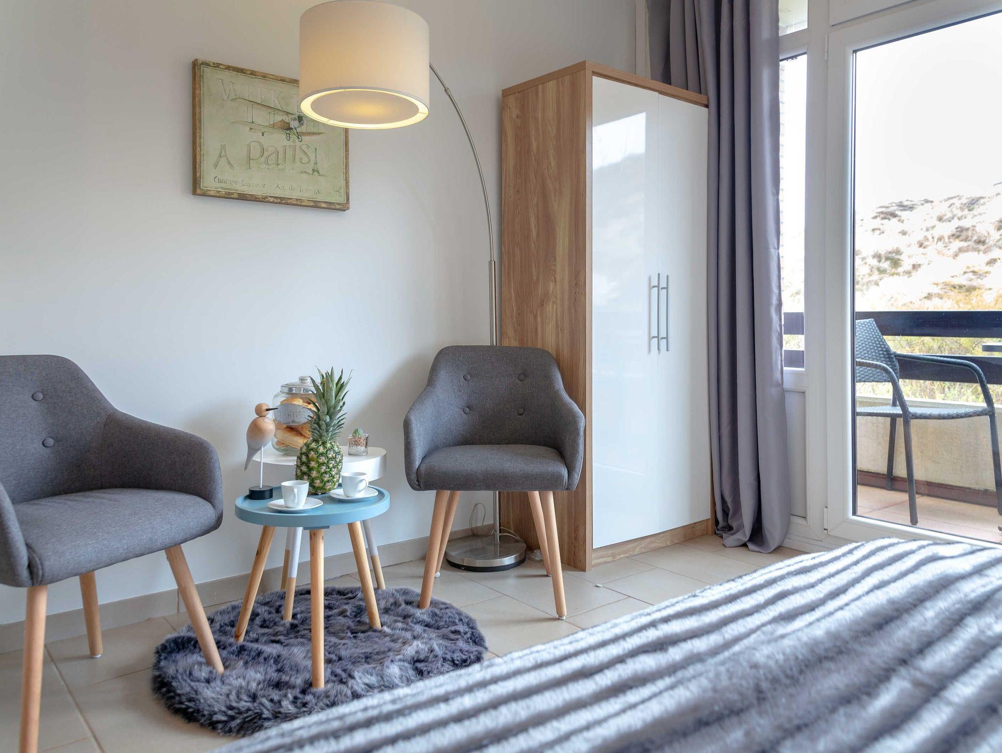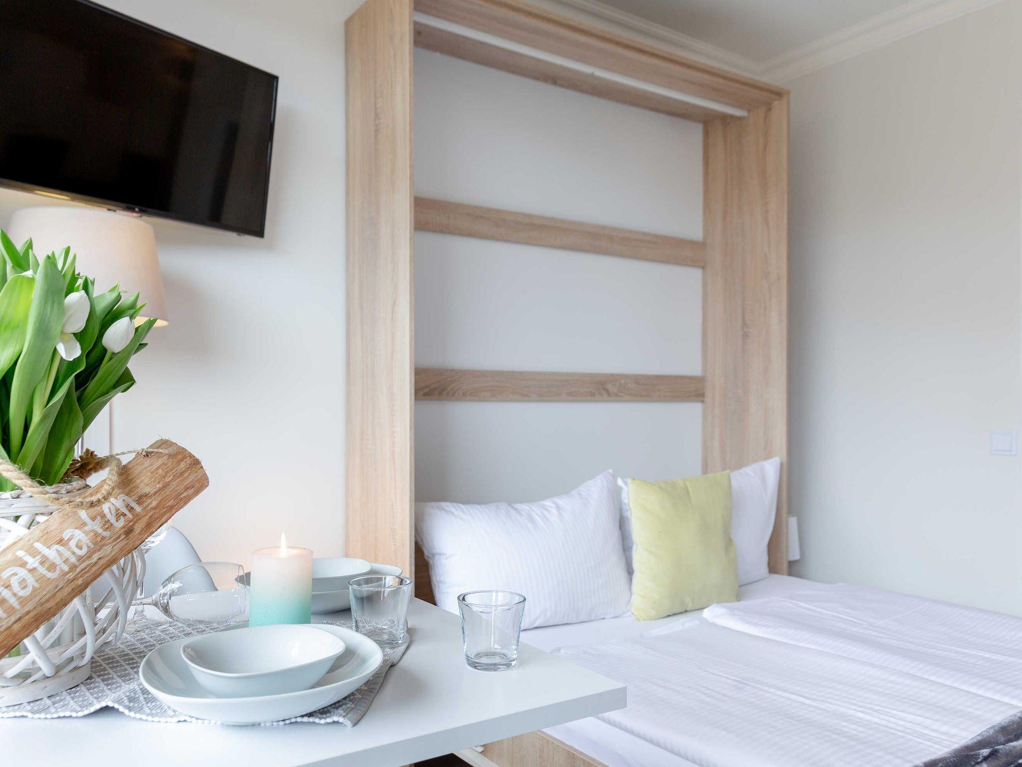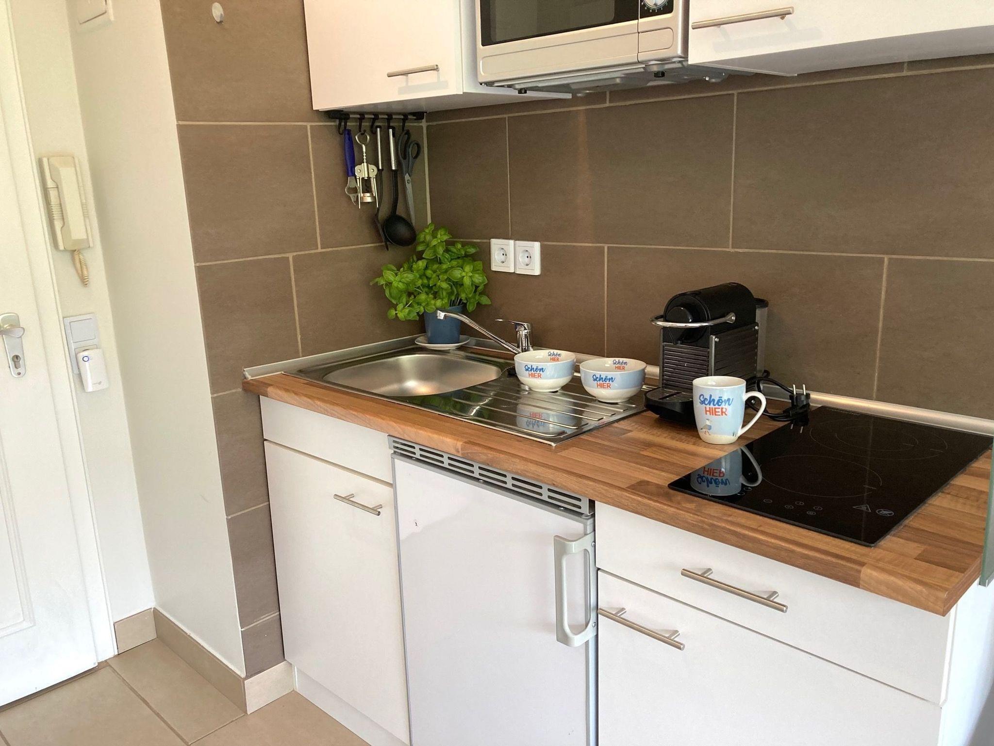 Im modern und zweckmäßig eingerichteten Appartment finden Sie ein großes Wohn-/Schlafzimmer mit Doppel-Klappbett, Kleiderschrank, Sesseln und Sitzecke mit Tisch, eine voll ausgestattete Küchenzeile mit 2 Kochstellen, Mikrowelle und Kühlschrank sowie Kaffeemaschine, Kapselautomat und Toaster. Das Badezimmer mit Dusche ist freundlich gestaltet. Zur Westseite, von der Straße abgewandt und ruhig gelegen, befindet sich ein schöner Balkon, auf dem Sie ab Mittag bis in den Abend hinein mit Blick auf Dünen und Heide die Sonne genießen können.