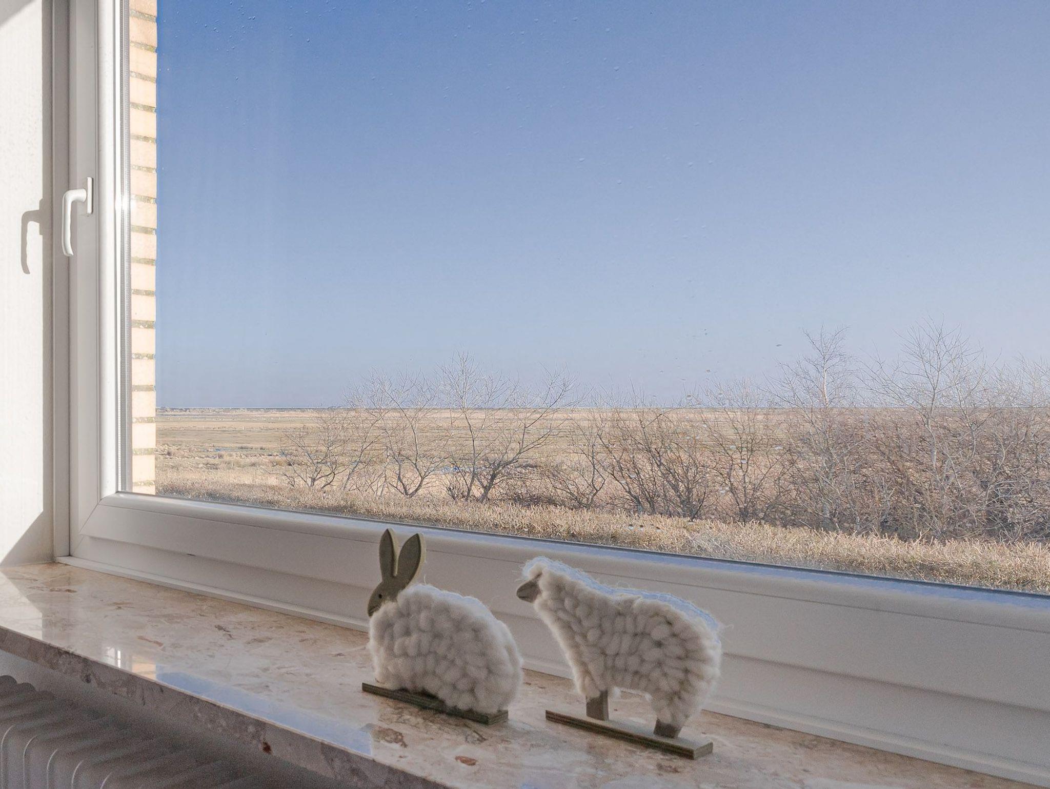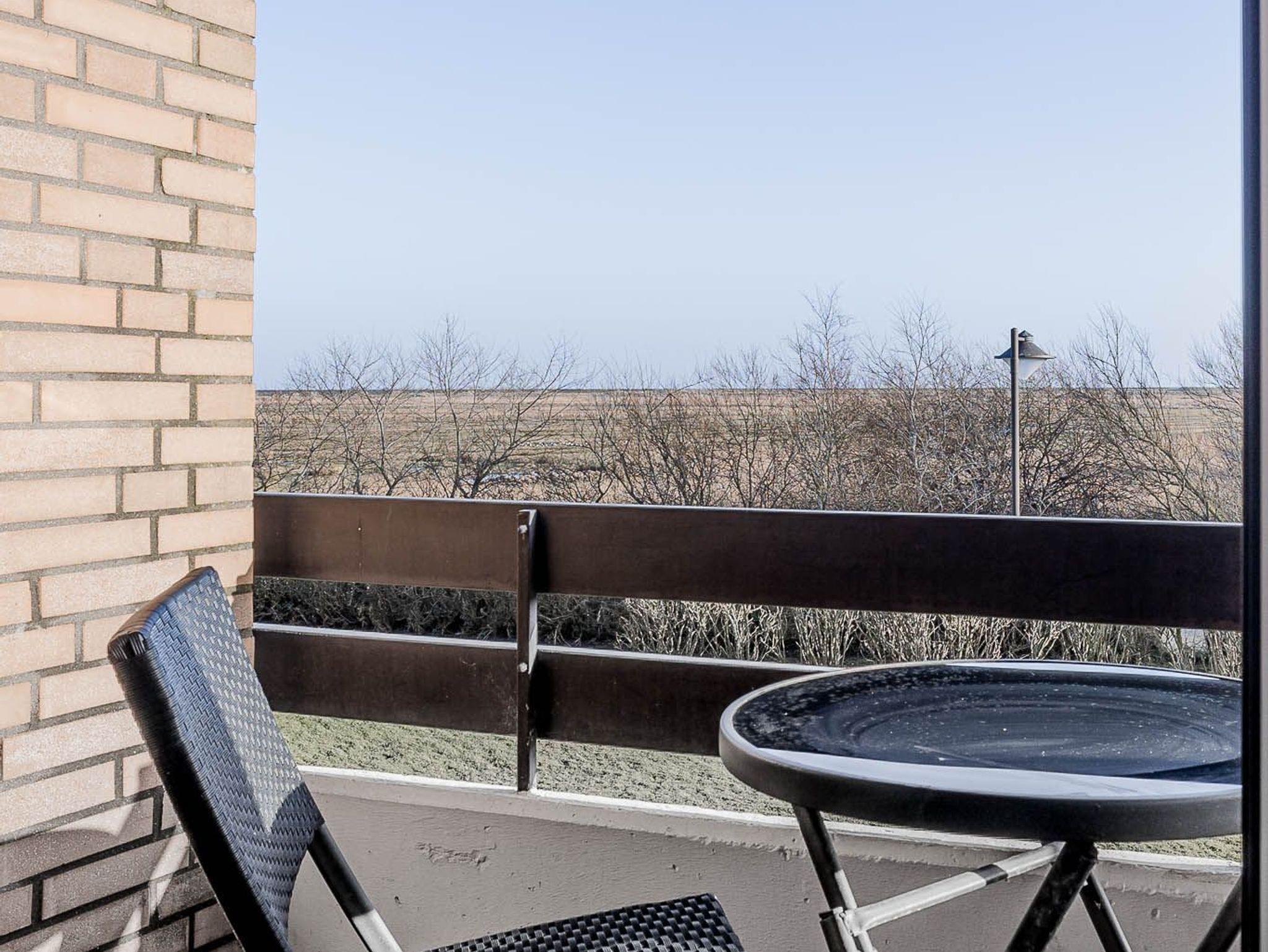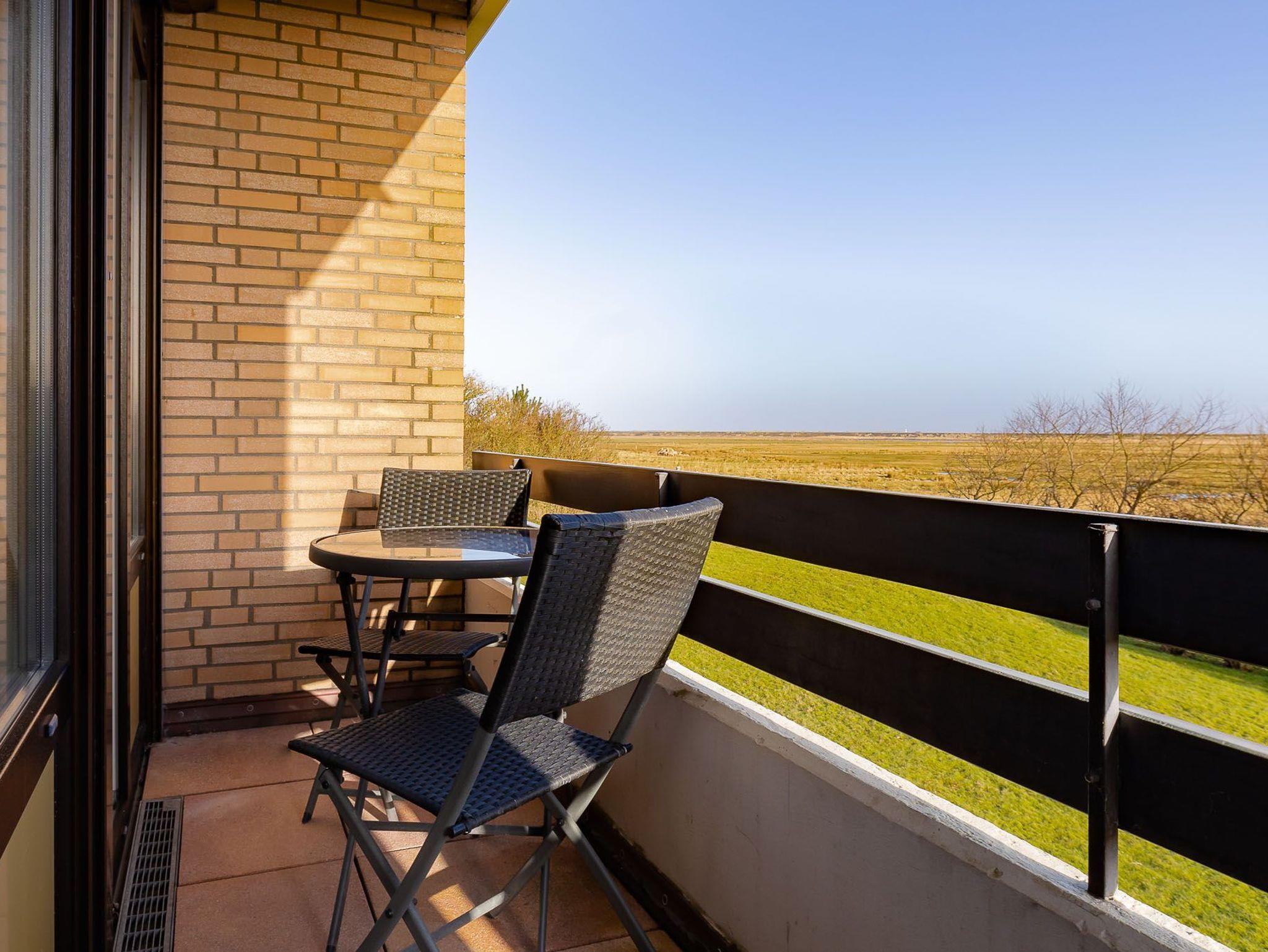 aus dem Fenster und ein Balkon mit Sicht auf das Meer und den Deich. Und mit dem Pkw-Stellplatz vor der Tür