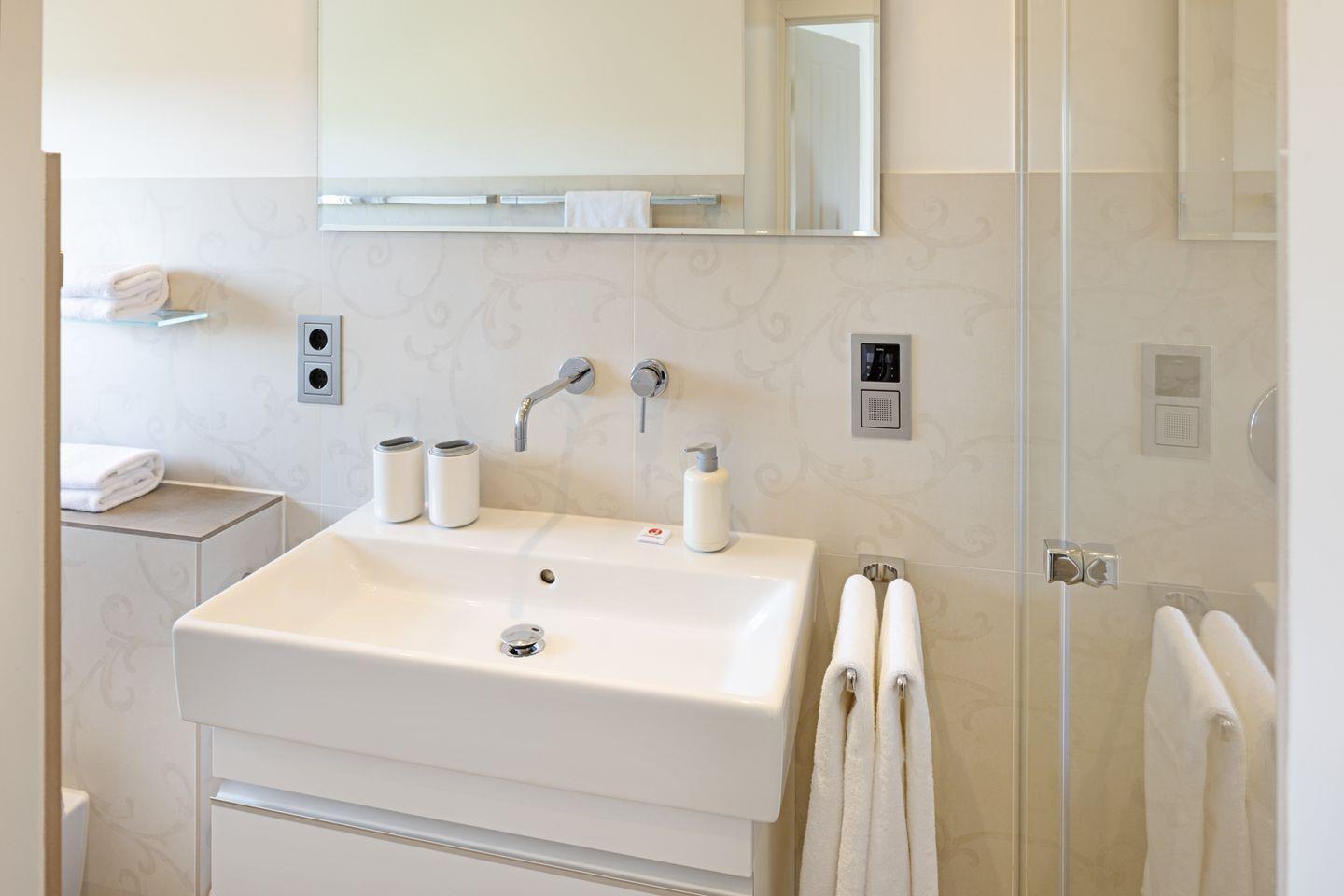 Das Badezimmer befindet sich ebenfalls im Obergeschoss und ist mit einer bodengleichen Dusche ausgestattet.