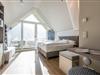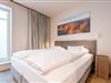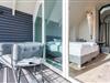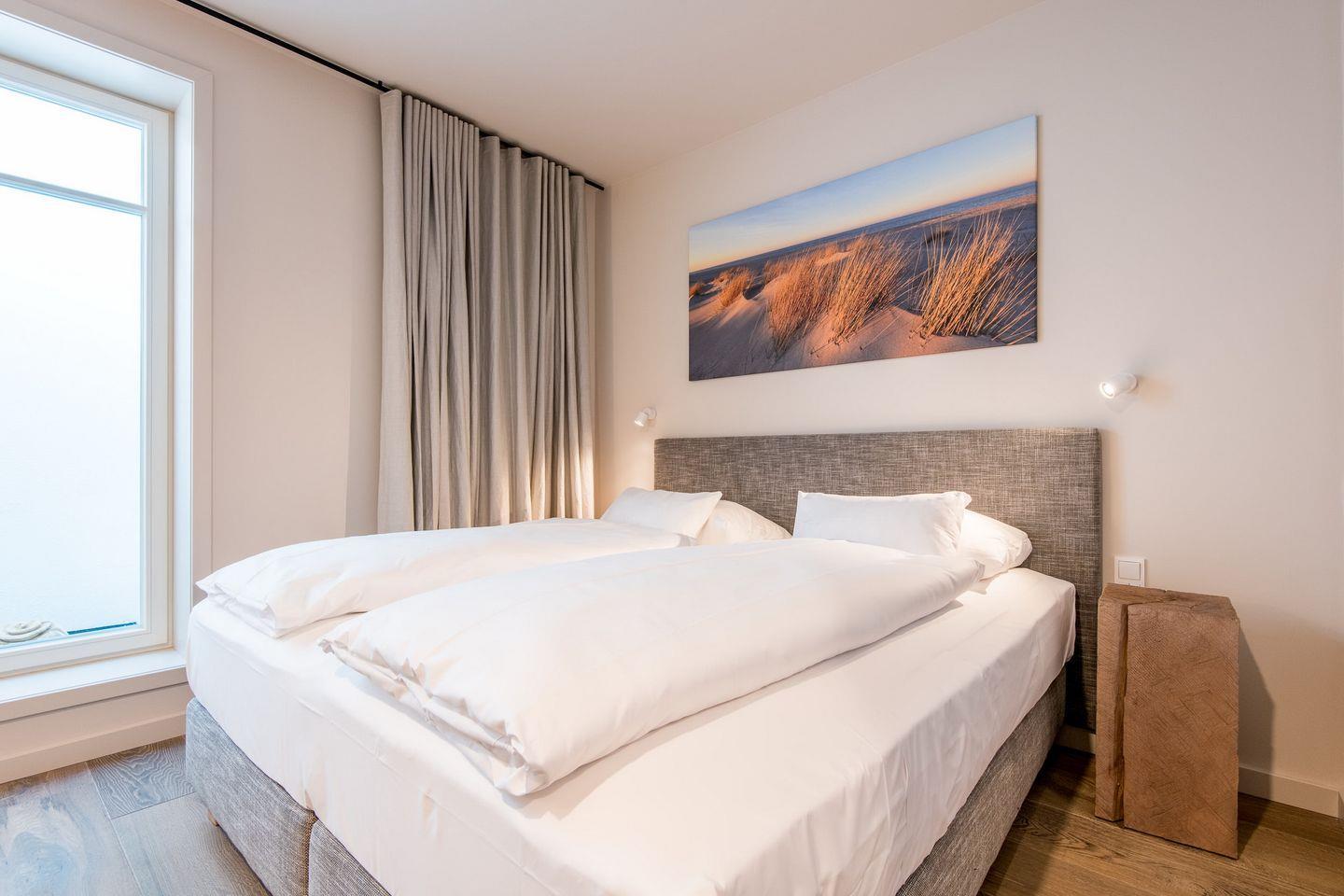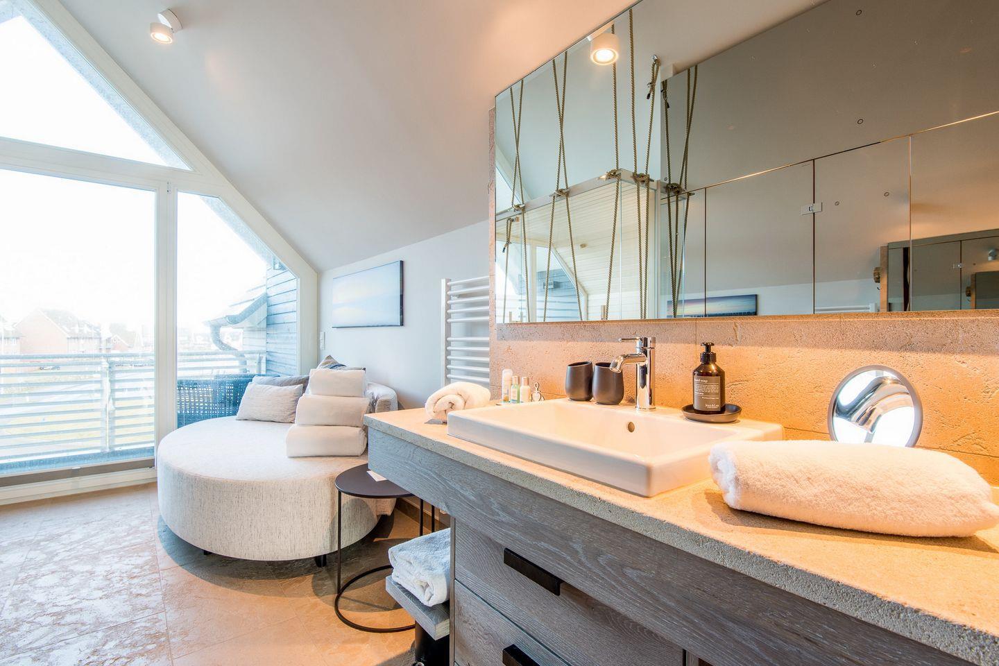 DG: ein Raum mit Doppelbett (1,80 x 2,00 m) und TV, eigener Balkon, offenes Duschbad mit separatem WC, Saunabereich mit Balkon.