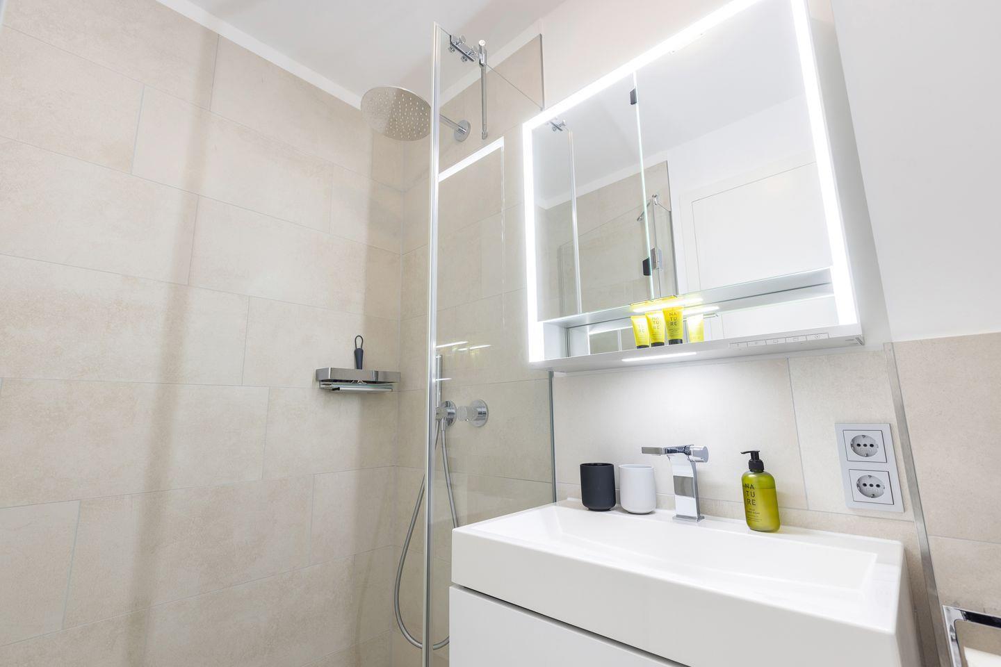 1 Schlafzimmer mit Boxspring-Doppelbett (200x200cm) und Flatscreen-TV, ein Schlafzimmer mit Boxspring-Doppelbett (160 x 200 cm), zwei Duschbäder. Die Wohnung verfügt über zwei Balkone, mit Gartenmöbeln aus Aluminium. In Haus befindet sich ein Fahrstuhl.