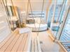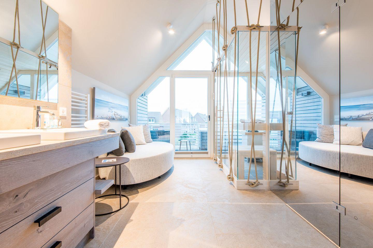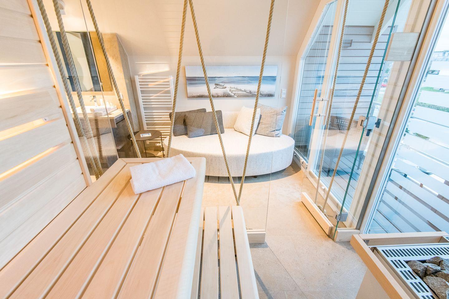 Die Sauna mit Relax-Sofa, sowie eine Dusche und ein separates WC befinden sich ebenfalls auf dieser oberen Ebene. Eine weitere Loggia mit Sitzmöbeln für zwei Bewohner schliesst sich hier an.