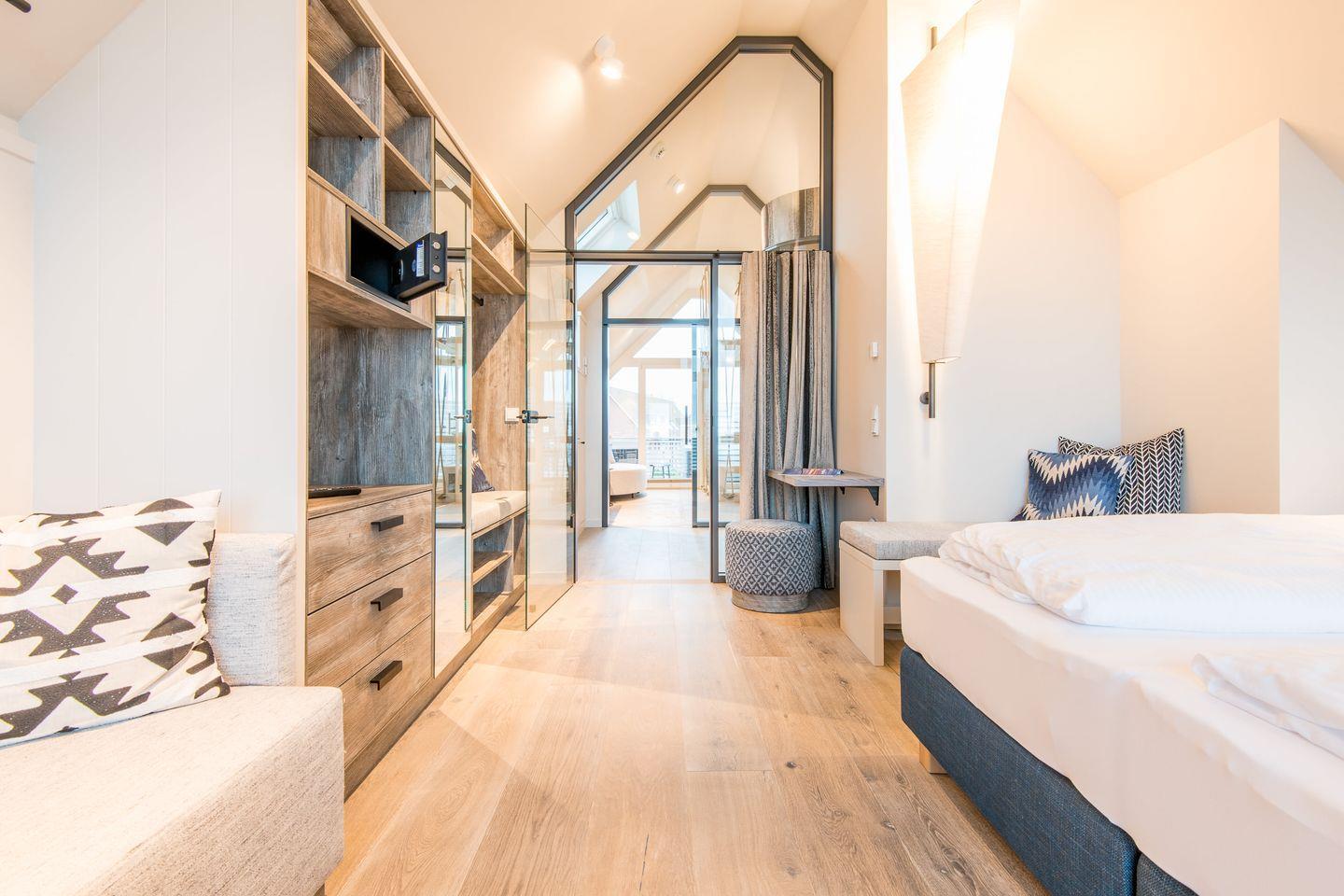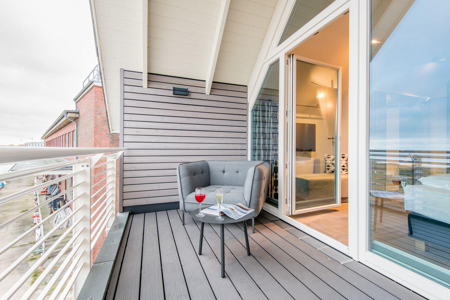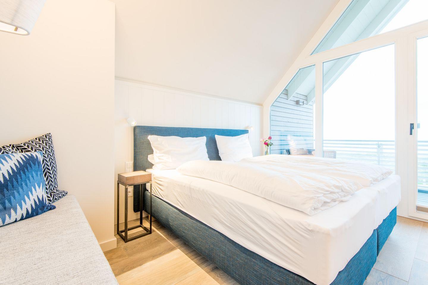 In der obersten Ebene angelangt finden Sie einen weiteres, wunderschönes Schlafzimmmer mit Austritt auf die eigene Loggia mit Blick auf das Wasser und gemütlichen Sitzmöbeln für zwei Personen.