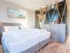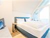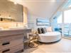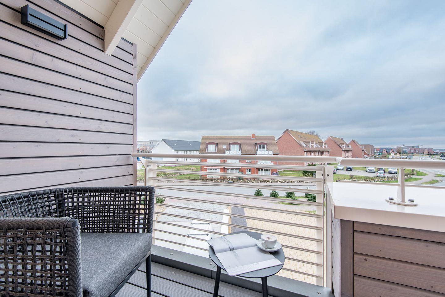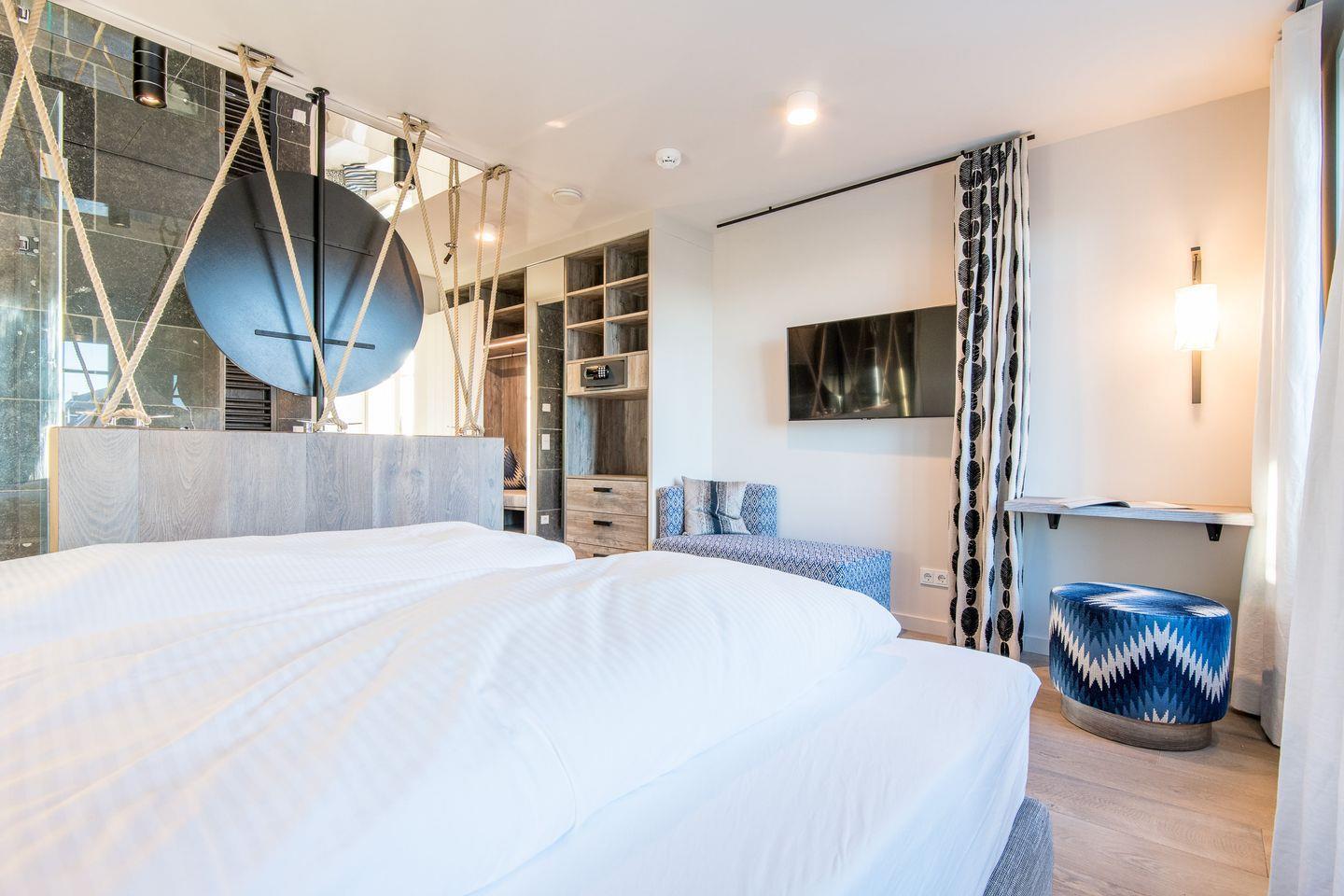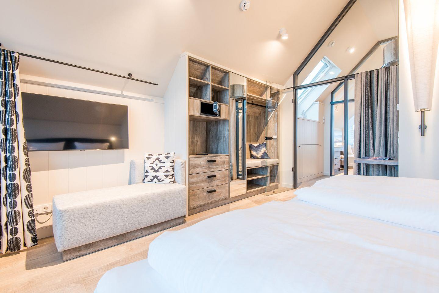 In der obersten Ebene angelangt finden Sie einen weiteres, wunderschönes Schlafzimmmer mit Austritt auf die eigene Loggia mit Blick auf das Wasser und gemütlichen Sitzmöbeln für zwei Personen.