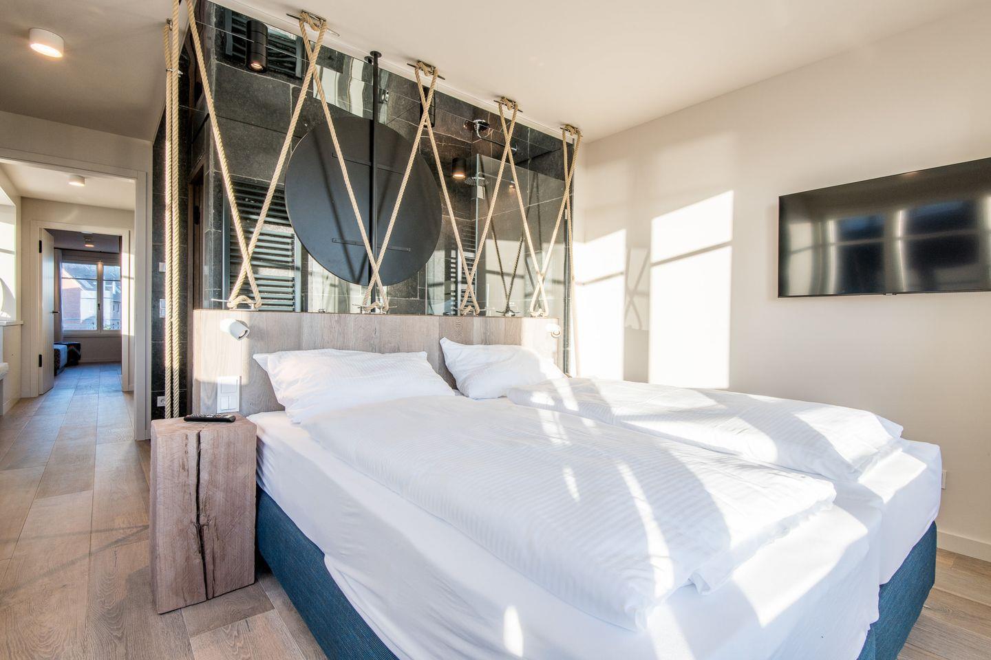 Sie gelangen von der Tiefgarage aus direkt in Ihr Beachhouse und betreten das Dünengeschoss (Untergeschoss) – hier befinden sich ein großzügiges Schlafzimmer und ein luxuriöses Naturstein-Badezimmer en Suite mit bodengleicher Dusche, Waschtisch und WC.
