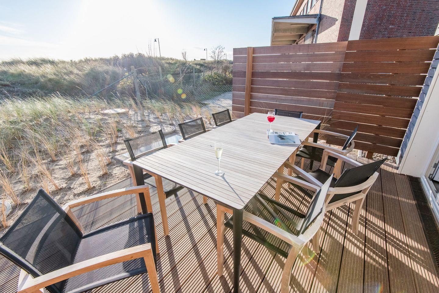 Von hier aus gelangen Sie auf Ihre eigene Bangkirai-Terrasse mit exklusiven italienischen Designer-Möbeln für alle Bewohner, es schließt sich direkt die Naturgeschützte Dünenfläche mit Rosen an – hier gilt für alle Zwei – und Vierbeiner – Betreten leider nicht gestattet, Blick und Flair genießen Ausdrücklich erlaubt.