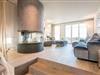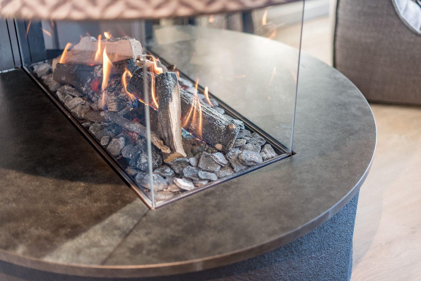 Im Erdgeschoss angelangt erwartet Sie der schön gestaltete Wohnbereich mit gläsernem Gaskamin – das wunderschöne Feuer sehen Sie hier von drei Seiten.