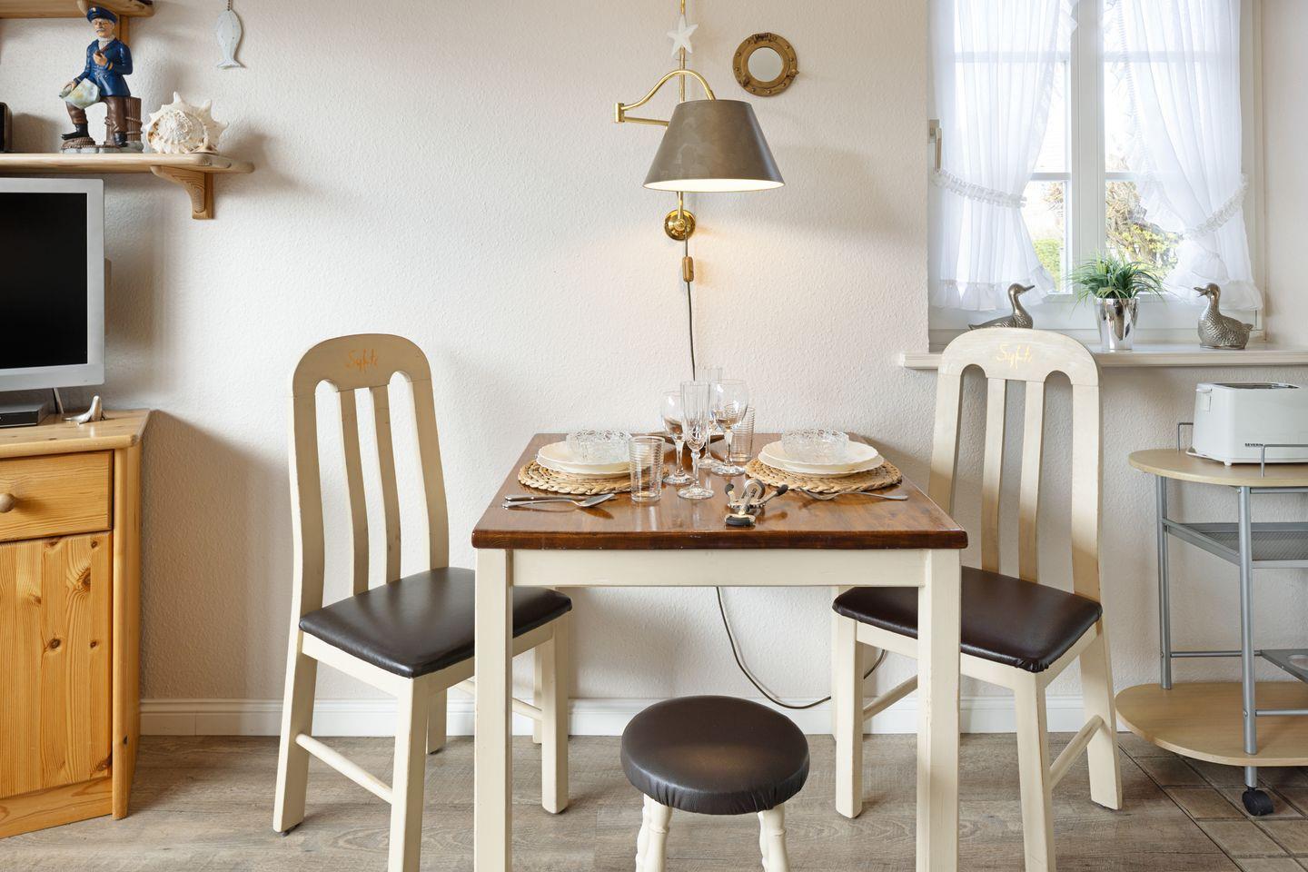 Neben dem gemütlichen Wohnzimmer mit Flachbildfernseher finden Sie eine Küche sowie einen Essbereich.