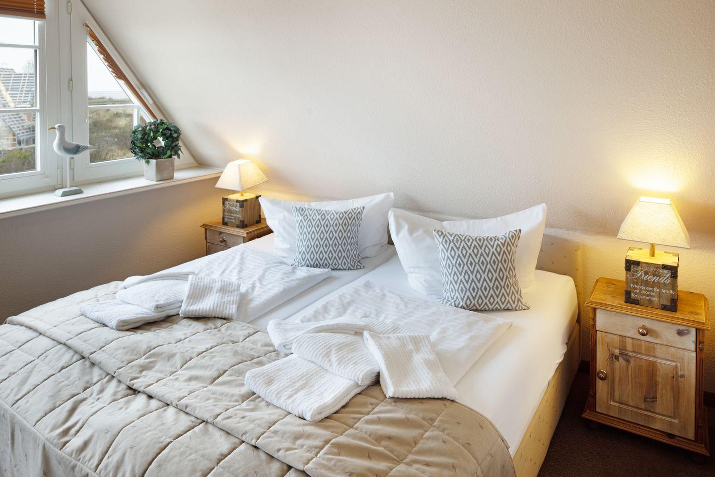 Die Ferienwohnung verfügt über ein Schlafzimmer mit Doppelbett (im zweiten Obergeschoss) und eine Schlafcouch für zwei Personen mit zusätzlichen Topper im Wohnzimmer.