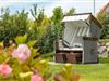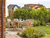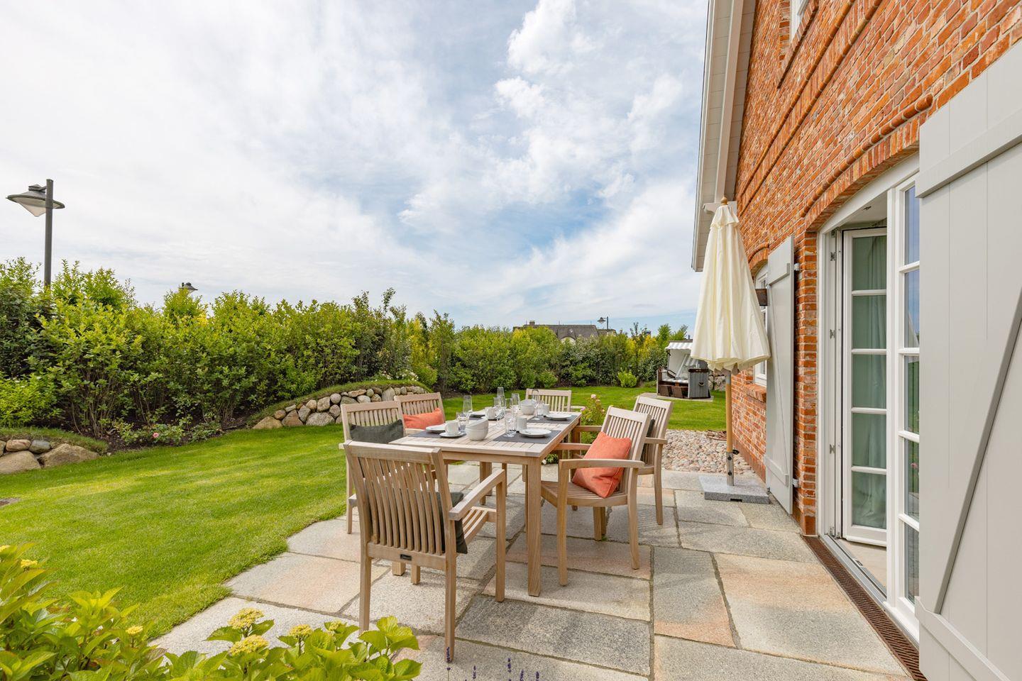 Zum Haus gehört ein großer Garten mit Terrasse und Gartenmöbeln.