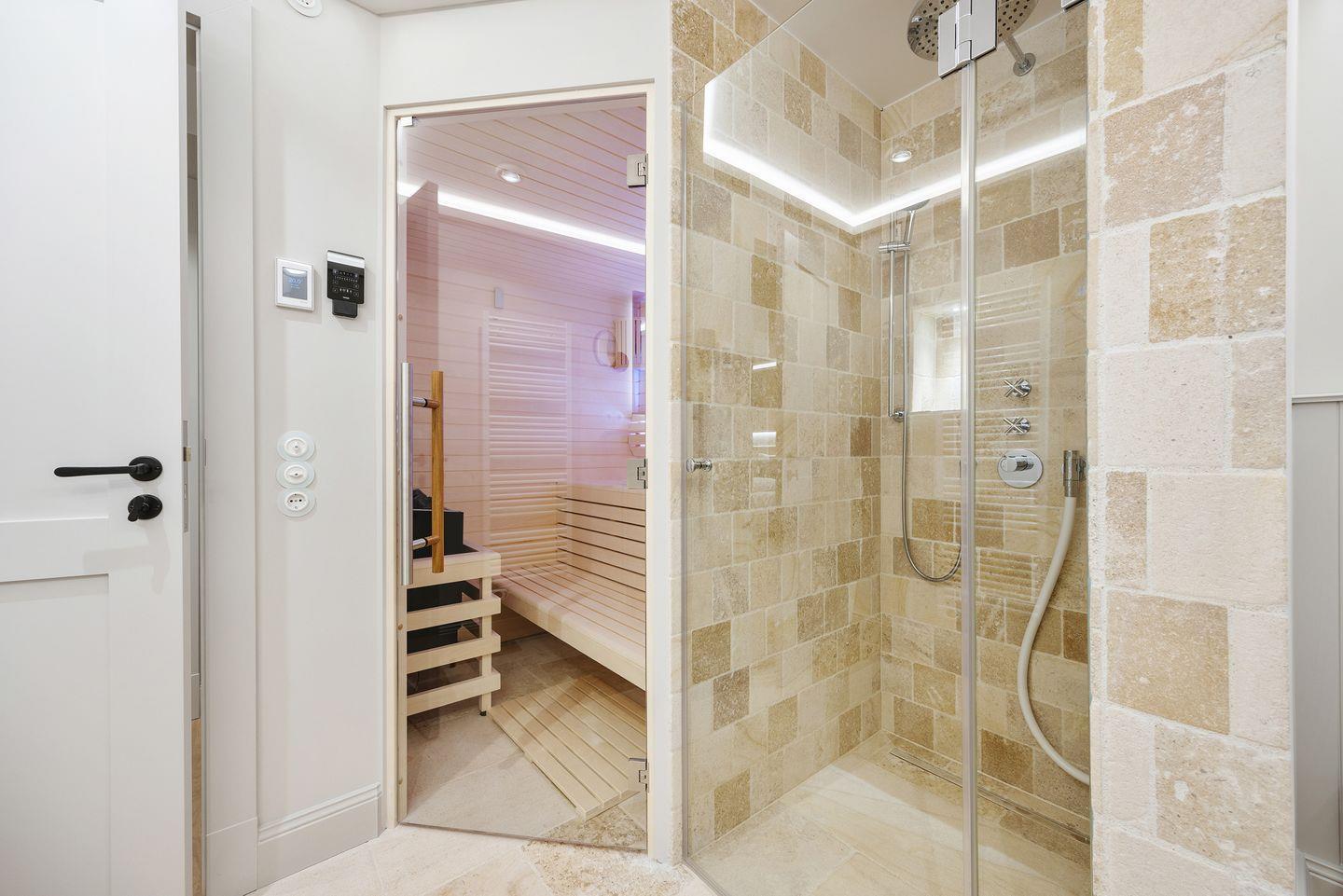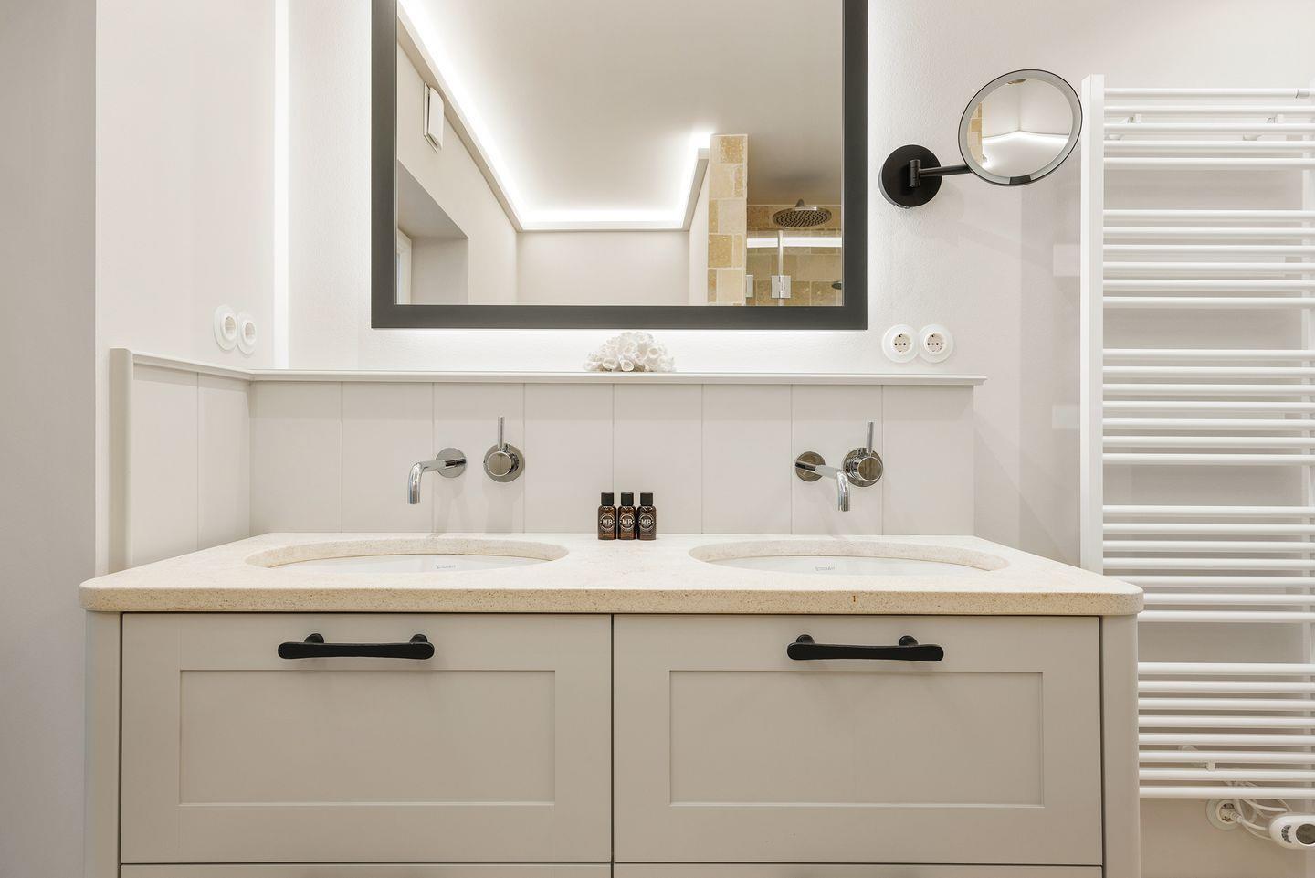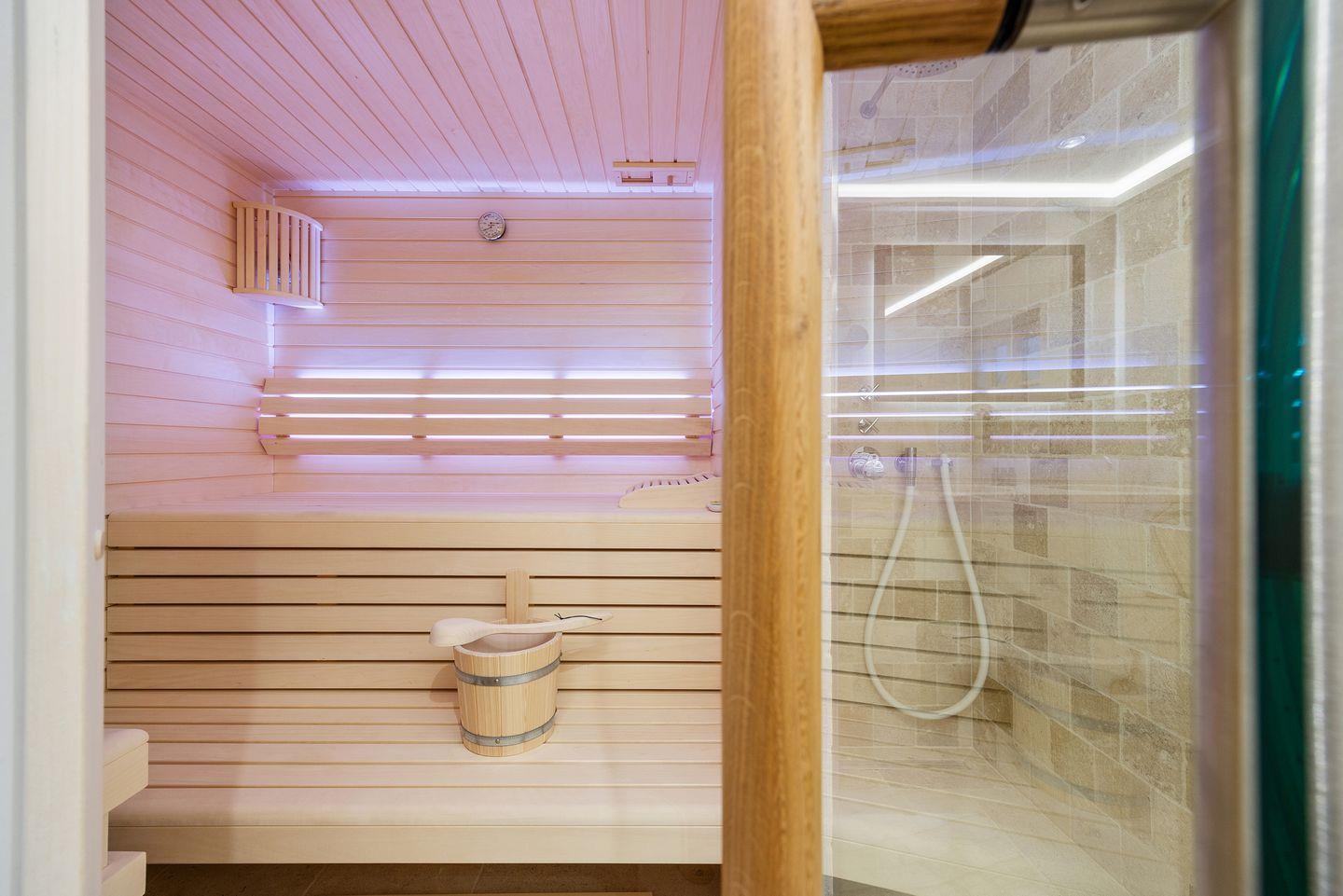Das Haus bietet zwei moderne Badezimmer. Das erste Badezimmer verfügt über eine bodengleiche Dusche, Tageslicht und einen Föhn. Das zweite, luxuriöse Wellnessbad lädt mit einer Sauna, einer Badewanne und einer bodengleichen Dusche zur Entspannung ein – perfekt, um nach einem Tag auf der Insel zu relaxen. Ein Gäste-WC sorgt für zusätzlichen Komfort.
