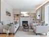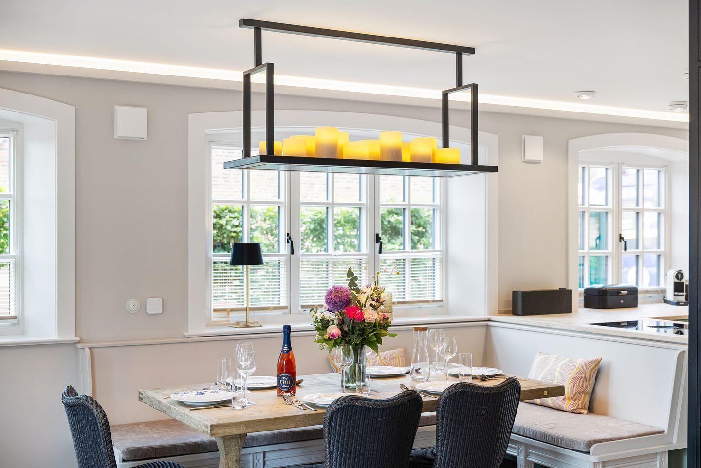 Das lichtdurchflutete Wohnzimmer mit einem gemütlichen Gaskamin schafft eine einladende Atmosphäre, in der Sie entspannte Stunden verbringen können. Die stilvolle Einrichtung, mit zeitlosen Möbeln und eleganten Details wie einer Authentage Lampe, sorgt für eine harmonische Kombination aus Luxus und Gemütlichkeit. Große Fenster bieten einen herrlichen Blick auf die umliegende Landschaft und führen direkt zum Freisitz, wo Sie die Sonne und frische Nordseeluft genießen können.