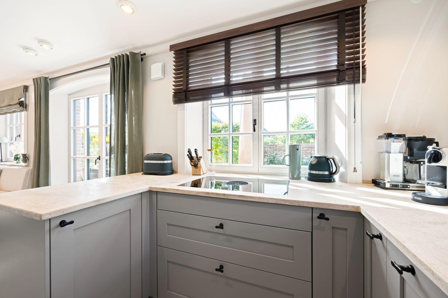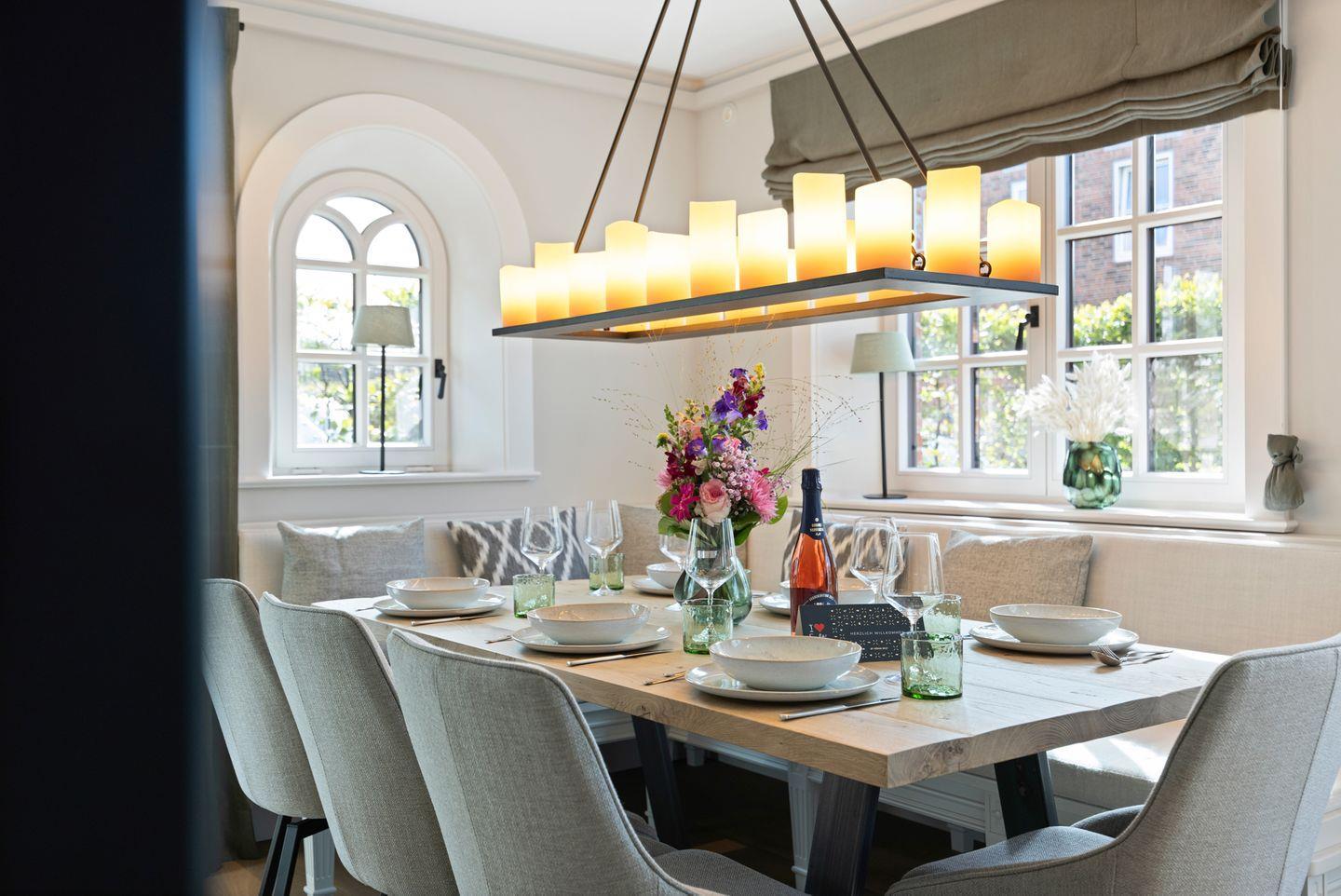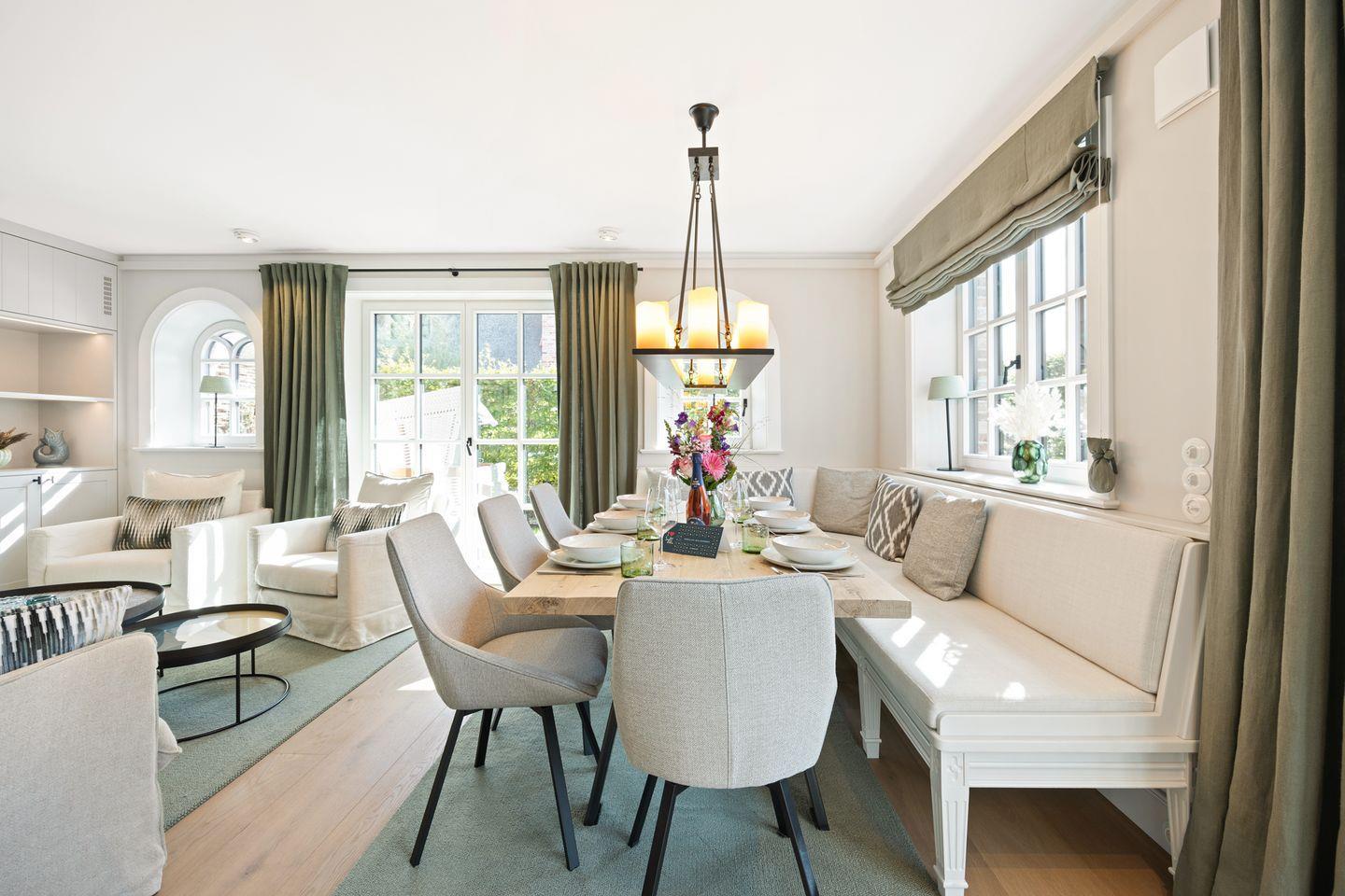 Die offene Küche, integriert in den Wohnbereich, ist mit hochwertigen Miele-Einbaugeräten und einem modernen BORA Kochfeld ausgestattet. Neben einem Dampfgarer finden Sie auch eine Moccamaster Kaffeemaschine – perfekt für den Start in den Tag. Der Esstisch bietet Platz für bis zu 6 Personen, sodass gemeinsame Mahlzeiten in entspannter Atmosphäre genossen werden können.