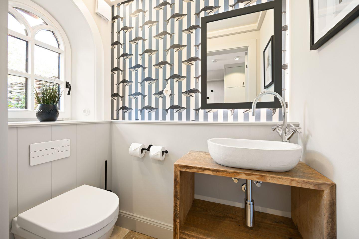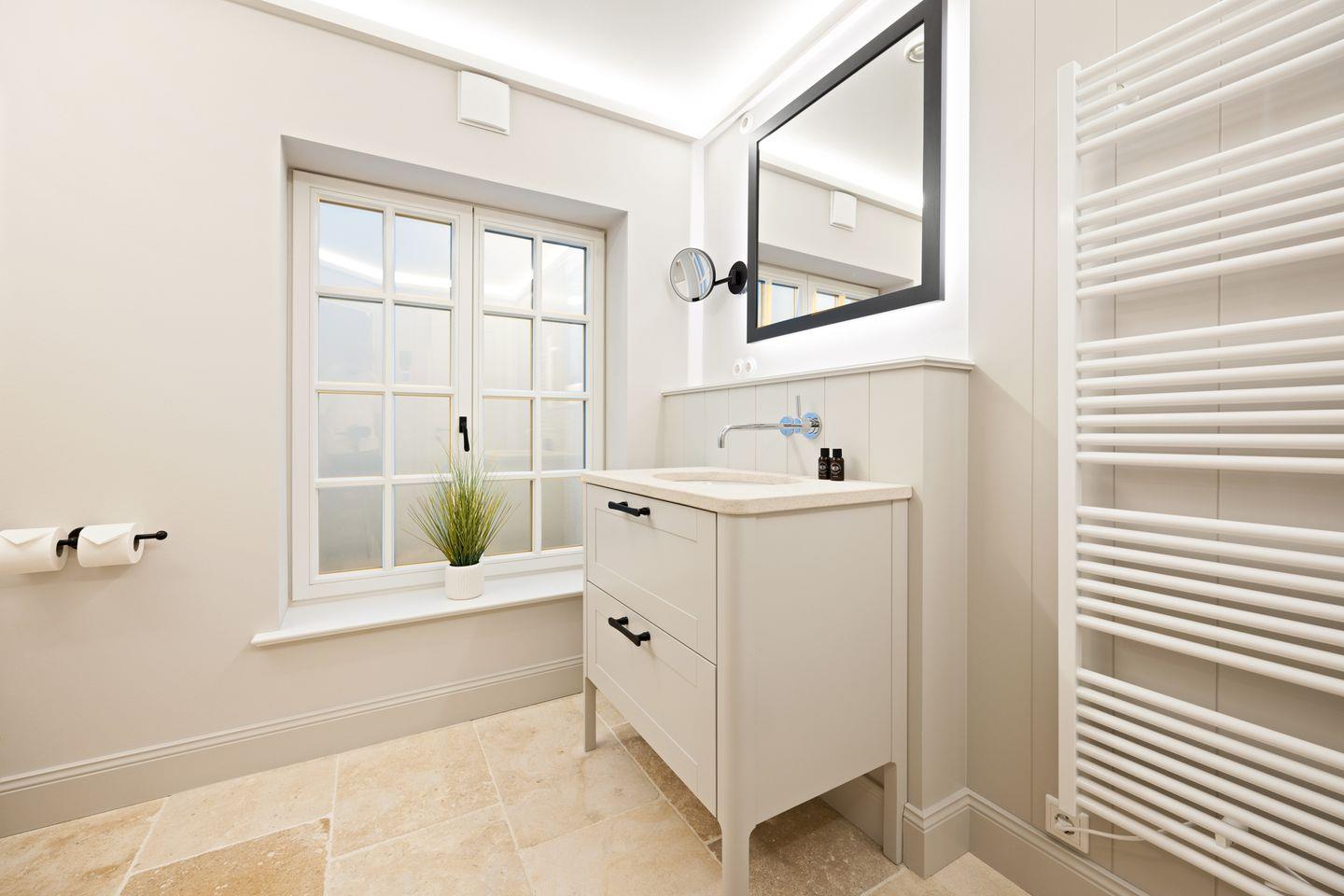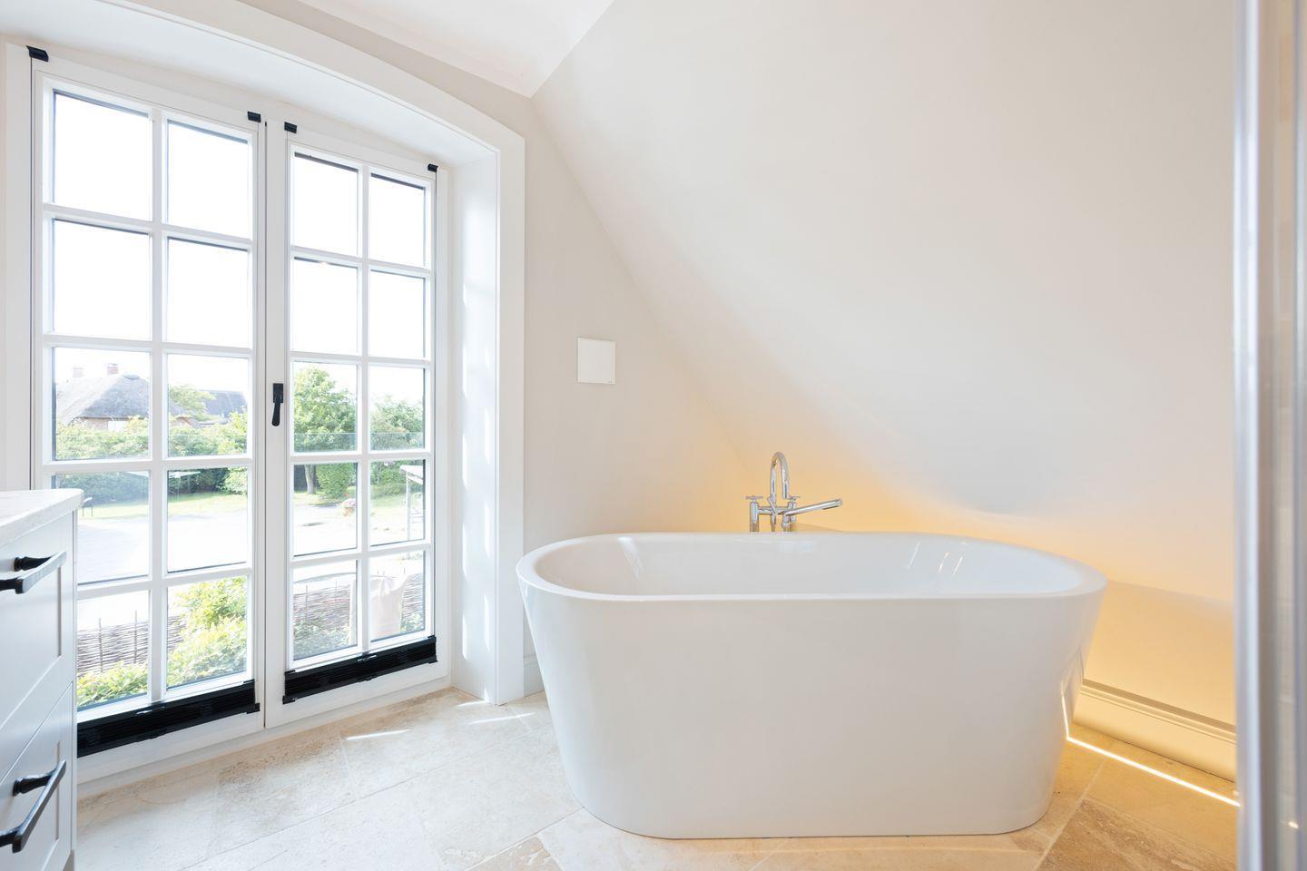 Das Haus verfügt über zwei moderne Badezimmer. Das erste Badezimmer ist mit einer bodengleichen Dusche, Tageslicht und einem Föhn ausgestattet. Das zweite, luxuriöse Wellnessbad bietet eine freistehende Badewanne, eine bodengleiche Dusche und eine Sauna – perfekt für erholsame Momente nach einem langen Tag auf der Insel. Ein zusätzliches Gäste-WC im Erdgeschoss sorgt für weiteren Komfort.