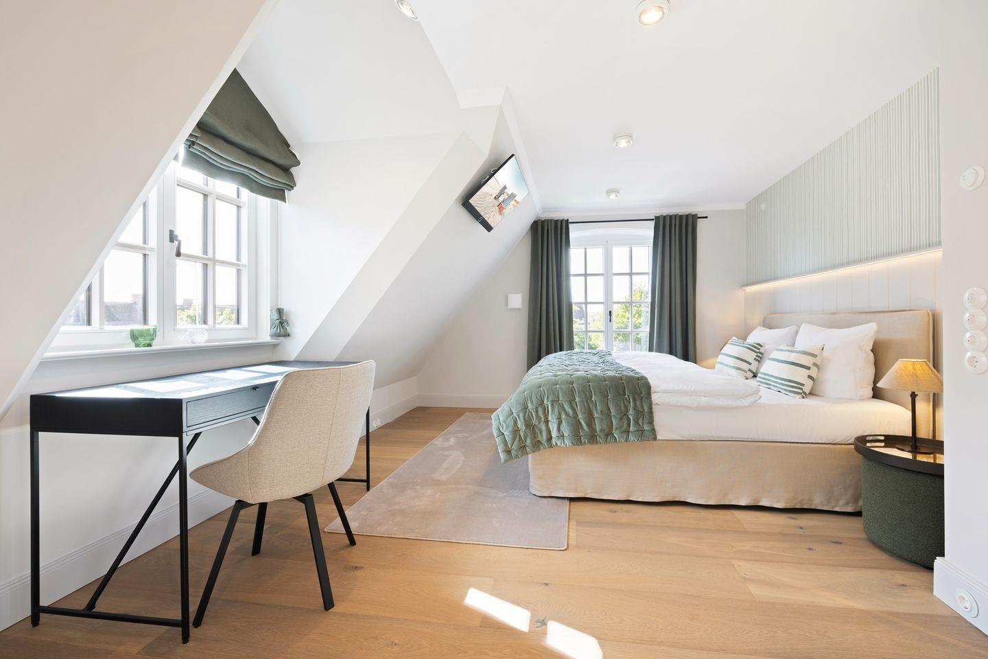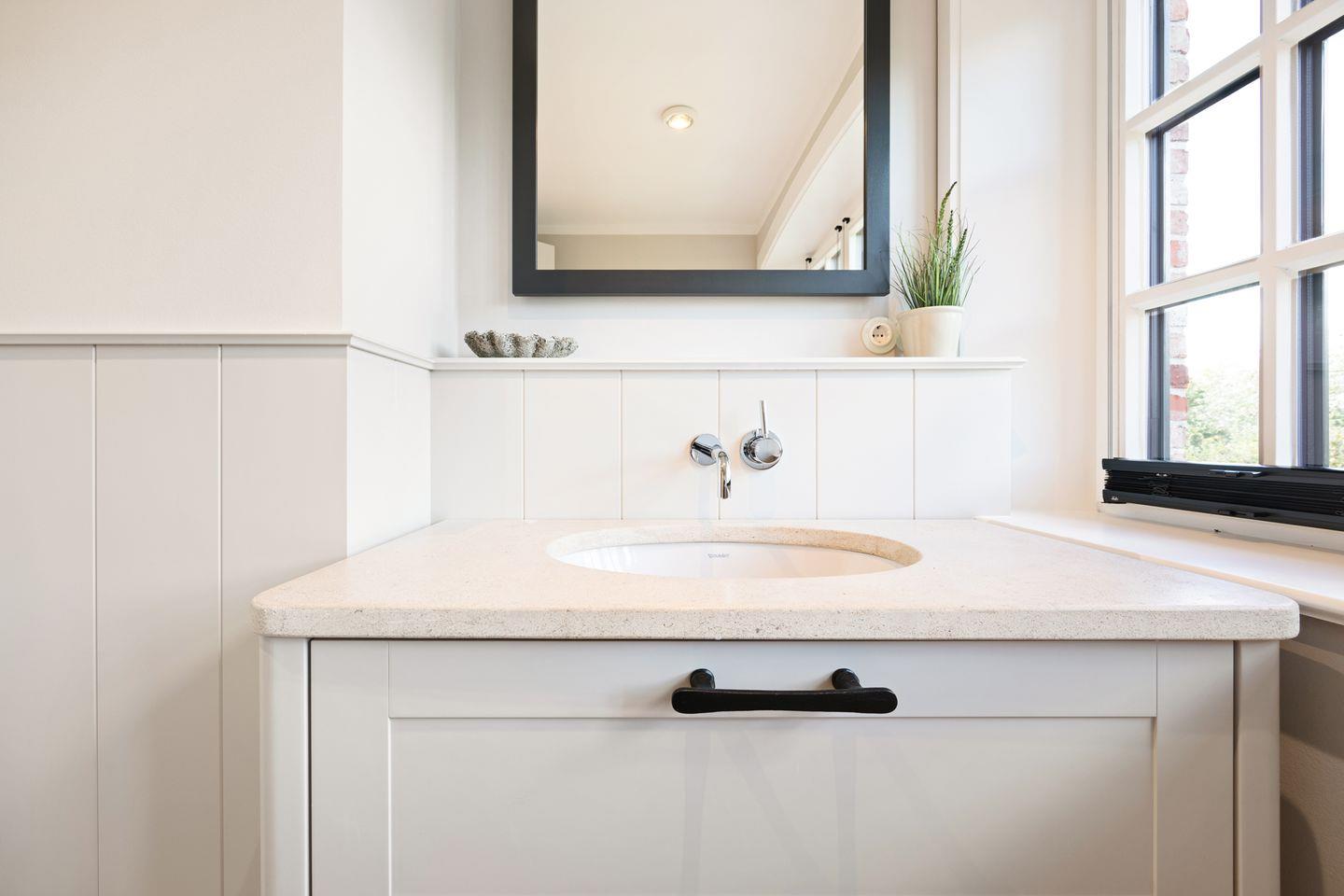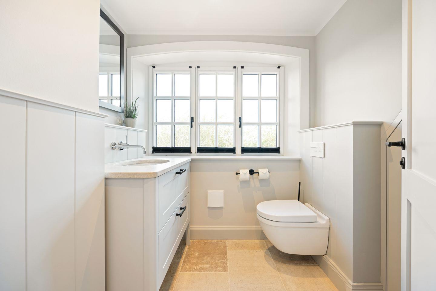 Das Haus verfügt über zwei moderne Badezimmer. Das erste Badezimmer ist mit einer bodengleichen Dusche, Tageslicht und einem Föhn ausgestattet. Das zweite, luxuriöse Wellnessbad bietet eine freistehende Badewanne, eine bodengleiche Dusche und eine Sauna – perfekt für erholsame Momente nach einem langen Tag auf der Insel. Ein zusätzliches Gäste-WC im Erdgeschoss sorgt für weiteren Komfort.