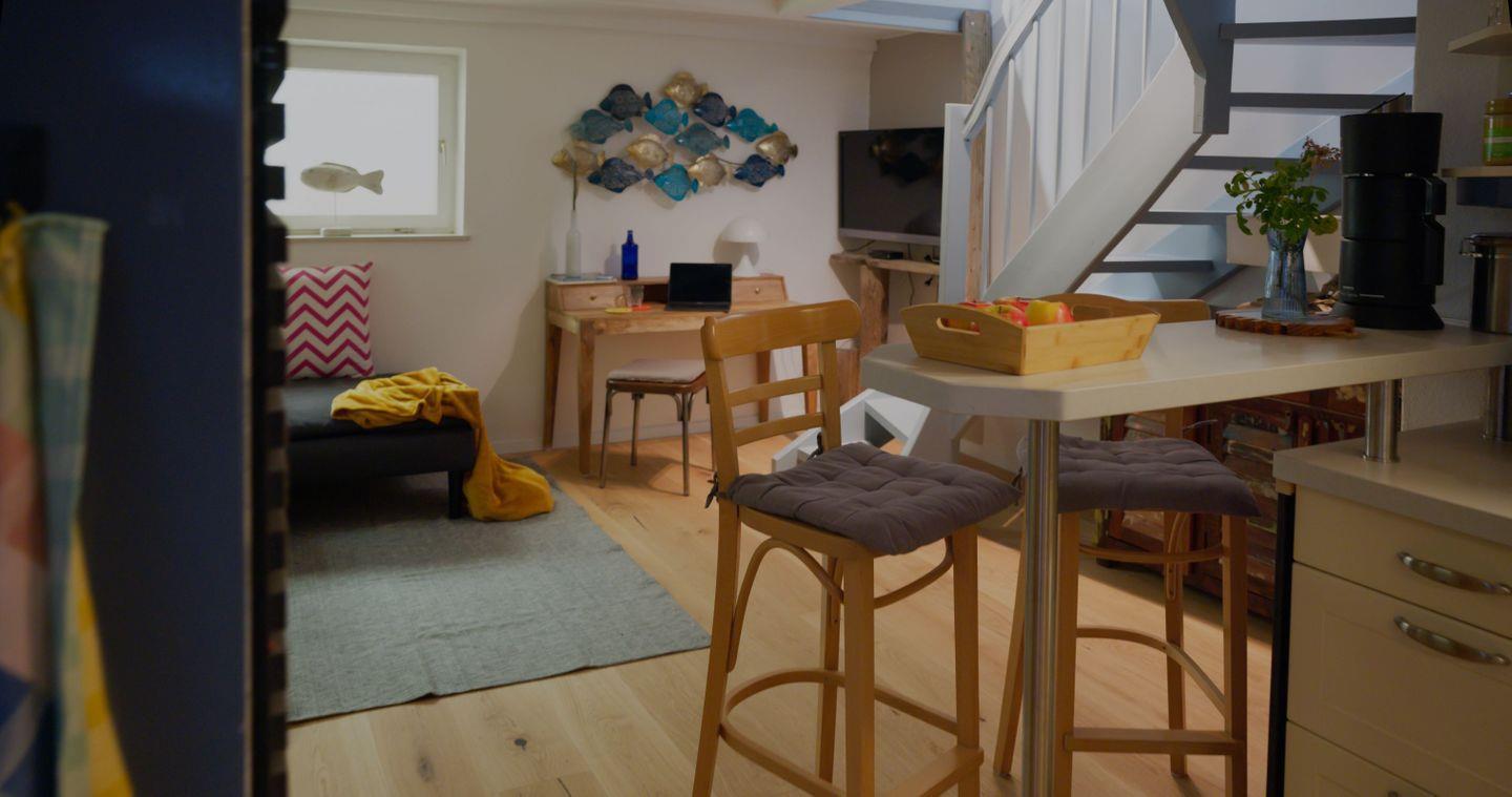 Das Appartement auf 2 Ebenen bietet ein separates Schlafzimmer sowie eine gemütliche Schlafcouch im Wohnzimmer.