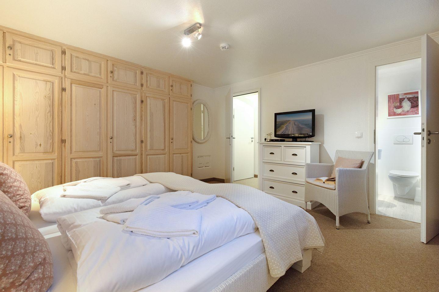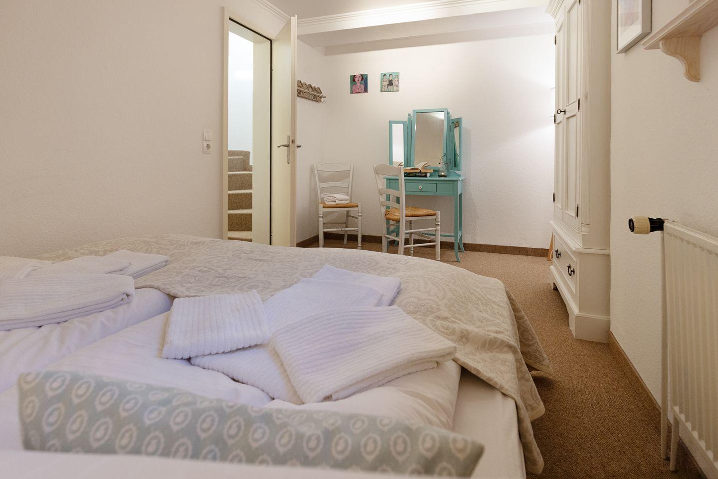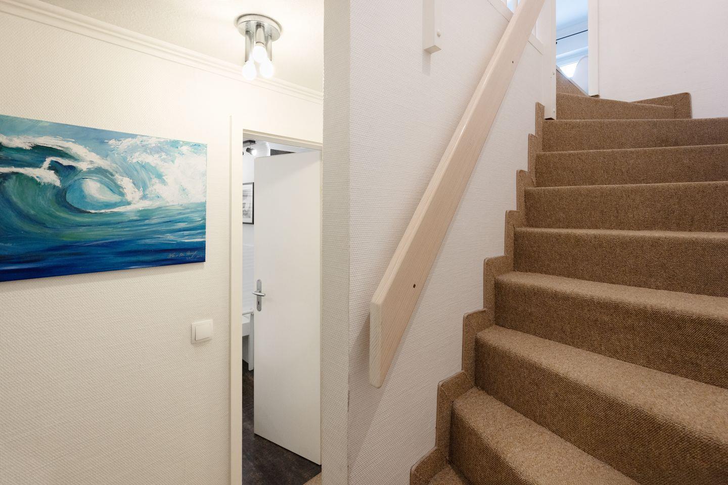 Auf der mit Gartenmöbeln ausgestatteten Terrasse finden Sie auch einen Strandkorb. Der hübsch gestaltete Flur führt nach unten, wo Sie zwei weitere Schlafzimmer finden, die jeweils mit Doppelbetten ausgestattet sind. Auch das Badezimmer und ein zusätzliches Gäste-WC finden Sie in dieser Ebene.
