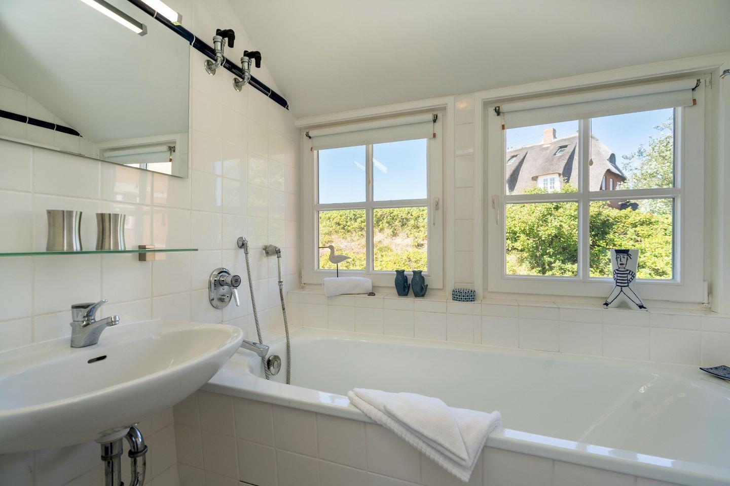 Strandhütte unter Reet. Diese freistehende Traumhaus an der Lister Wasserkante bietet Platz für bis zu 4 Personen und besticht nicht nur durch seinen einzigartigen Meerblick, sondern auch durch seine ausgefallene Inneneinrichtung. Der lichtdurchflutete Wohnbereich mit offener Küche bietet viel Platz zum gemeinsamen Kochen, Essen und Verweilen. Auf der angrenzenden Terrasse samt Gartenmöbeln und Strandkorb lassen sich viele Sonnenstunden verbringen. An kalten Tagen sorgt der Kaminofen im Wohnbereich für warme Temperaturen. Sowohl im Erdgeschoss als auch im Obergeschoss finden Sie ein Badezimmer - eins mit Dusche, eins mit Badewanne. Ansonsten befindet sich ein Doppelschlafzimmer sowie ein Schlafzimmer mit zwei Einzelbetten im Obergeschoss. Die Einbauschränke dort bieten genügend Stauraum für einen Sylturlaub. Auf dem naturbelassenen Grundstück befindet sich in einem separaten Raum die eigene Sauna. WLAN und zugehörige PKW-Stellplätze sind vorhanden. In der Garage stehen Ihnen eine Waschmaschine sowie ein Wäschetrockner zur Verfügung. Diese bietet auch genügend Abstellmöglichkeit für Fahrräder. Haustiere sind willkommen.