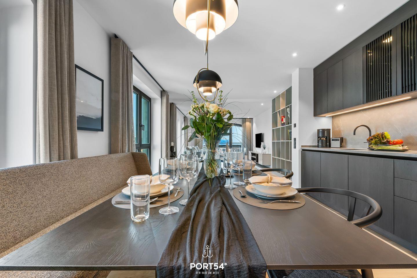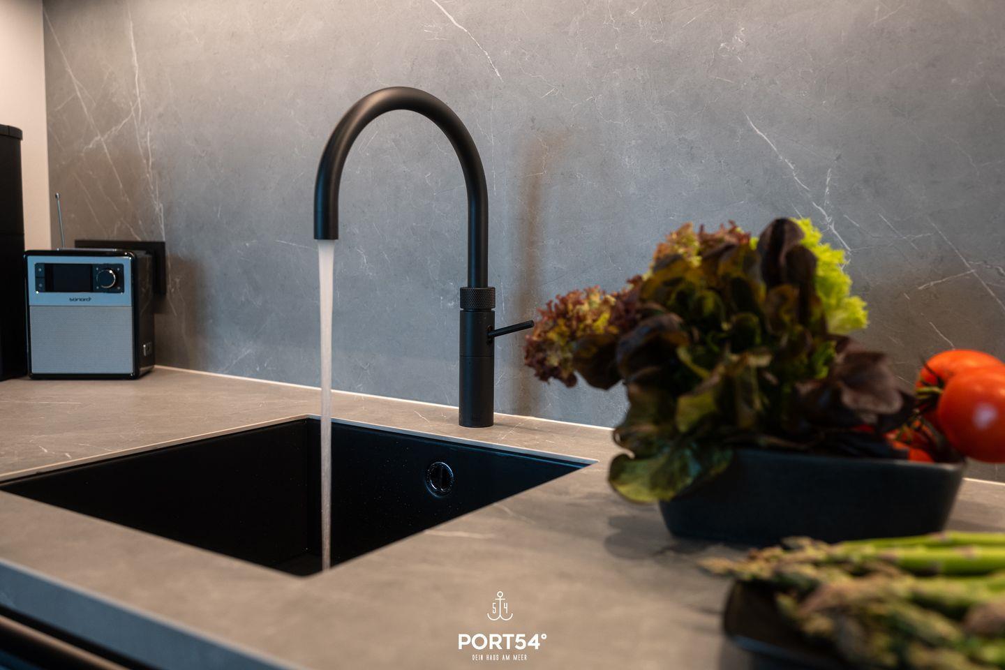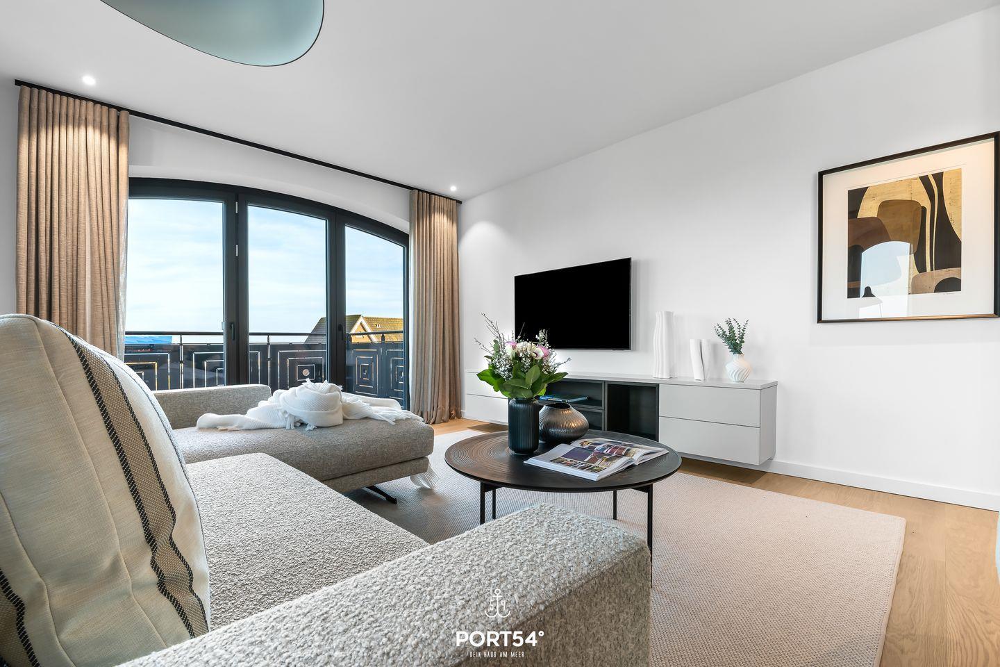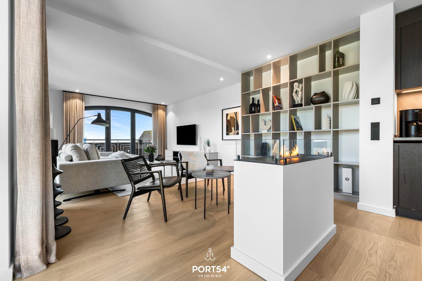 Der Wohnbereich ist ideal, um nach einem erlebnisreichen Tag zu entspannen. Ein gemütliches Sofa, ausgestattet mit einem offenen Ethanol Kamin, lädt dazu ein, es sich mit einem guten Buch oder einem Film gemütlich zu machen. Von hier aus haben Sie direkten Zugang zu Ihrem eigenen Balkon, wo Sie den Blick auf die umliegende Landschaft oder einen romantischen Sonnenuntergang genießen können. Gartenmöbel stehen Ihnen zur Verfügung, sodass Sie im Freien verweilen und die frische Nordseeluft genießen können.
