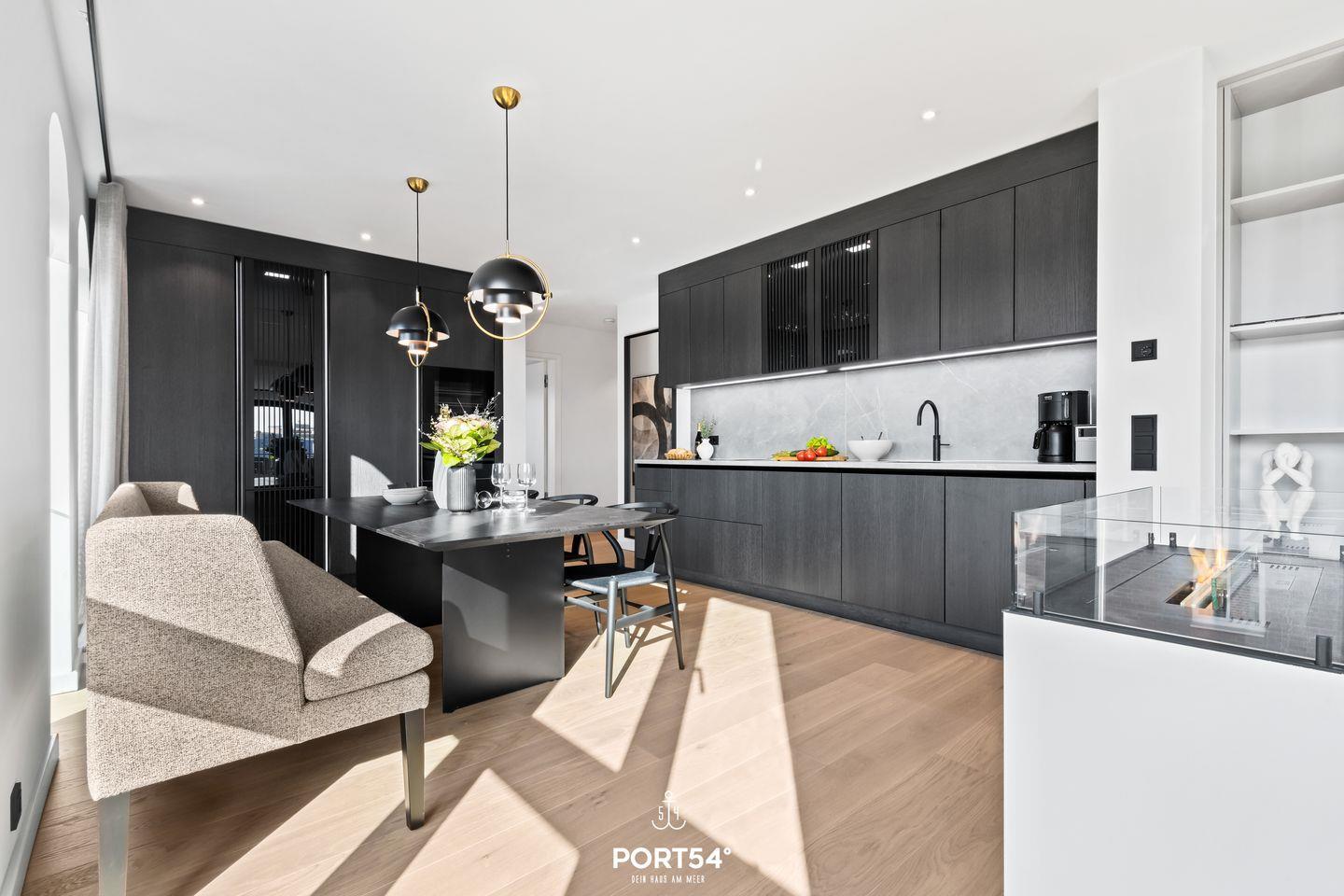 Der Wohnbereich ist ideal, um nach einem erlebnisreichen Tag zu entspannen. Ein gemütliches Sofa, ausgestattet mit einem offenen Ethanol Kamin, lädt dazu ein, es sich mit einem guten Buch oder einem Film gemütlich zu machen. Von hier aus haben Sie direkten Zugang zu Ihrem eigenen Balkon, wo Sie den Blick auf die umliegende Landschaft oder einen romantischen Sonnenuntergang genießen können. Gartenmöbel stehen Ihnen zur Verfügung, sodass Sie im Freien verweilen und die frische Nordseeluft genießen können.