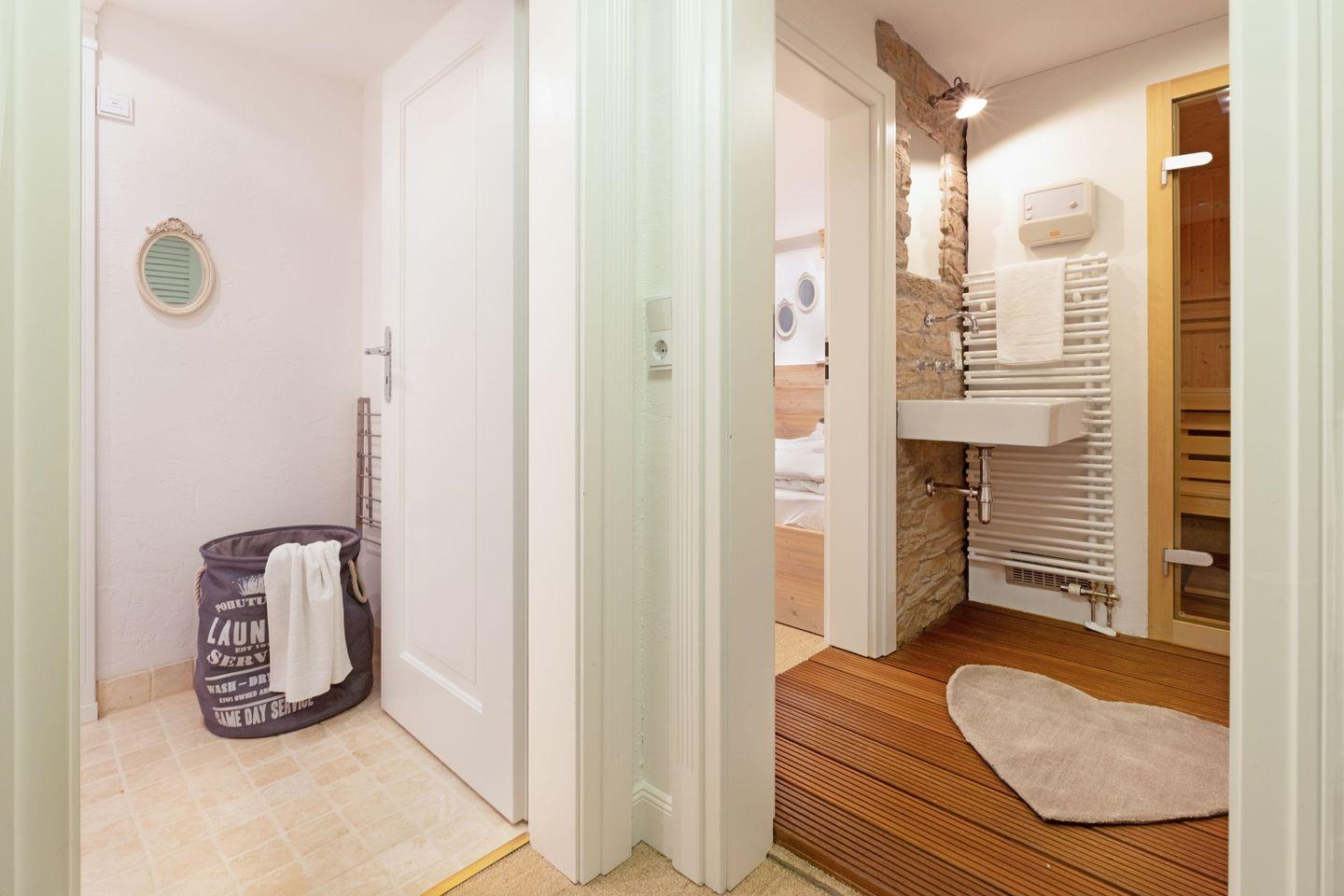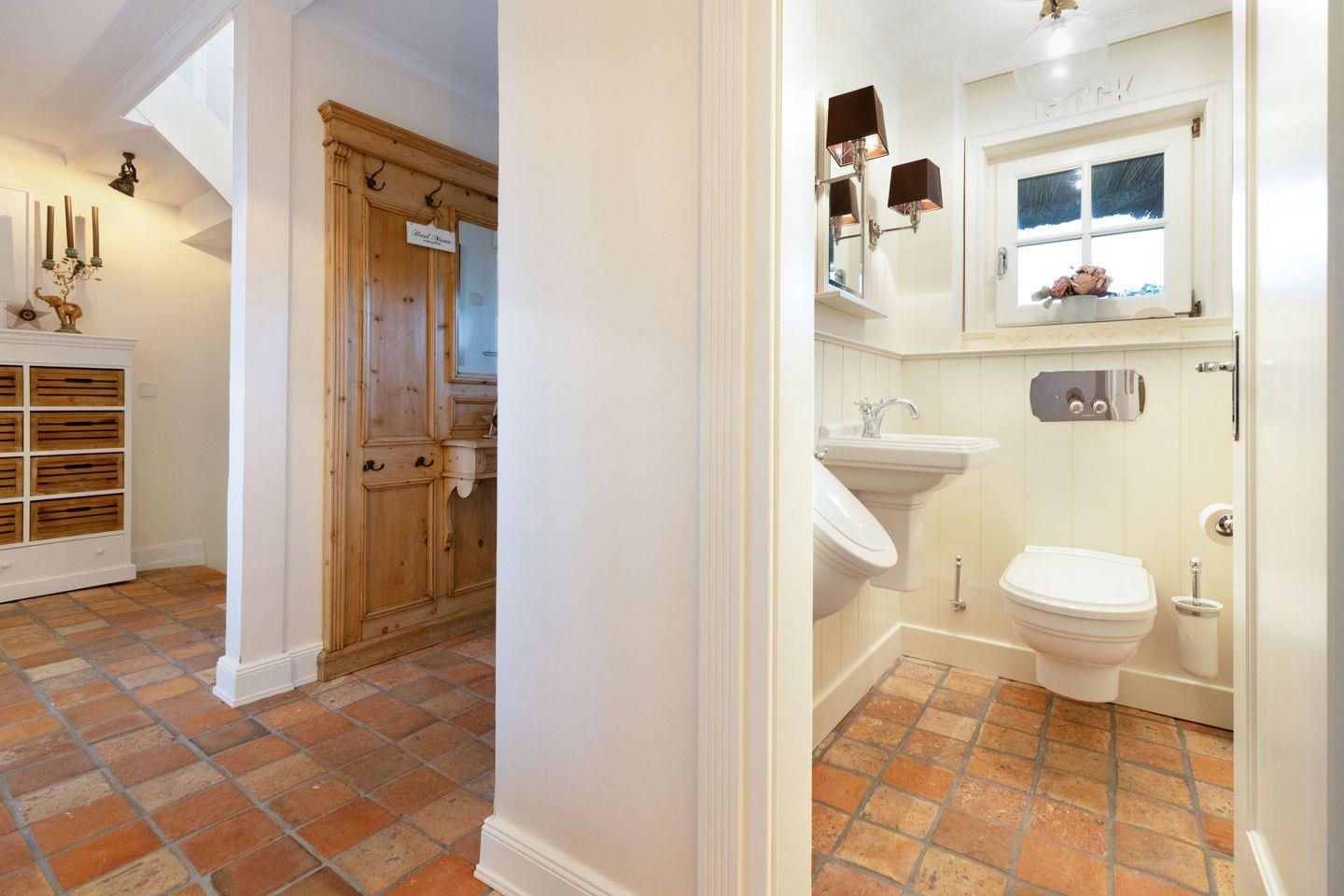 Es gibt zwei moderne Badezimmer, ausgestattet mit einer Dusche und einer Badewanne und zusätzlich steht ein Gäste-WC zur Verfügung.