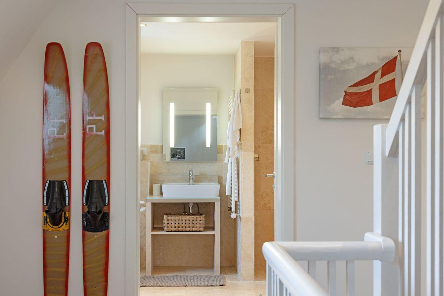 drei moderne, geräumige Bäder – zwei davon jeweils mit Dusche und Badewanne –