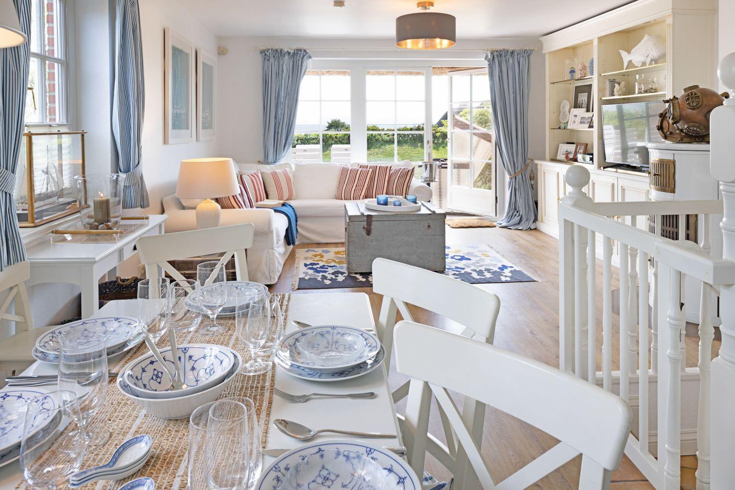 Exklusives familienfreundliches Ferienreihenhaus unter Reet mit Sauna für bis zu sieben Personen am Lister Oststrand mit Blick über das Meer.