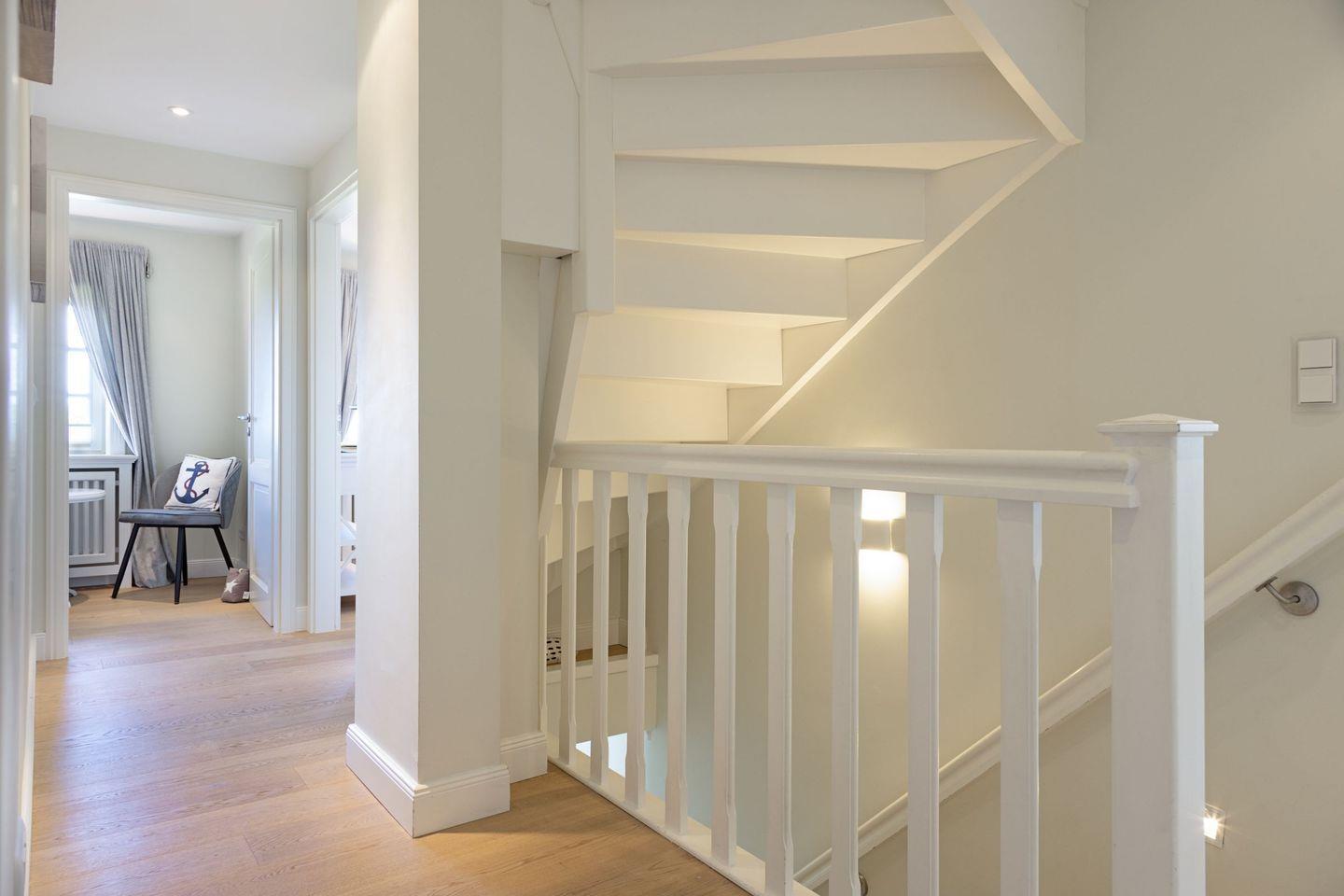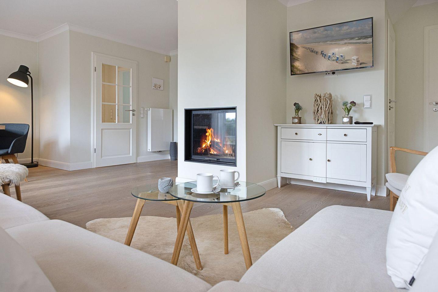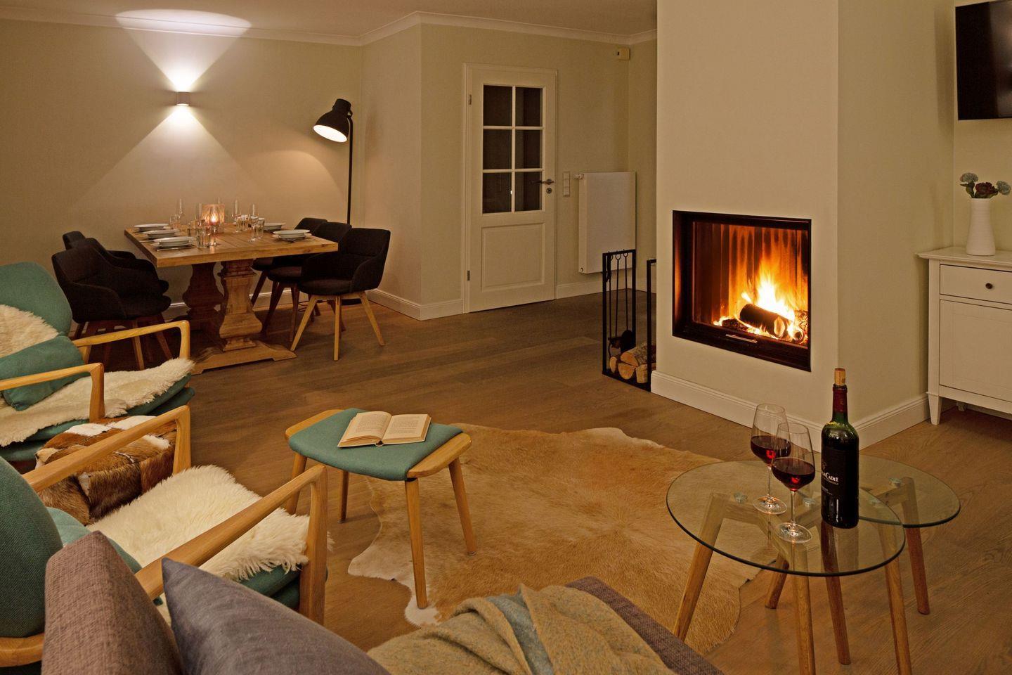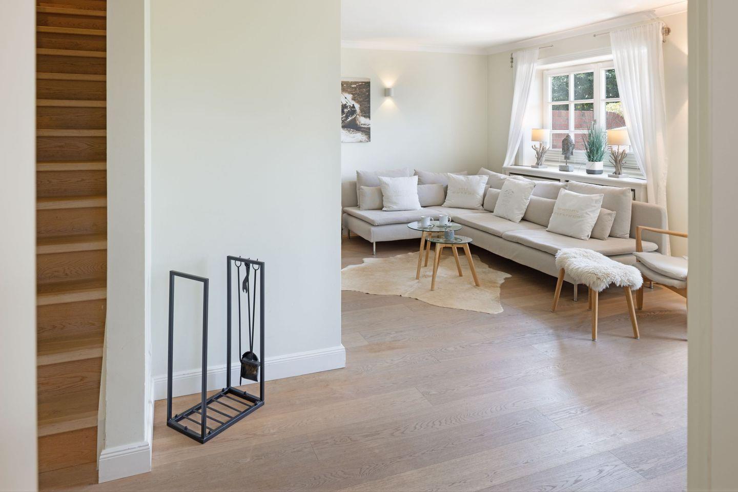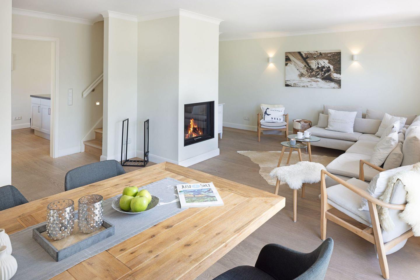 Des weiteren befindet sich im Erdgeschoss eine großzügige Küche mit Essbereich und das separate, gemütliche Wohnzimmer mit Kamin und ein zusätzliches Gäste-WC.