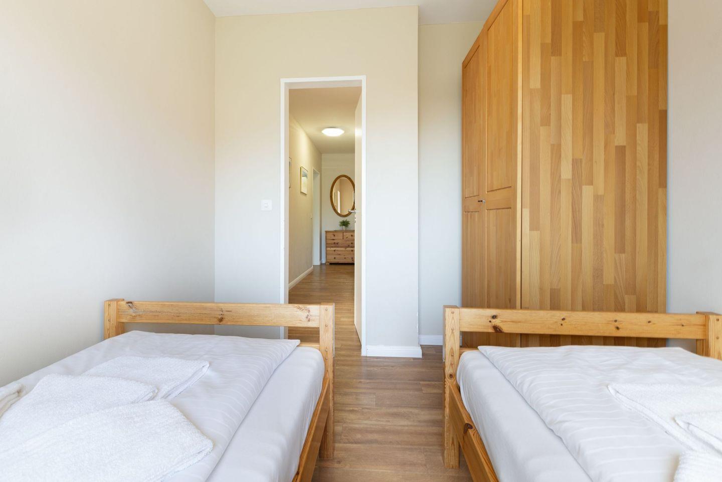 Die 70m² große modern eingerichtete Ferienwohnung hat ein Wohnzimmer, eine separate Küche mit Essplatz und zwei Schlafzimmer. In das Badezimmer gelangen Sie durch das Hauptschlafzimmer.