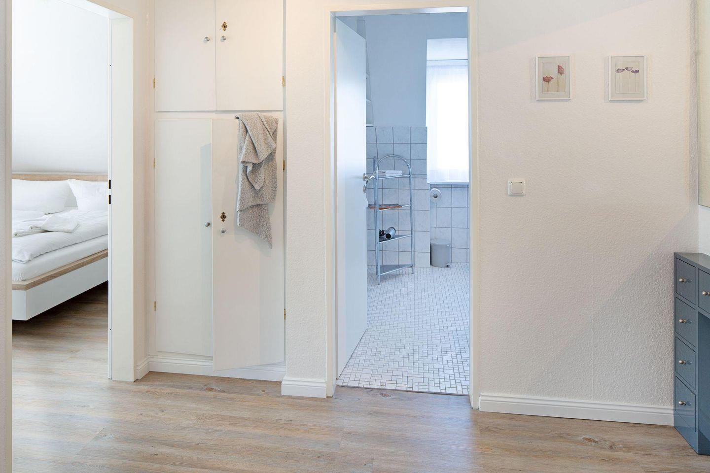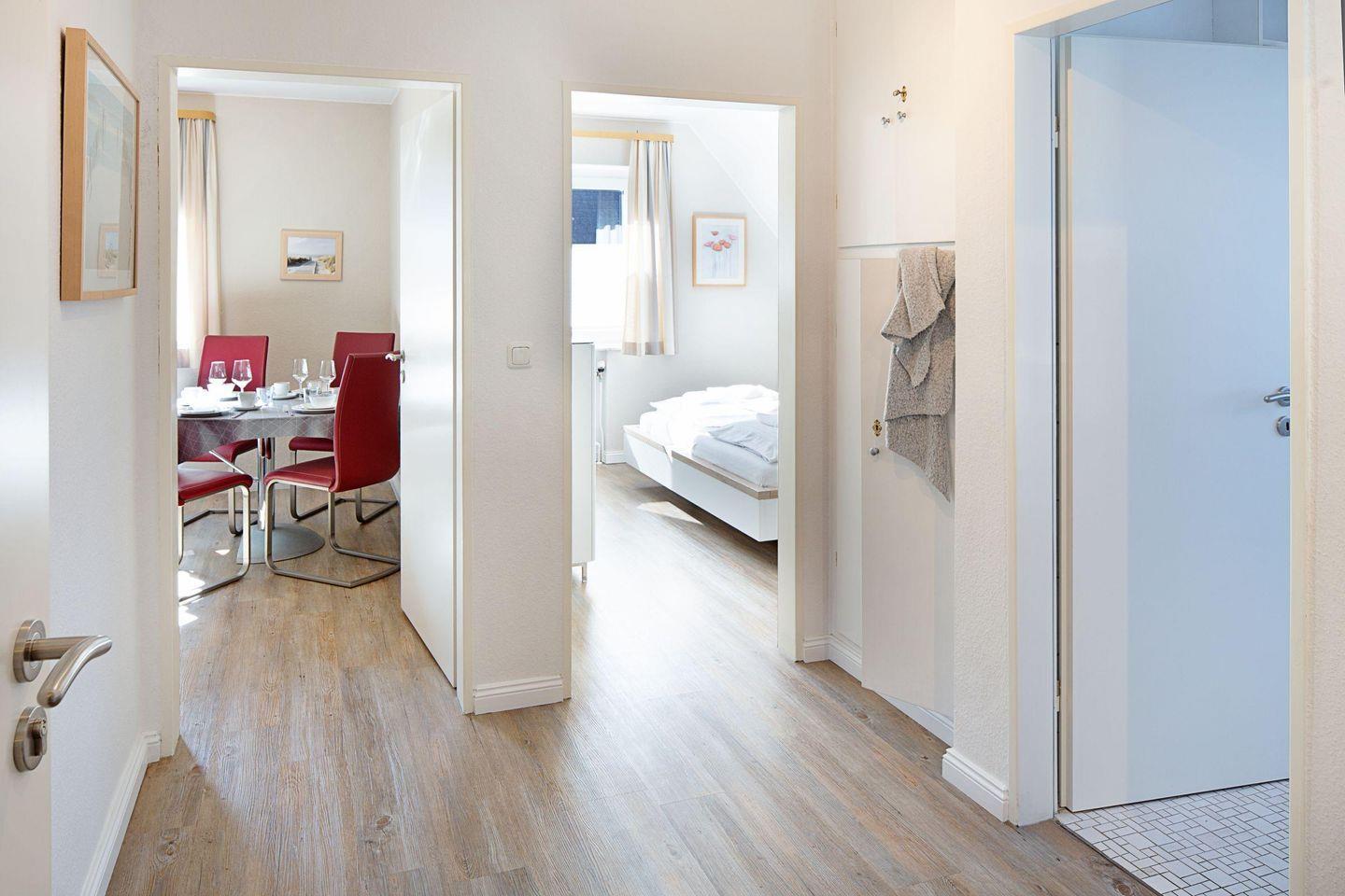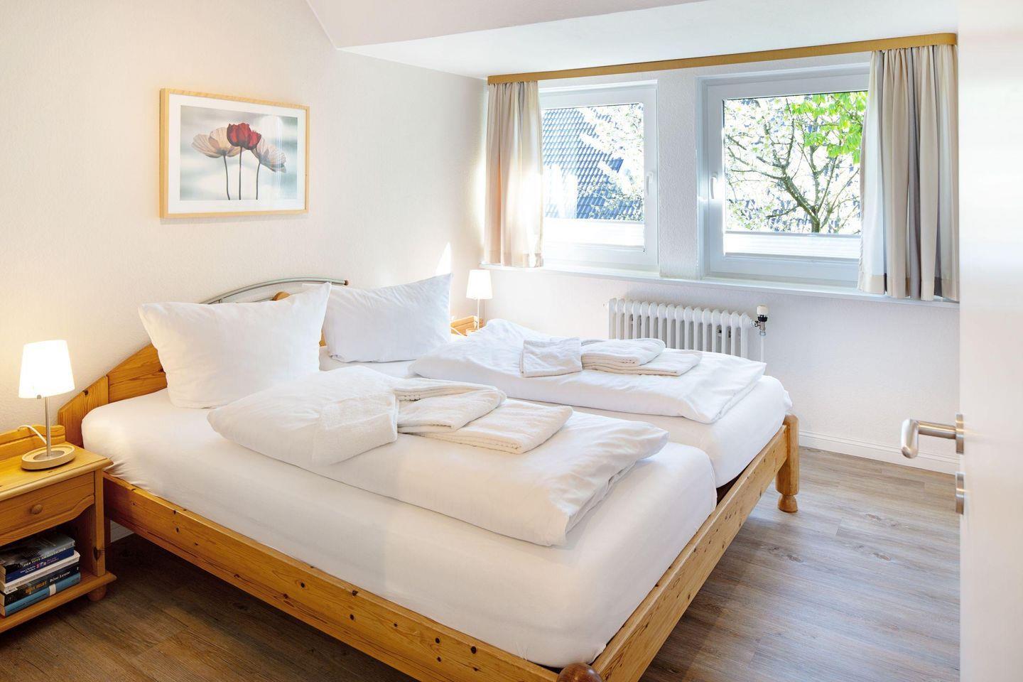 Die 65m² große, modern eingerichtete Ferienwohnung hat ein Wohnzimmer mit offener Küche und Essplatz und zwei separate Schlafzimmer, jeweils mit Doppelbett.