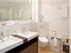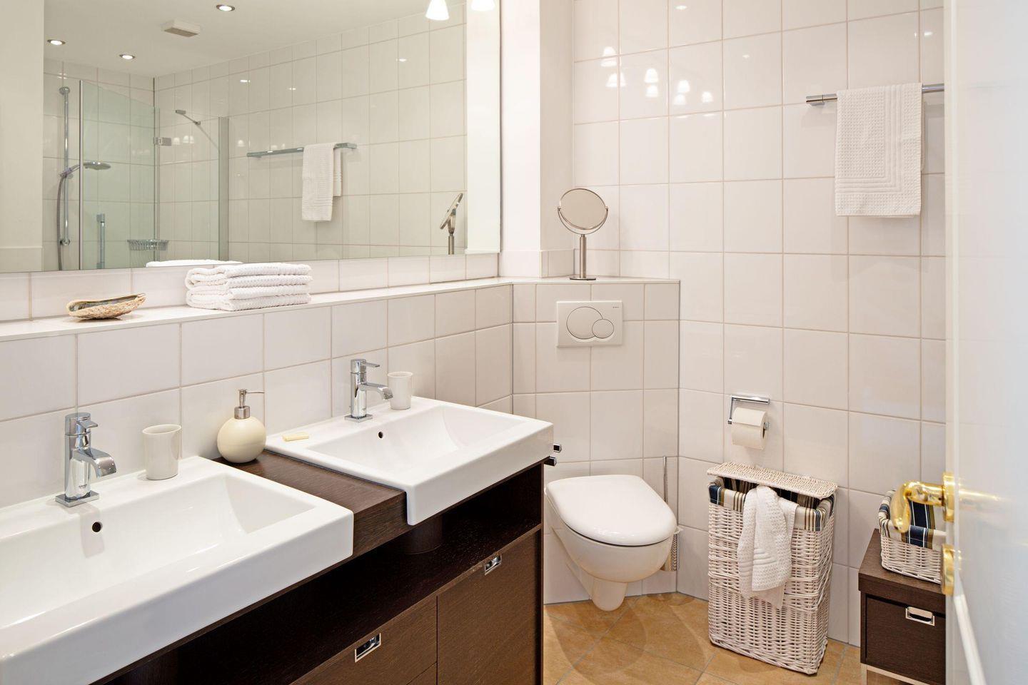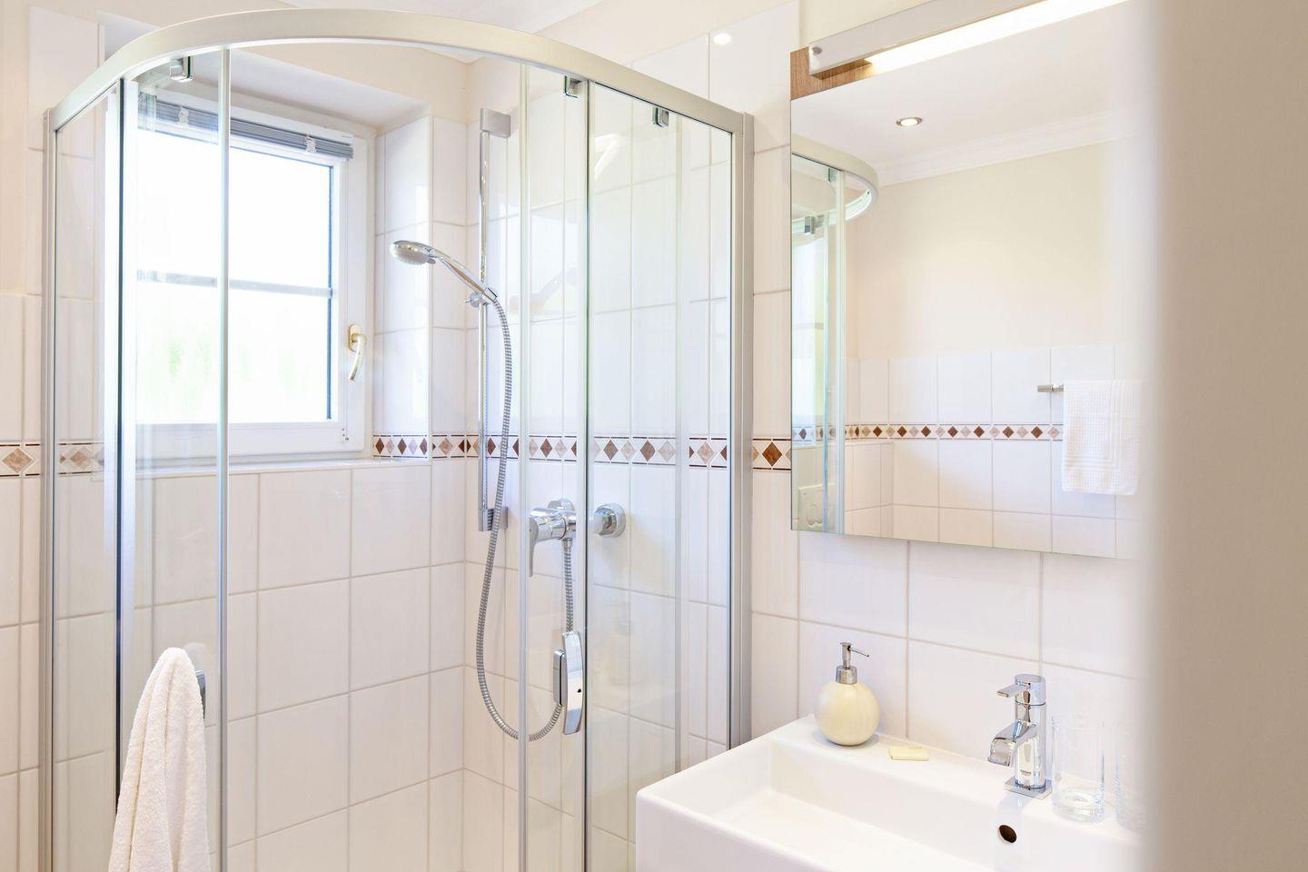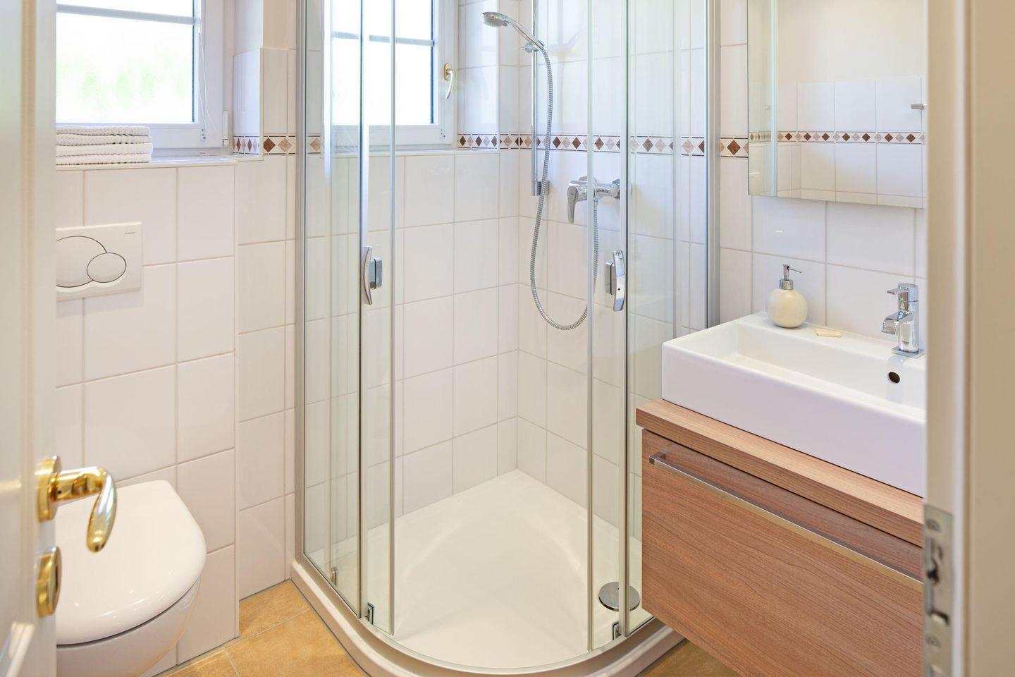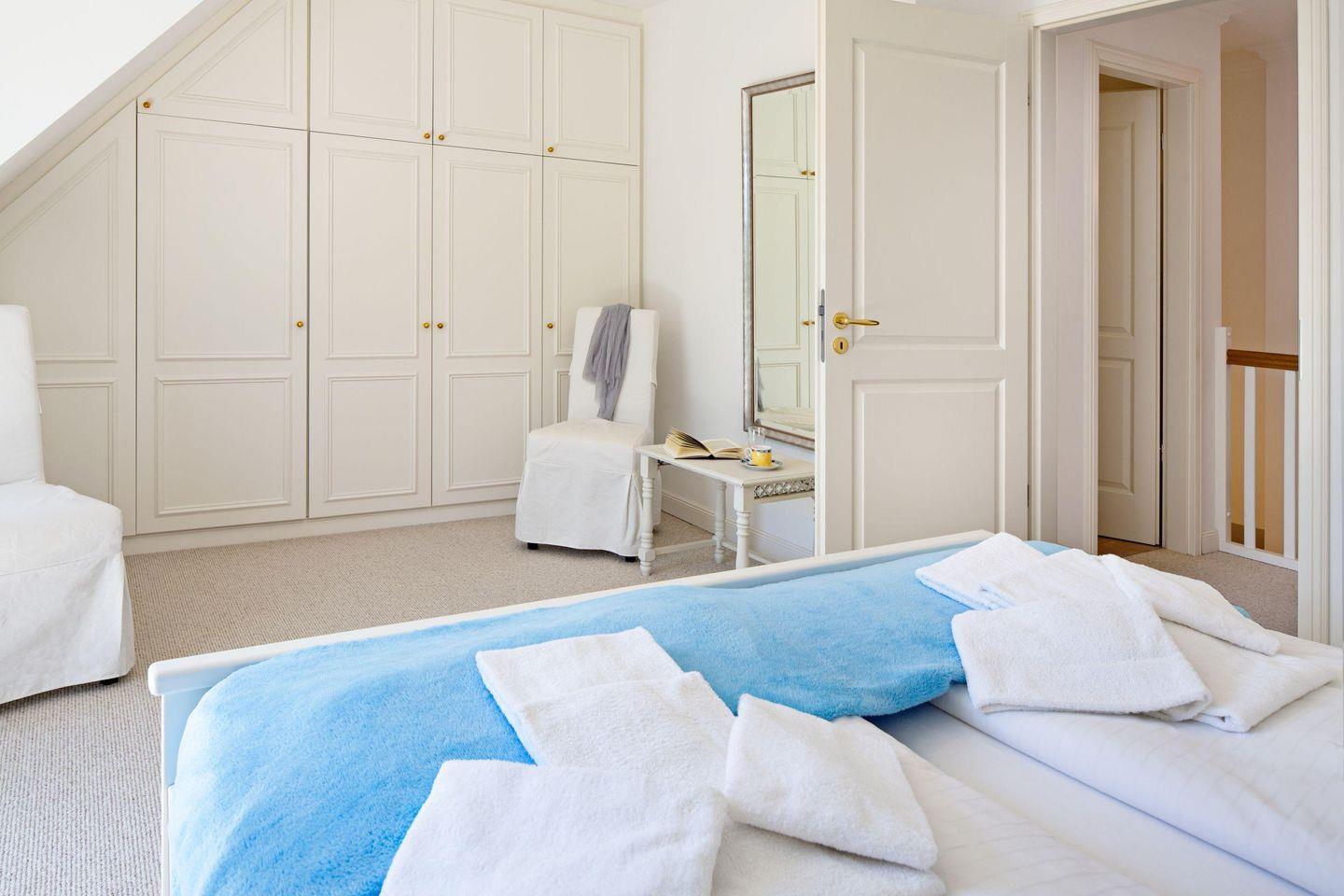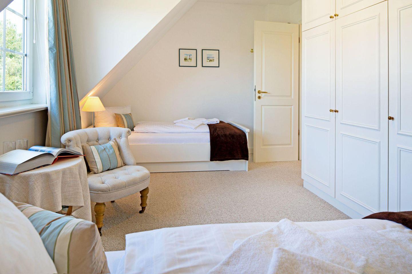 Im Obergeschoss befinden sich das zweite Badezimmer mit Dusche, zwei Schlafzimmer mit Doppelbett und ein Schlafzimmer mit zwei Einzelbetten.