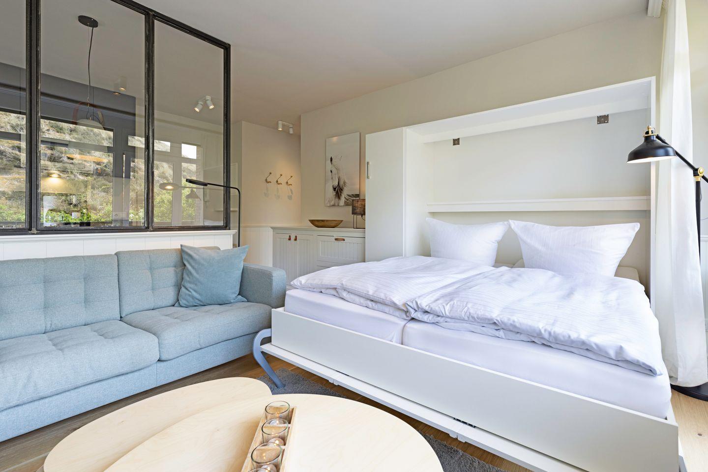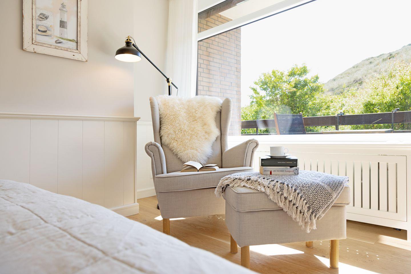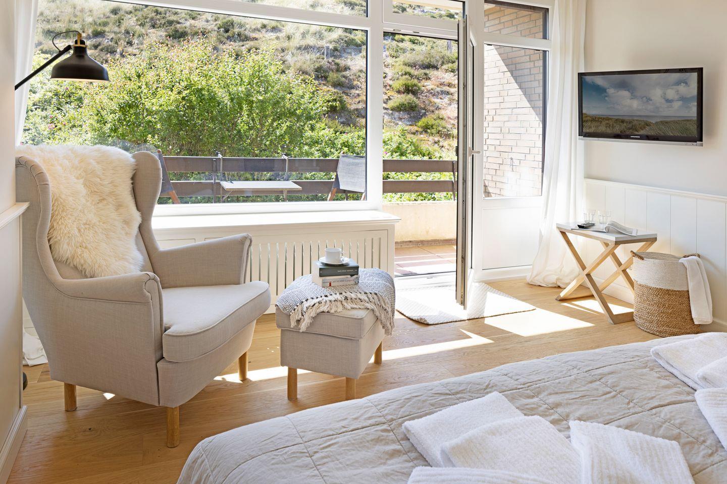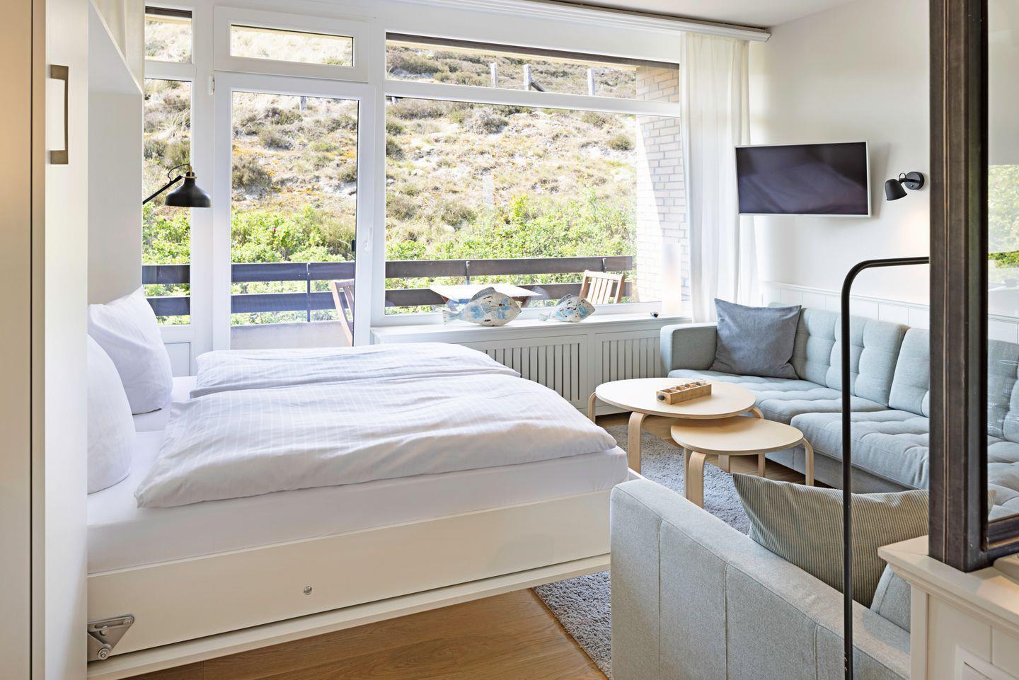 Willkommen in Ihrem Appartement "Heideblick" direkt am Naturschutzgebiet Königshafen. Die im Hochparterre liegende 60m² große Ferienwohnung für bis zu 4 Personen hat ein separates Schlafzimmer mit Doppelbett und ein im Wohnzimmer befindliches Doppel-Schrankbett. Vom Wohnzimmer kommen Sie auf den Balkon mit Blick auf die Dünen.
