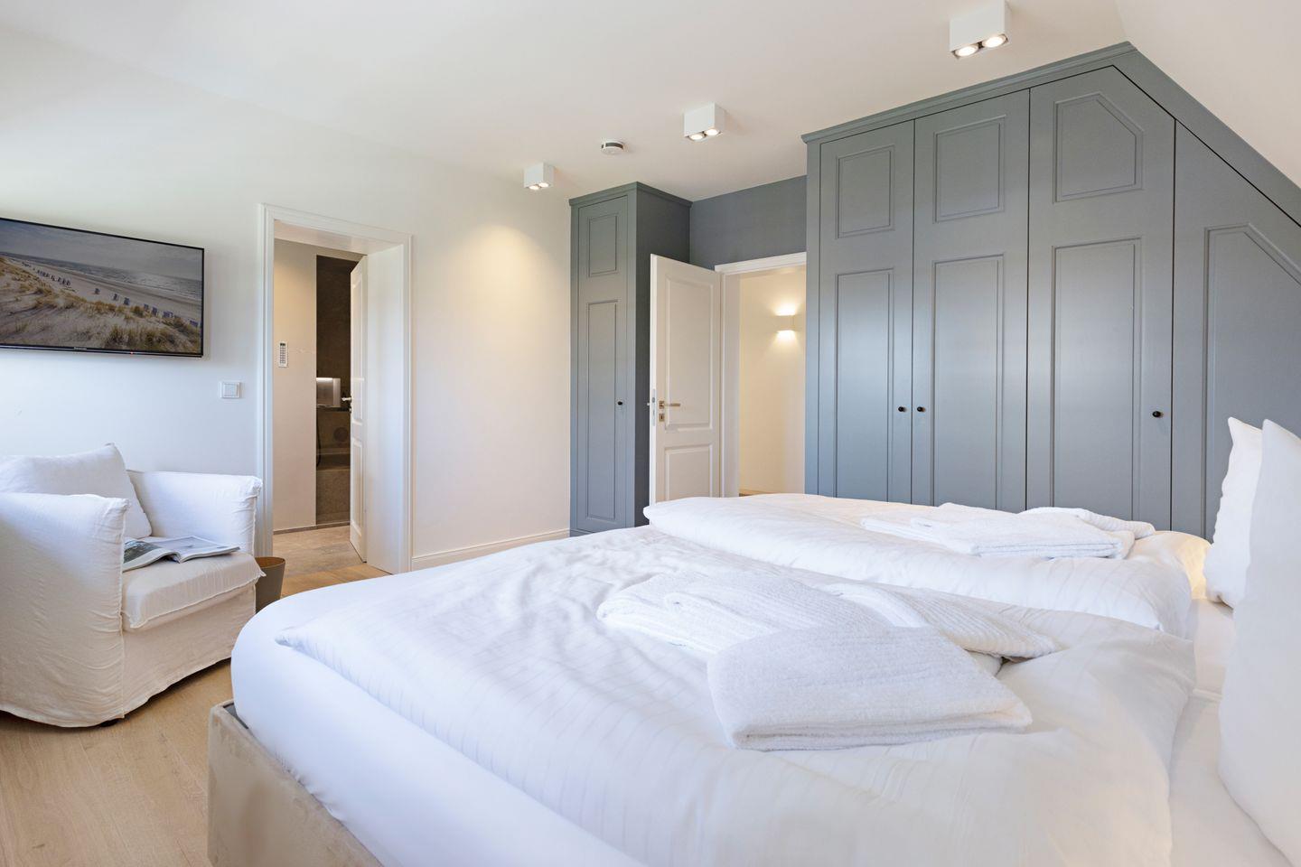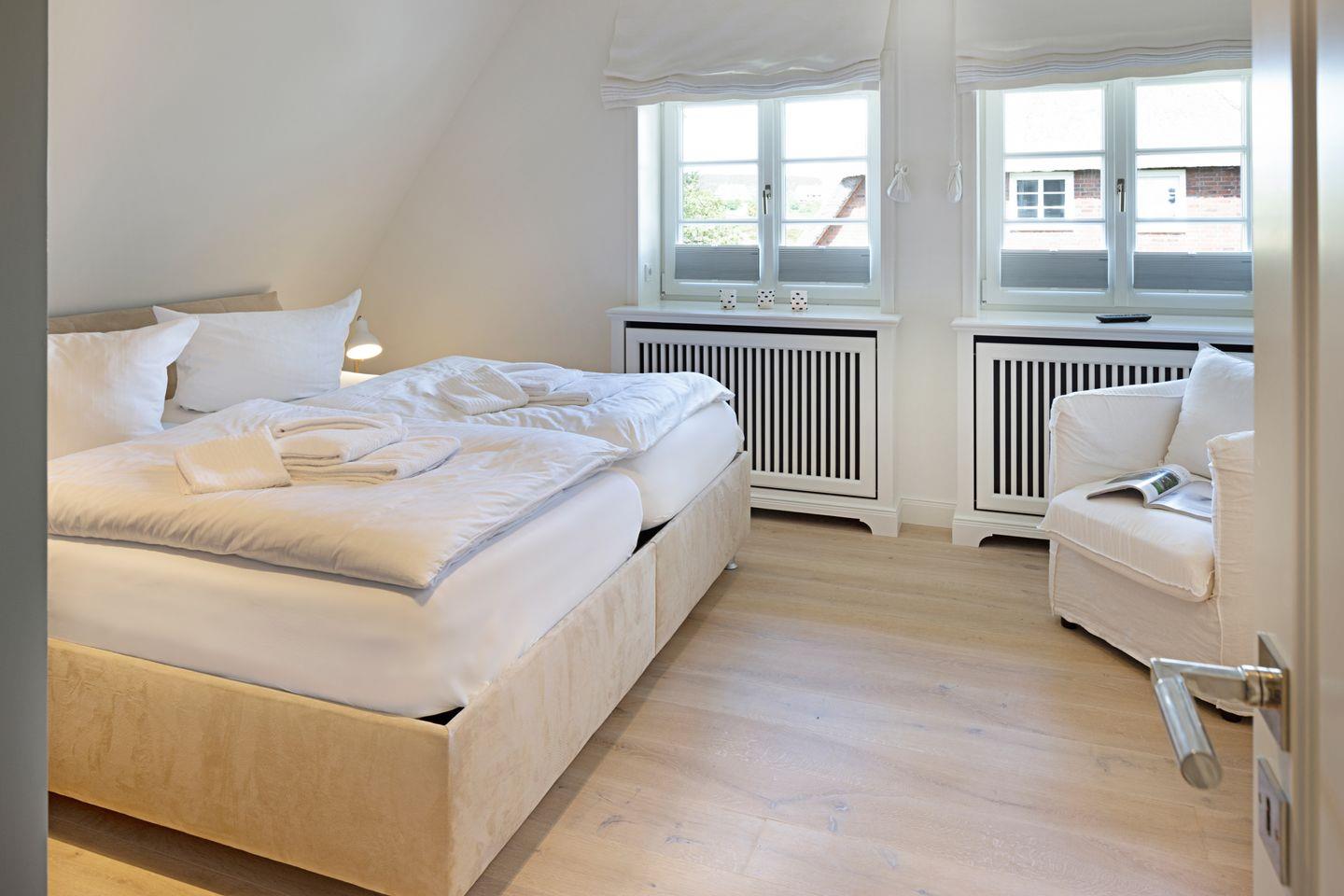 Das dritte Schlafzimmer mit Boxspringbett (Doppelbett) und einem Badezimmer befindet sich im Souterrain.