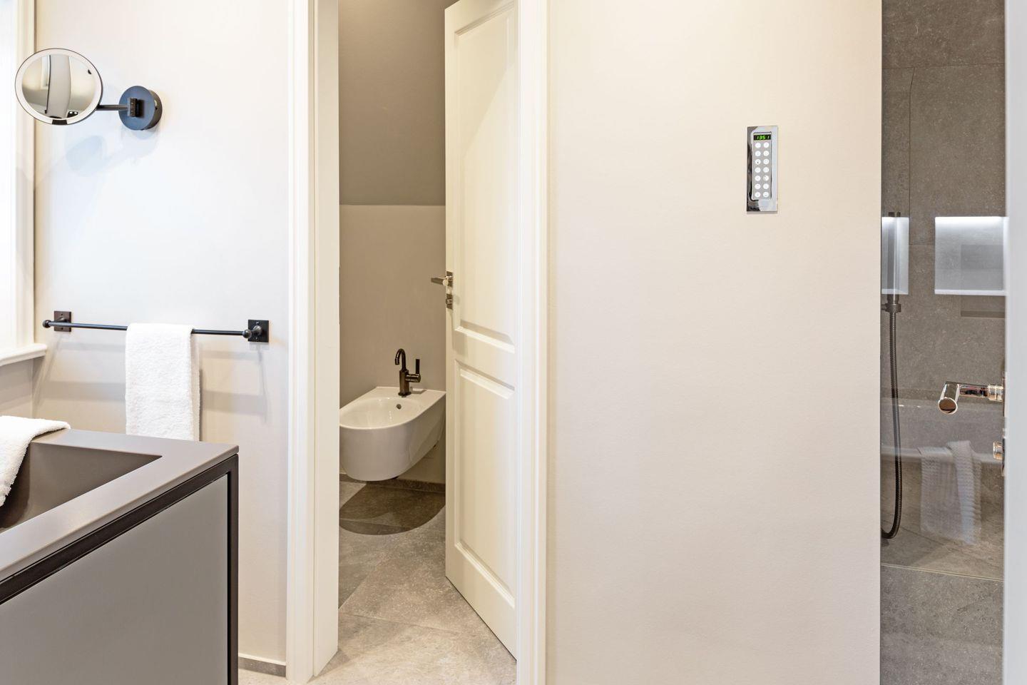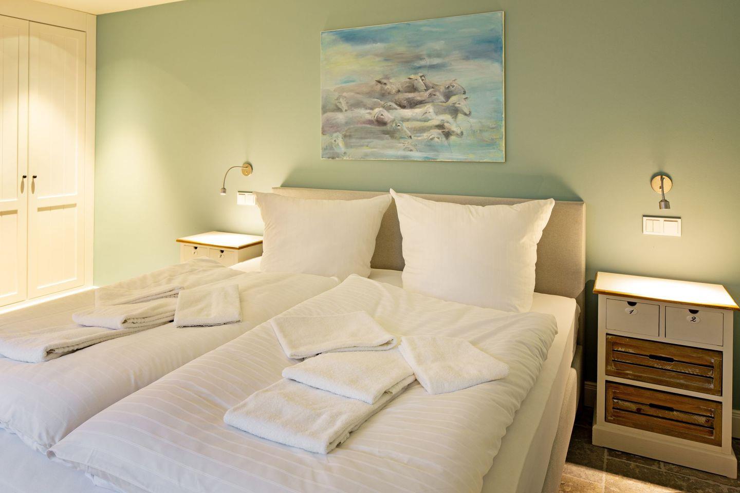 Ein Gäste-WC ist ebenfalls im Erdgeschoss zu finden. Zwei Schlafzimmer mit Boxspringbetten (Doppelbetten) und zwei Bad en Suite finden Sie im 1. OG.