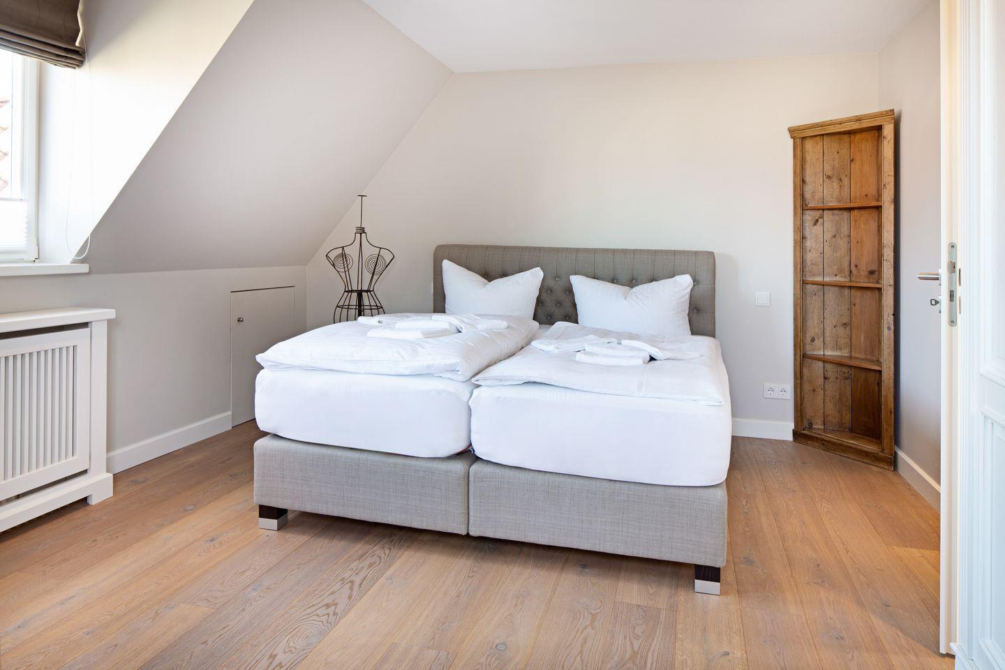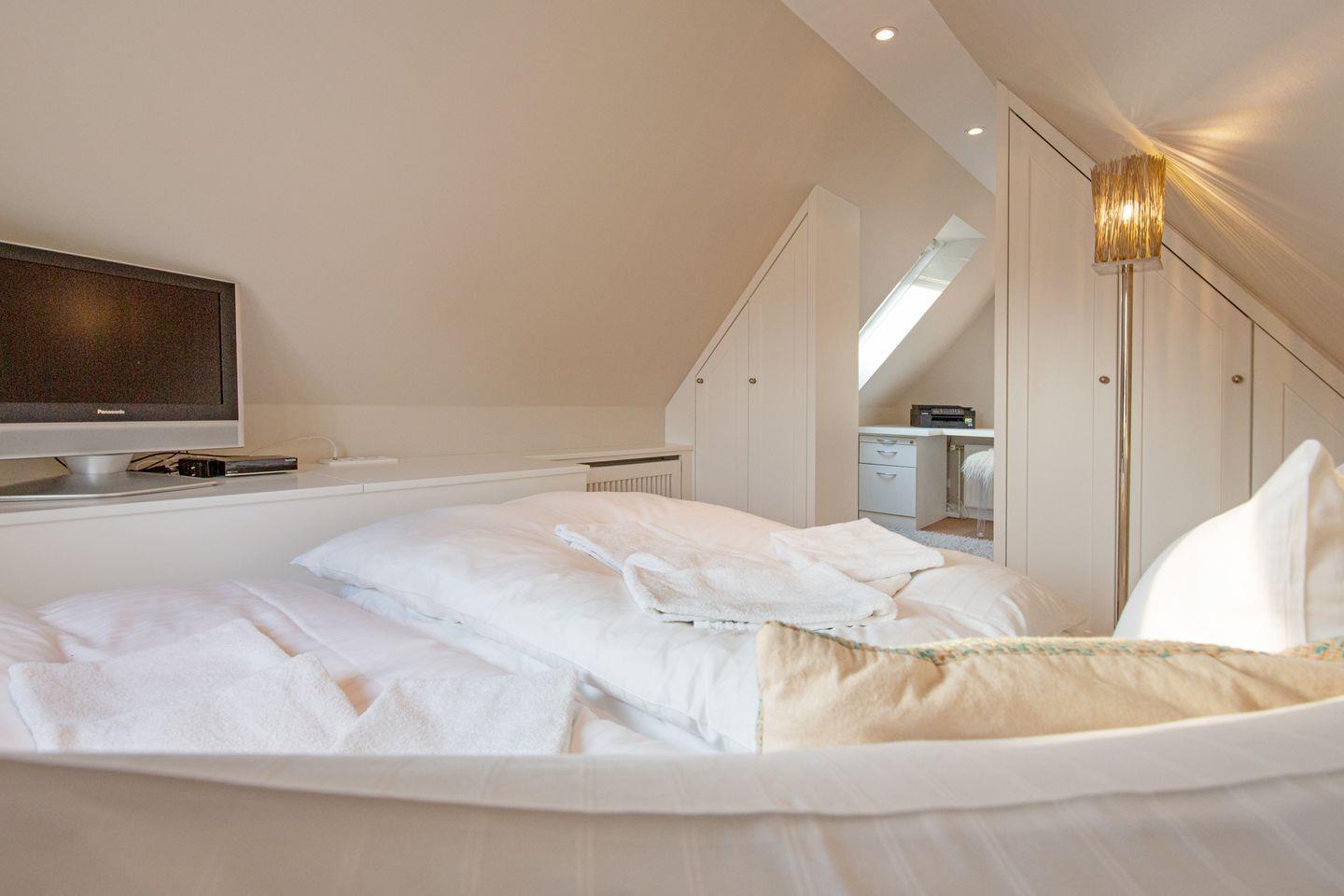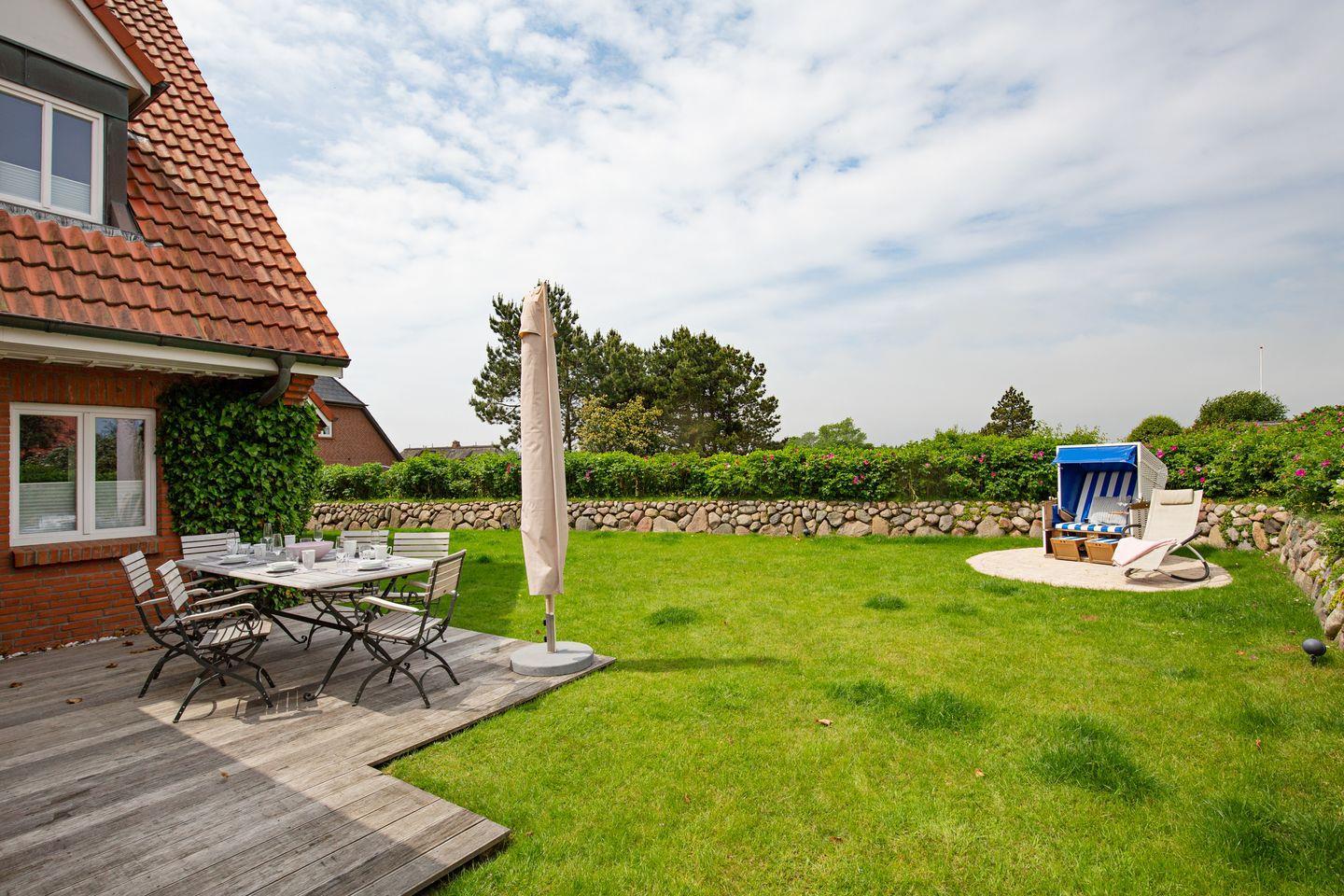 Genießen Sie die sonnige Terrasse in Ihrem Strandkorb, entspannen Sie in der (Infrarot-)Sauna oder der freistehenden Badewanne mit direktem Zugang zum Garten (EG) mit Blick auf die Syltrosen. Im 1. Stock befinden sich zwei Schlafzimmer (eins mit Schreibtisch) und ein Bad. Im Dachgeschoss (stark ansteigende Treppe) befindet sich ein weiteres Arbeitszimmer und einem Bad.