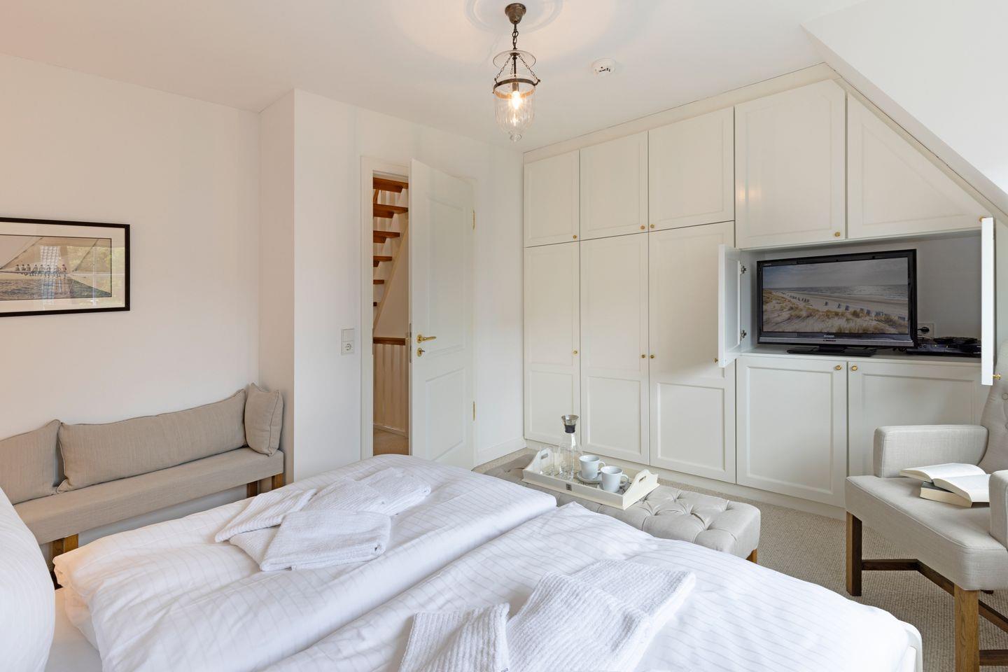 Das Ferienhaus verfügt über zwei einladende Schlafzimmer (1x Doppelbett und 2x Einzelbetten), die mit einem gemütlichen Teppichboden ausgestattet sind und einen ruhigen Rückzugsort bieten. Das Wohnzimmer ist hell und geräumig, mit zeitgemäßer Einrichtung, die zum Verweilen einlädt. Hier finden Sie auch moderne Unterhaltungsmöglichkeiten, damit Sie auch im Urlaub keine Ihrer Lieblingssendungen verpassen müssen.