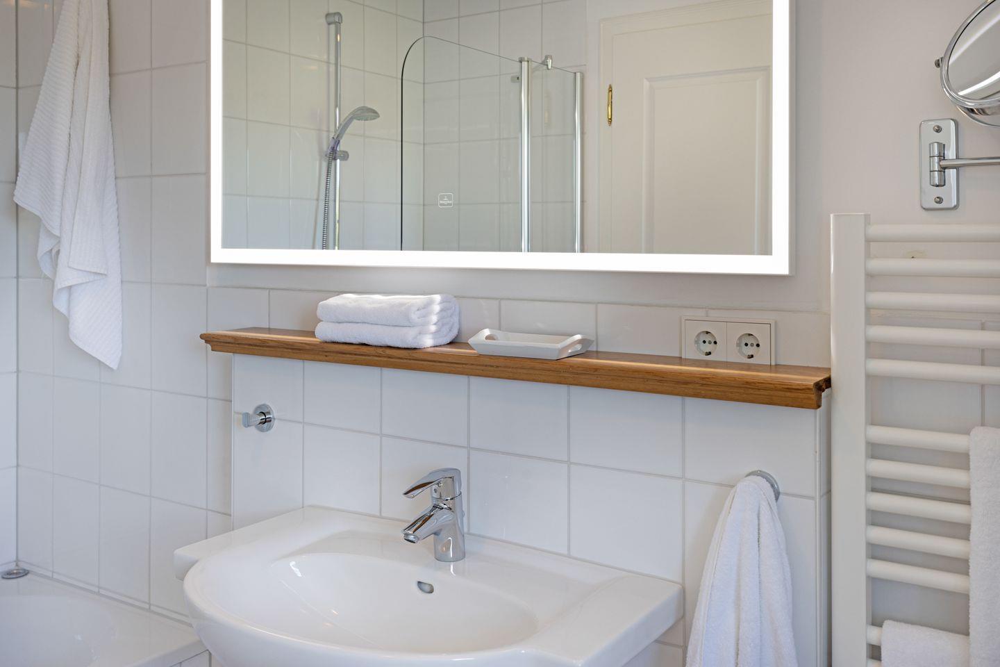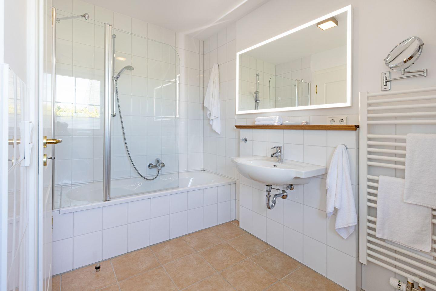 Ein weiteres Highlight der Unterkunft ist das Badezimmer, das eine Badewanne sowie eine Dusche bereithält. Hier können Sie sich nach einem aufregenden Tag am Strand entspannen und die Seele baumeln lassen.