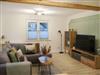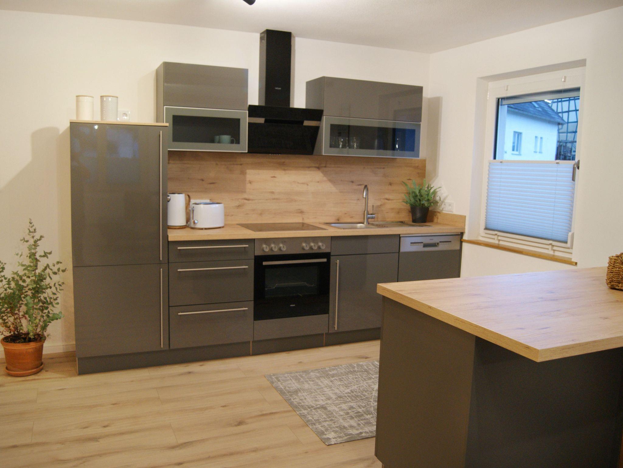 Großzügig gestaltetes Wohnzimmer mit Familiencouch, TV und Kaminofen. Küche, Essbereich und Wohnzimmer sind als offener Wohnraum gestaltet. In der Küche befindet sich eine Einbauküche mit Herd / Ofen, eine Spülmaschine und eine Kühl-Gefrierkombination.