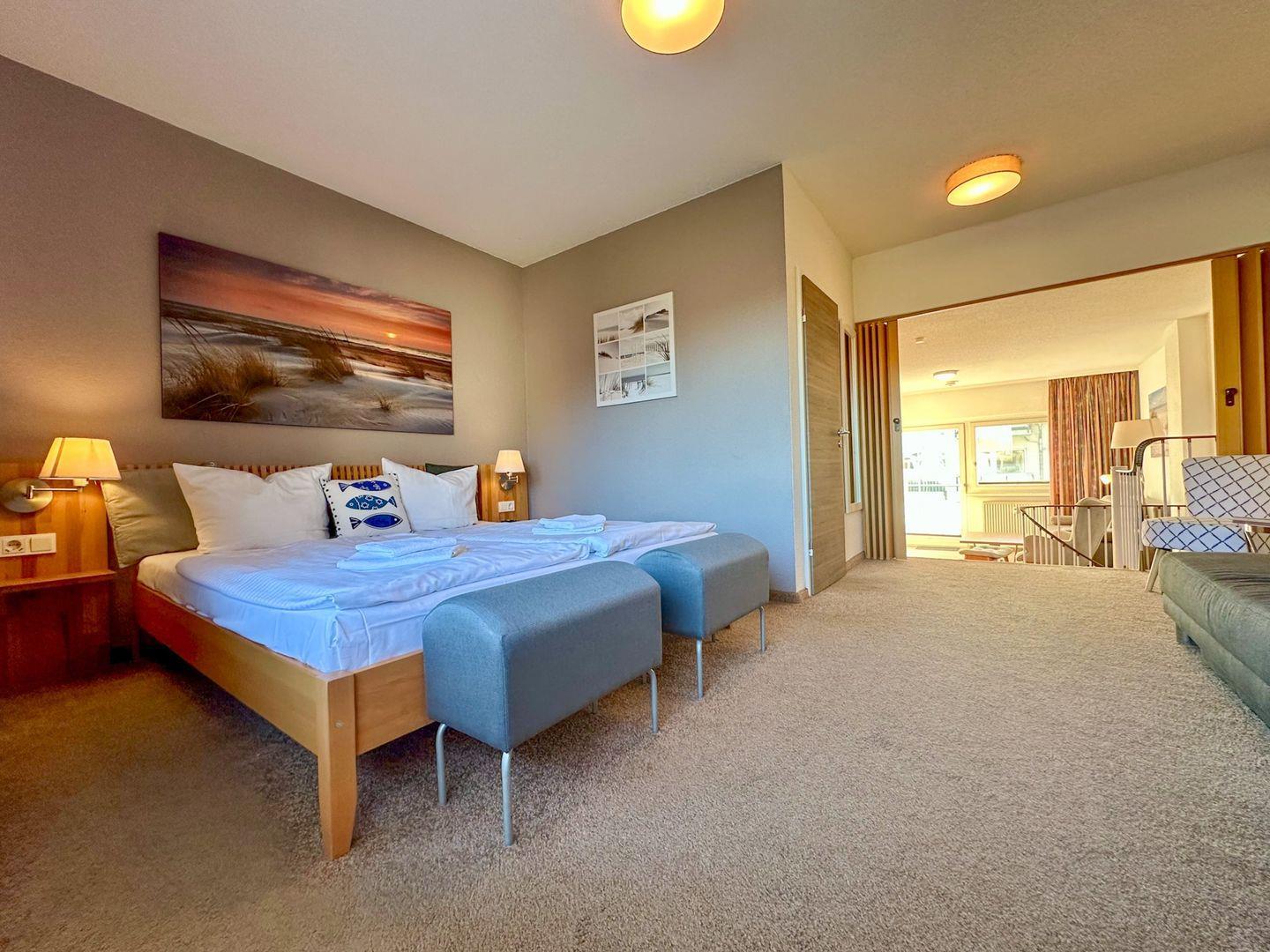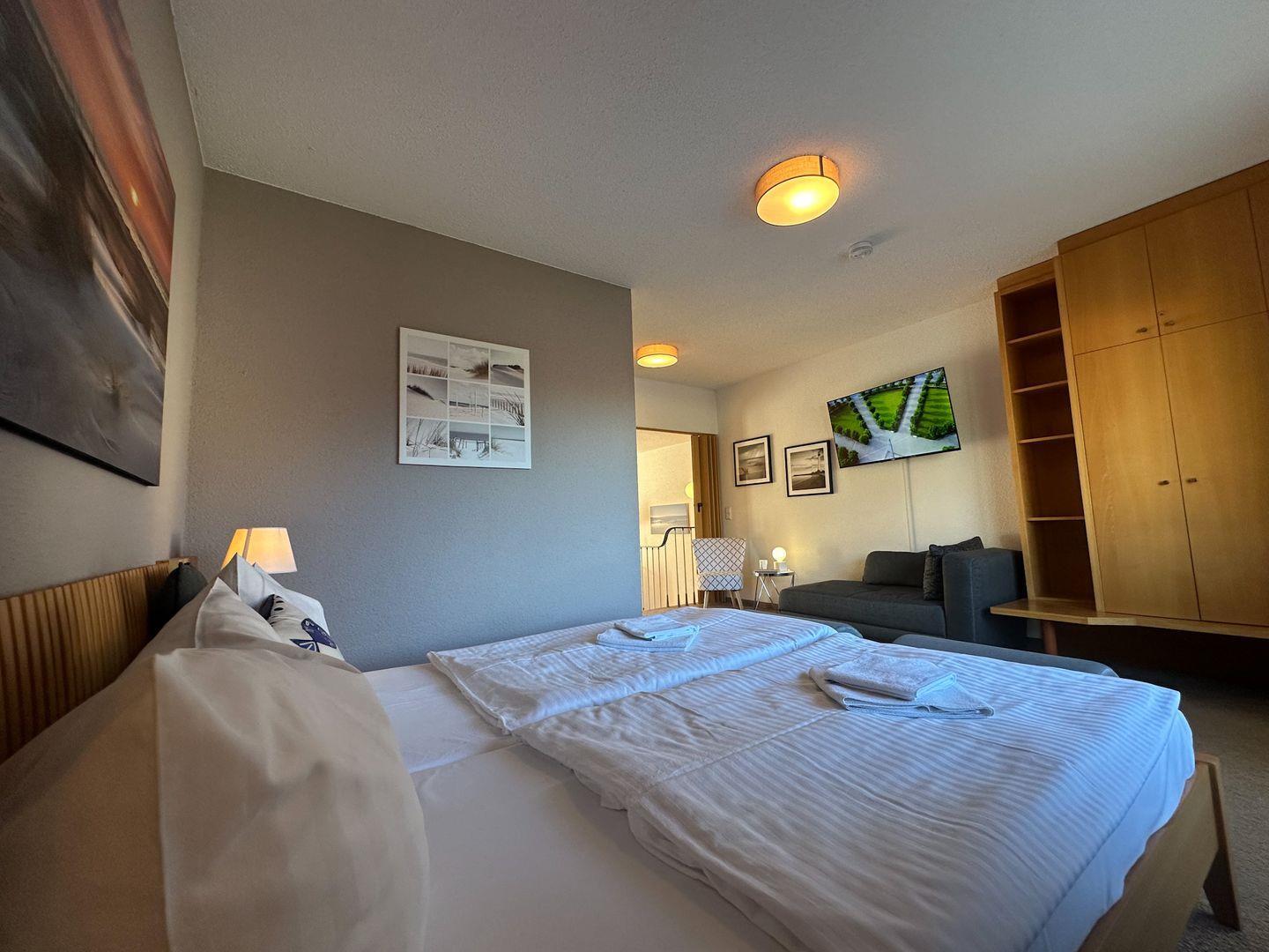 Das Schlafzimmer ist mit einem bequemen Doppelbett ausgestattet und hat Zugang zu einem möblierten Balkon. Stauraum für Ihre privaten Sachen finden Sie im geräumigen Kleiderschrank. Im Schlafzimmer befindet sich ein großer Flachbildfernseher und eine gemütliche Sitzecke mit einer Schlafcouch.