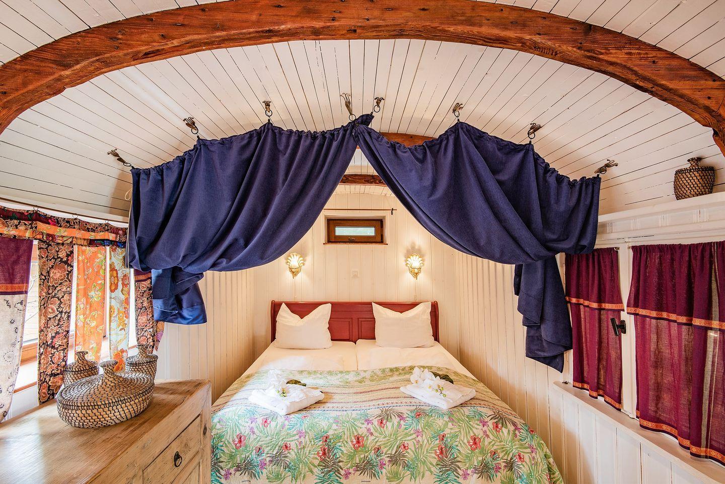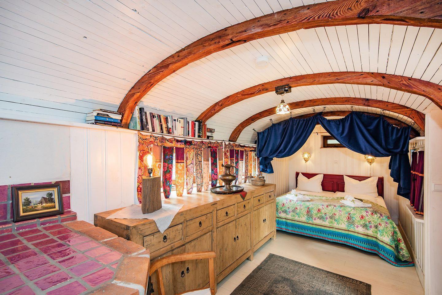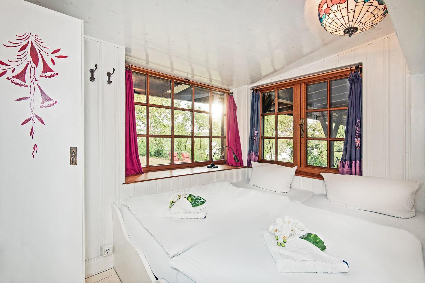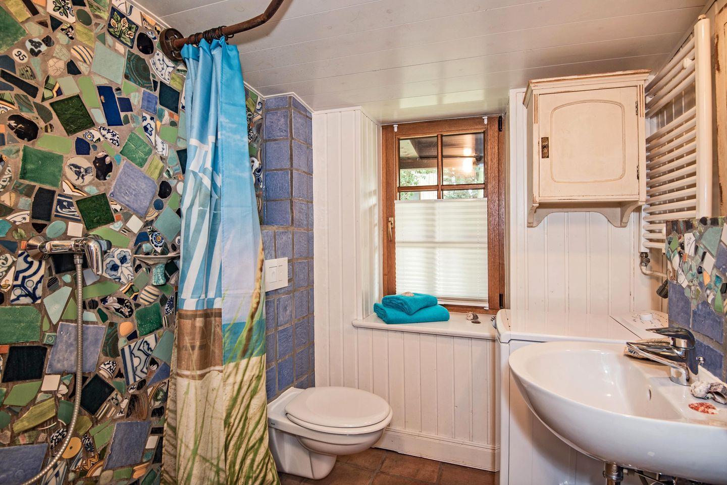 Ideal für Familien! Südexponiert mit Blick auf den Kölpinsee liegt verborgen und phantasieumwoben ein ganz eigenes Ferienhaus. Es sind die tanzenden Farben und die Geschichten erzählenden Details, die das Drinnen und Draußen so lebendig machen und die Besucher so frei für viele neue Gedanken auf dem Weg der Erholung. Im Herzen wärmt ein Lehmofen, dessen Feuer den kältesten Oststürmen trotzt. Es gibt die Wahl: Einschlafen unter dem Wagenhimmel oder Aufwachen mit Blick auf den See. Eine Wohltat bei Hitze oder Sommerregen: eine große überdachte Holzterrasse mit mehreren Sitznischen. Ein wilder‚ Waldgarten’ empfängt den, der sich mit Buch und Gartenstuhl darin bewegt.