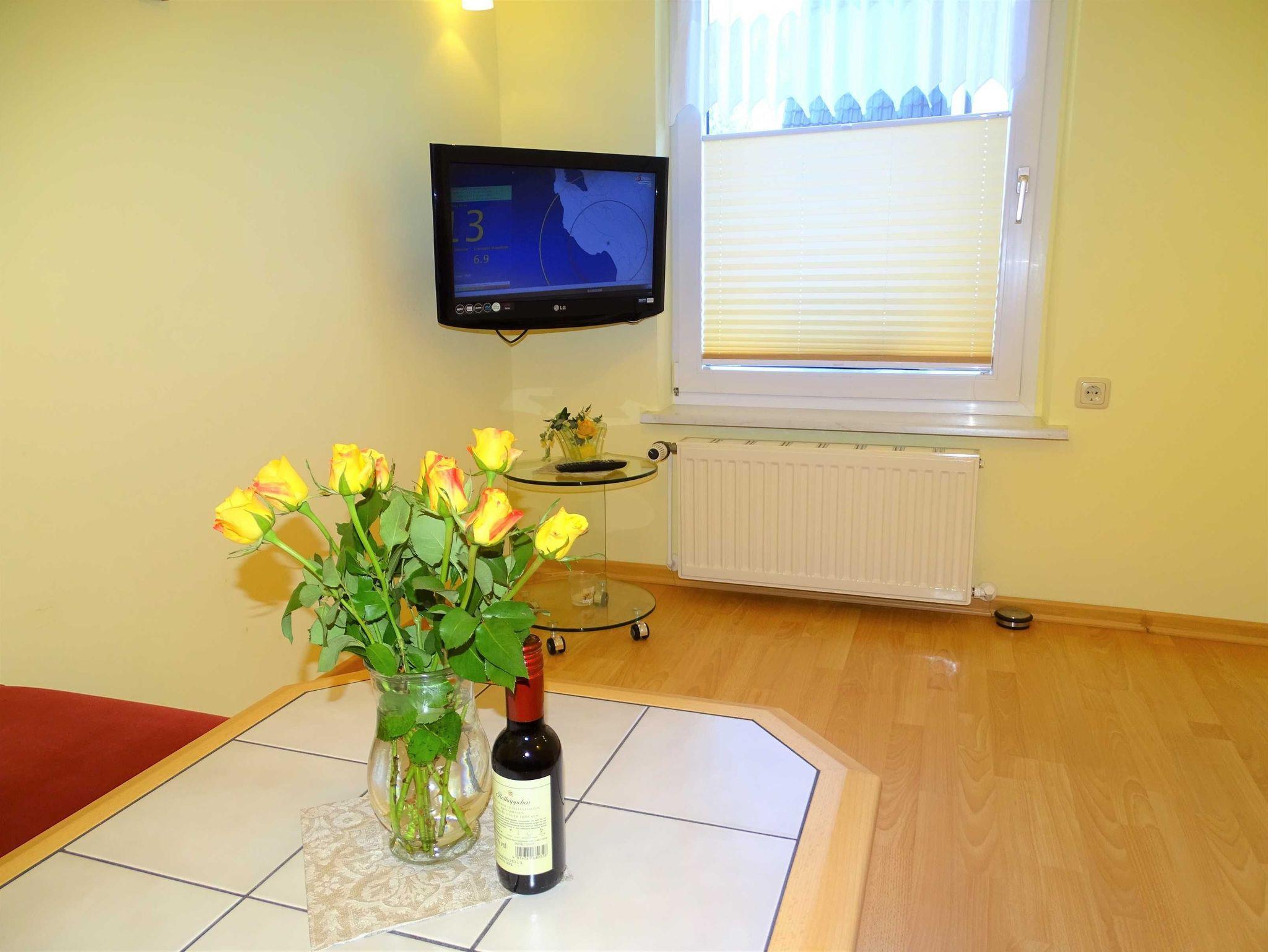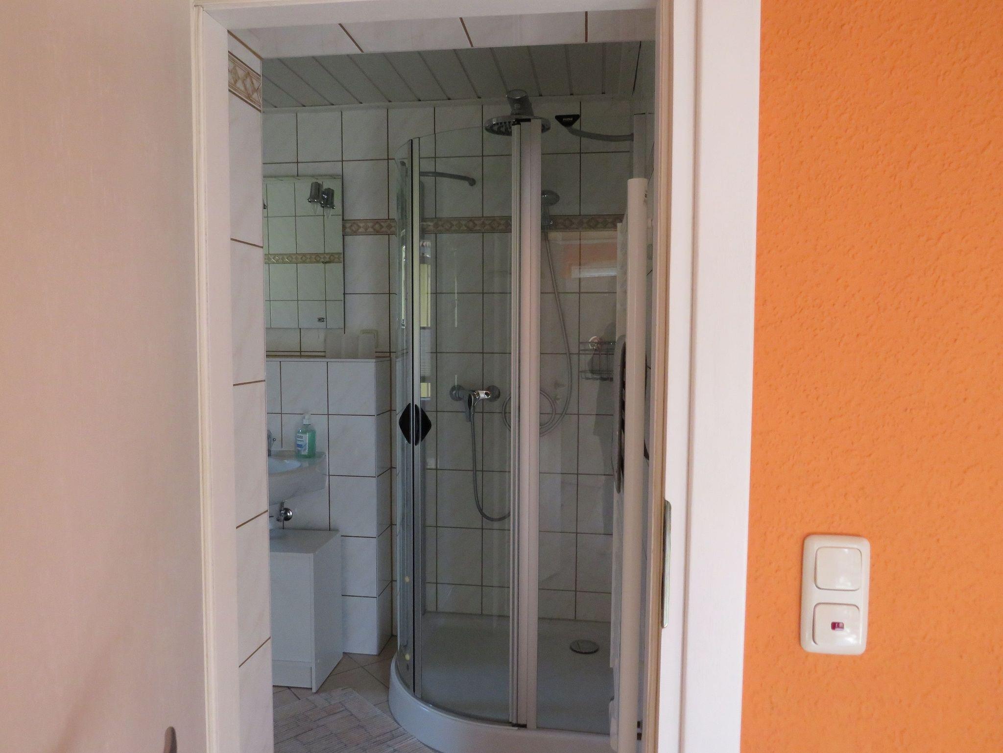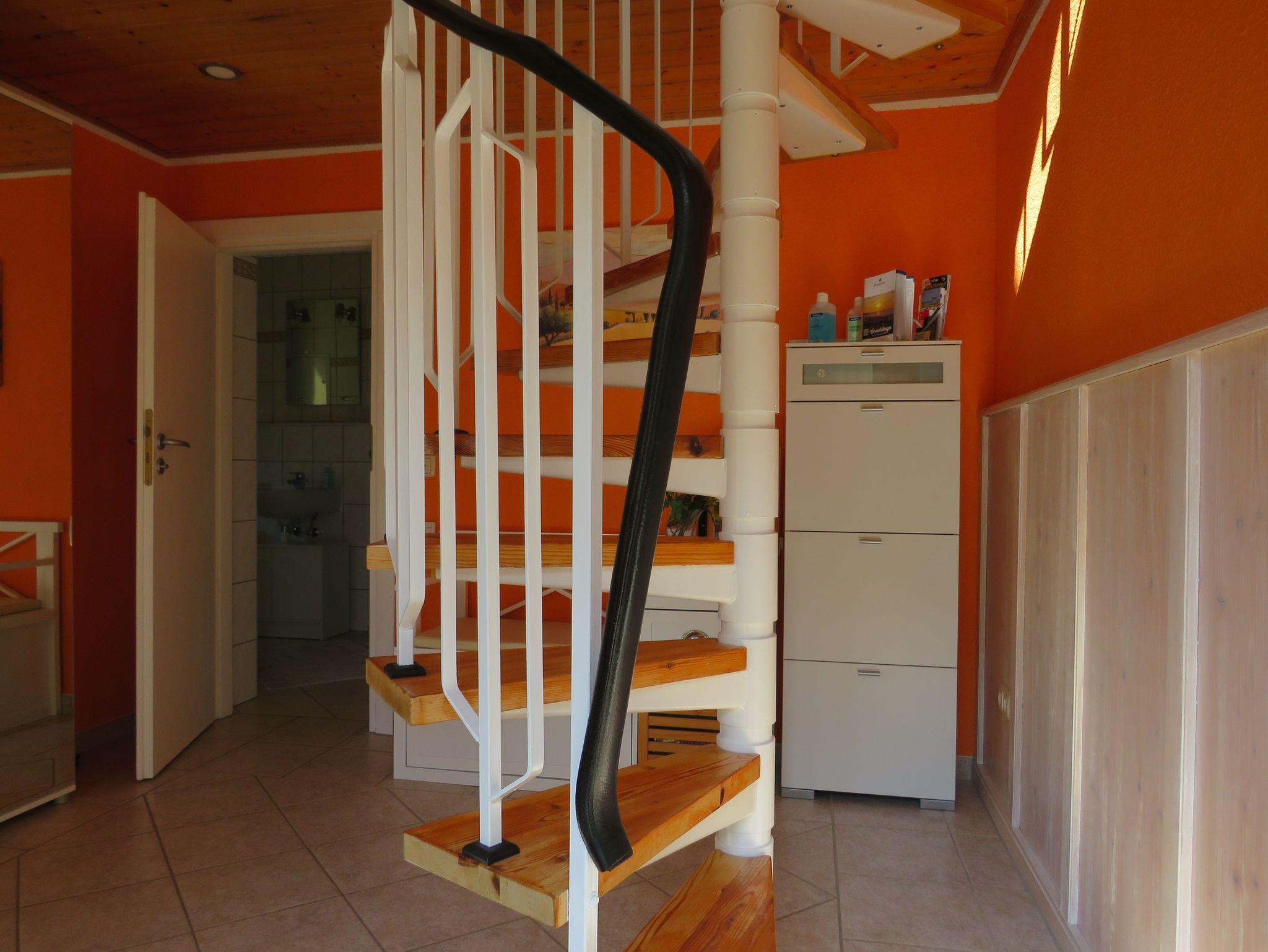 Eingang mit Diele (Garderobe) und offener Treppe (Wendeltreppe) ins Obergeschoss zu den Schlafräumen, Wohnraum mit Eckcouch, Fernseher, Radio, Küche mit komplett ausgestatteter Einbauküche, geräumiges Duschbad mit WC (seniorengerecht)