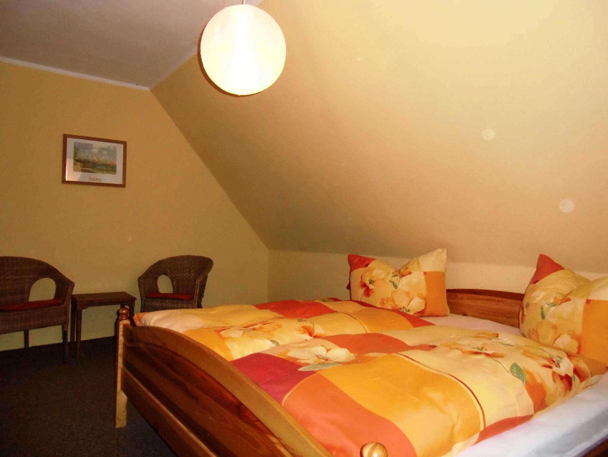 Die Drei-Raum Ferienwohnung erstreckt sich über zwei Etagen und bietet Platz für bis zu vier Personen. Im Erdgeschoss befindet sich ein großer Wohnraum mit offener Küche und das Bad (mit Dusche und WC). Ins Dachgeschoss, in dem sich die zwei Schlafräume befinden, gelangen Sie über eine Wendeltreppe.