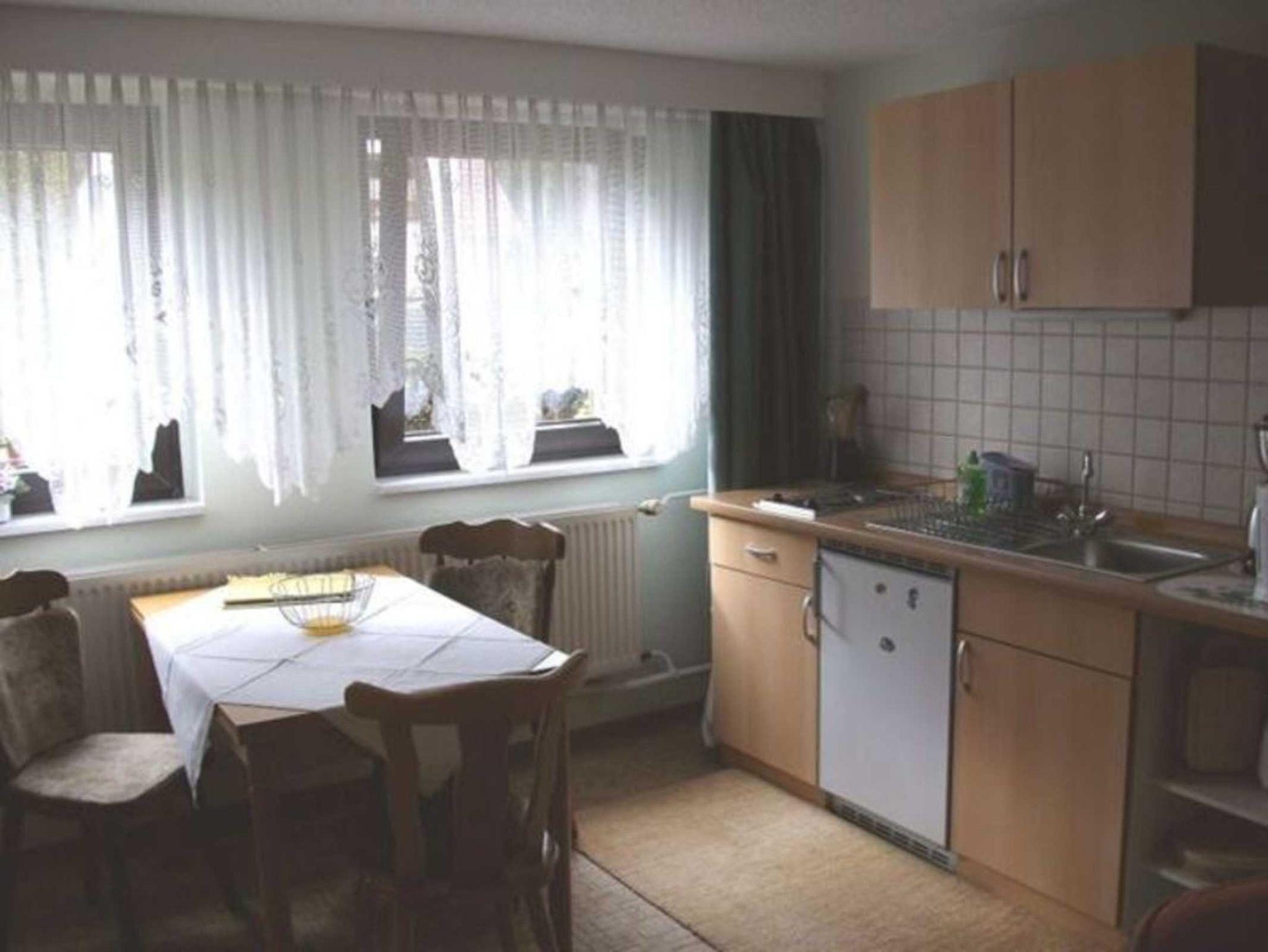 neu renovierte u. modernisierte Ferienwohnung, 56 qm, Souterrain, große Fenster, 1 Wohnnr., 1 Schlafr.mit 3 Betten, 1 kleiner Schlafraum mit Sideboard u. Schlafcouch für 1 Pers., Kochnische, Du/WC, TV, Radio, Sitzecke u. Parkplatz am Haus, 400 m zum Strand,ruhige Waldlage