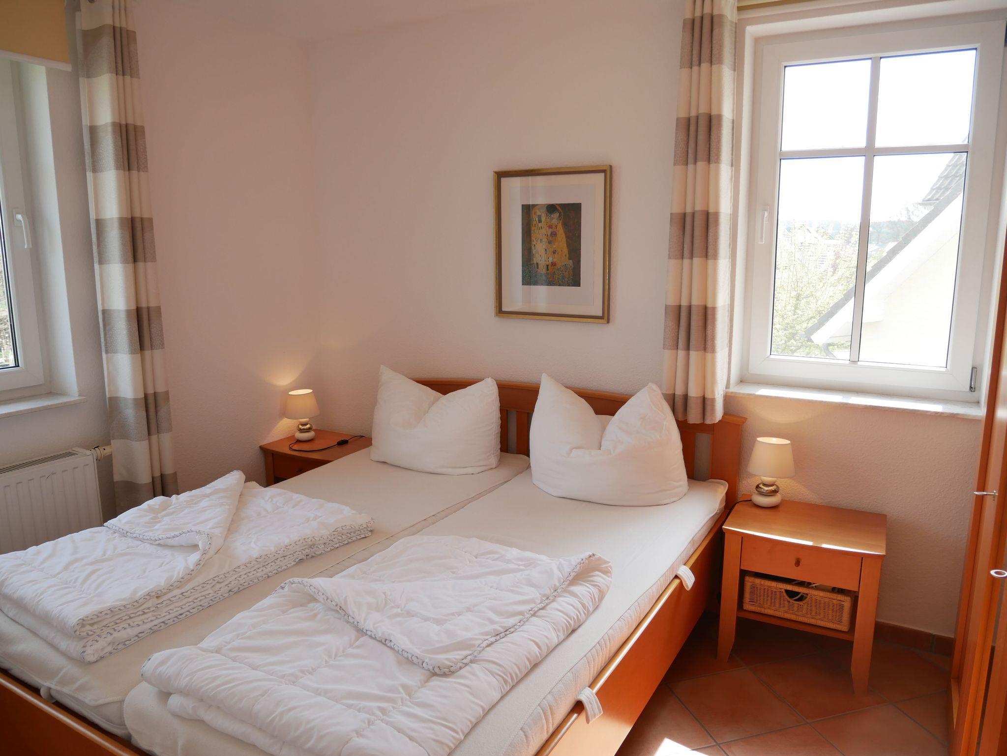 Ein Schlafzimmer ist mit einen Doppelbett und das zweite Schlafzimmer mit 2 Einzelbetten ausgestattet.