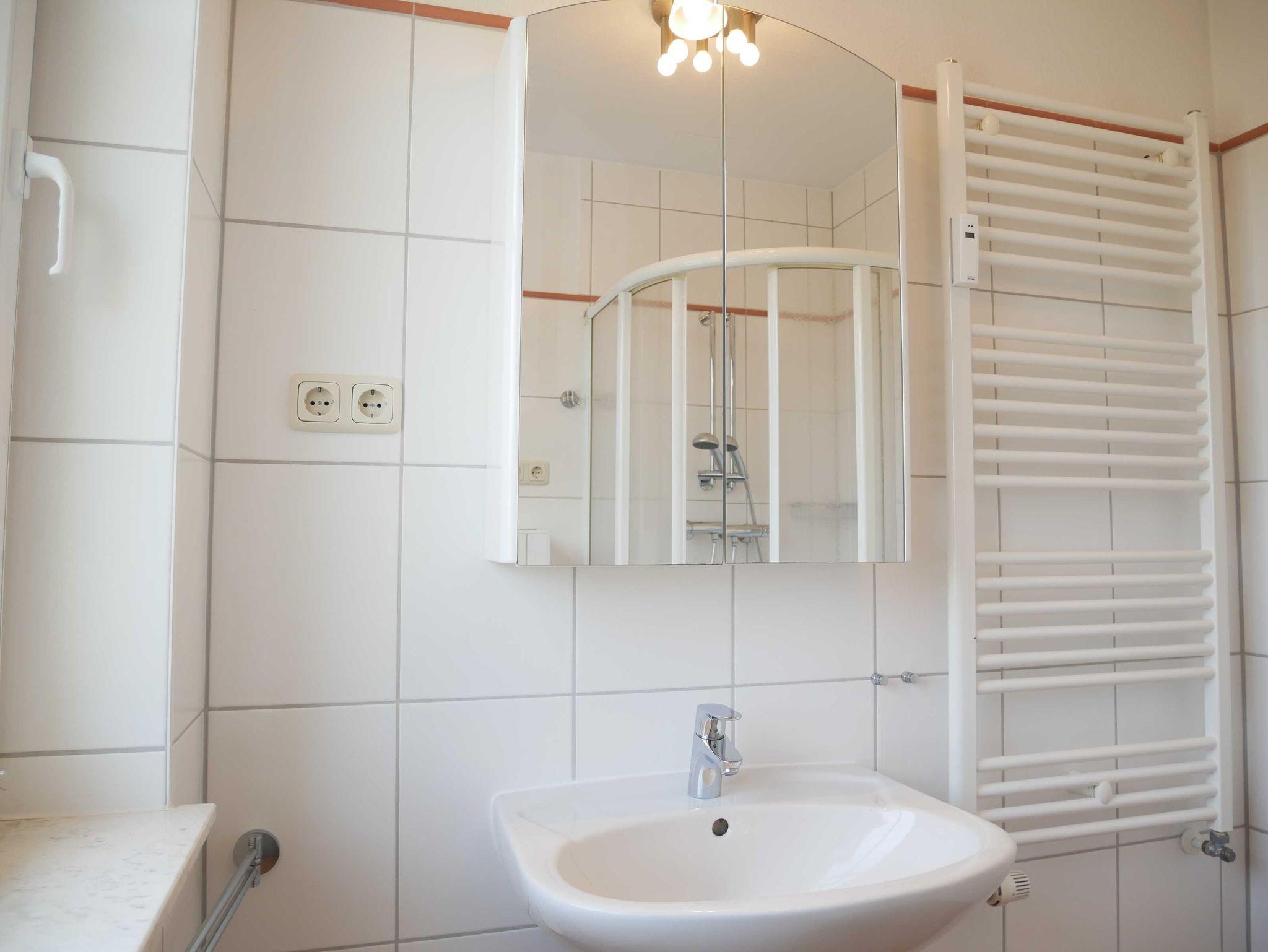 Das Tageslichtbadezimmer verfügt über Dusche/WC und eine Waschmaschine.