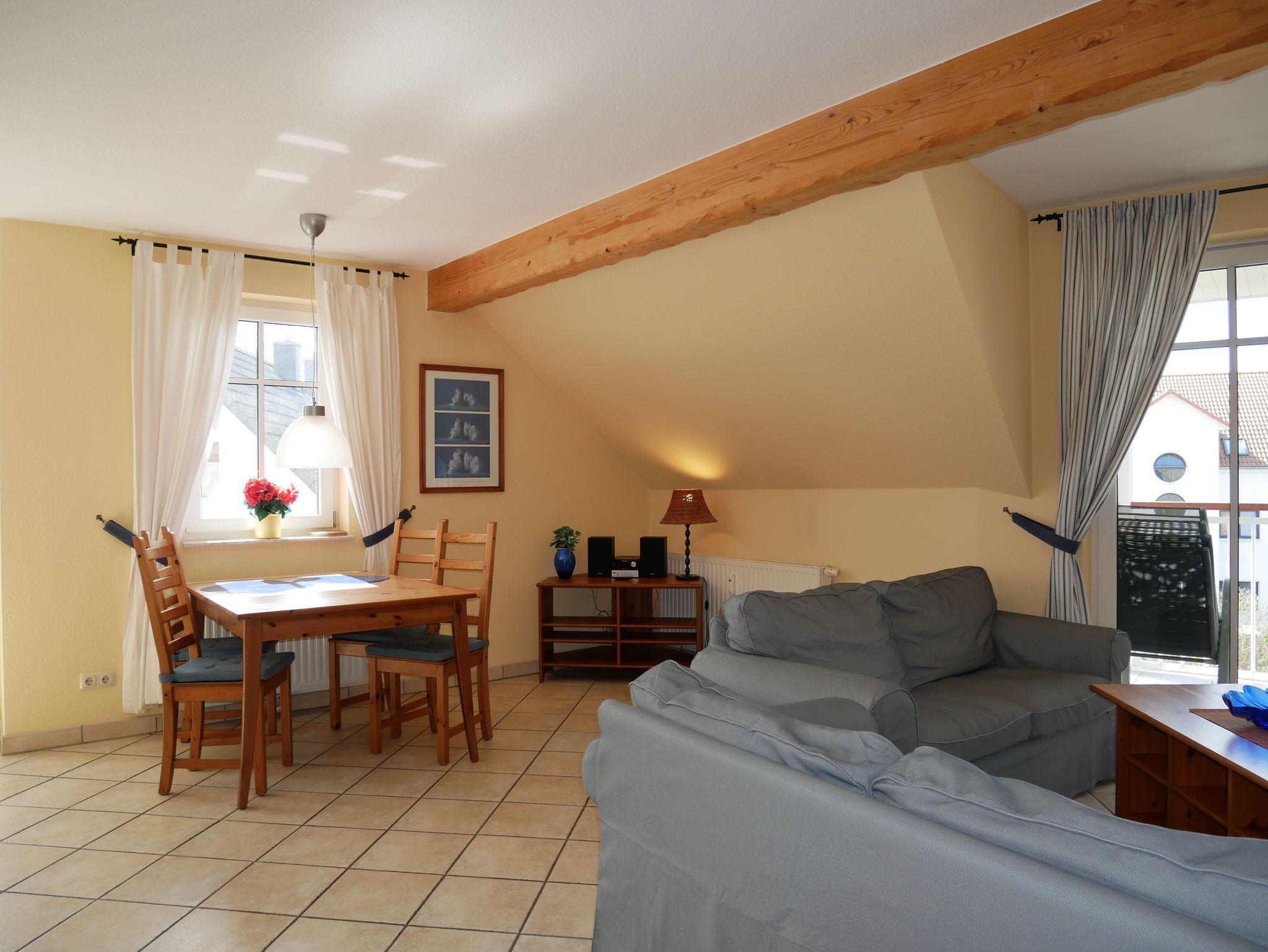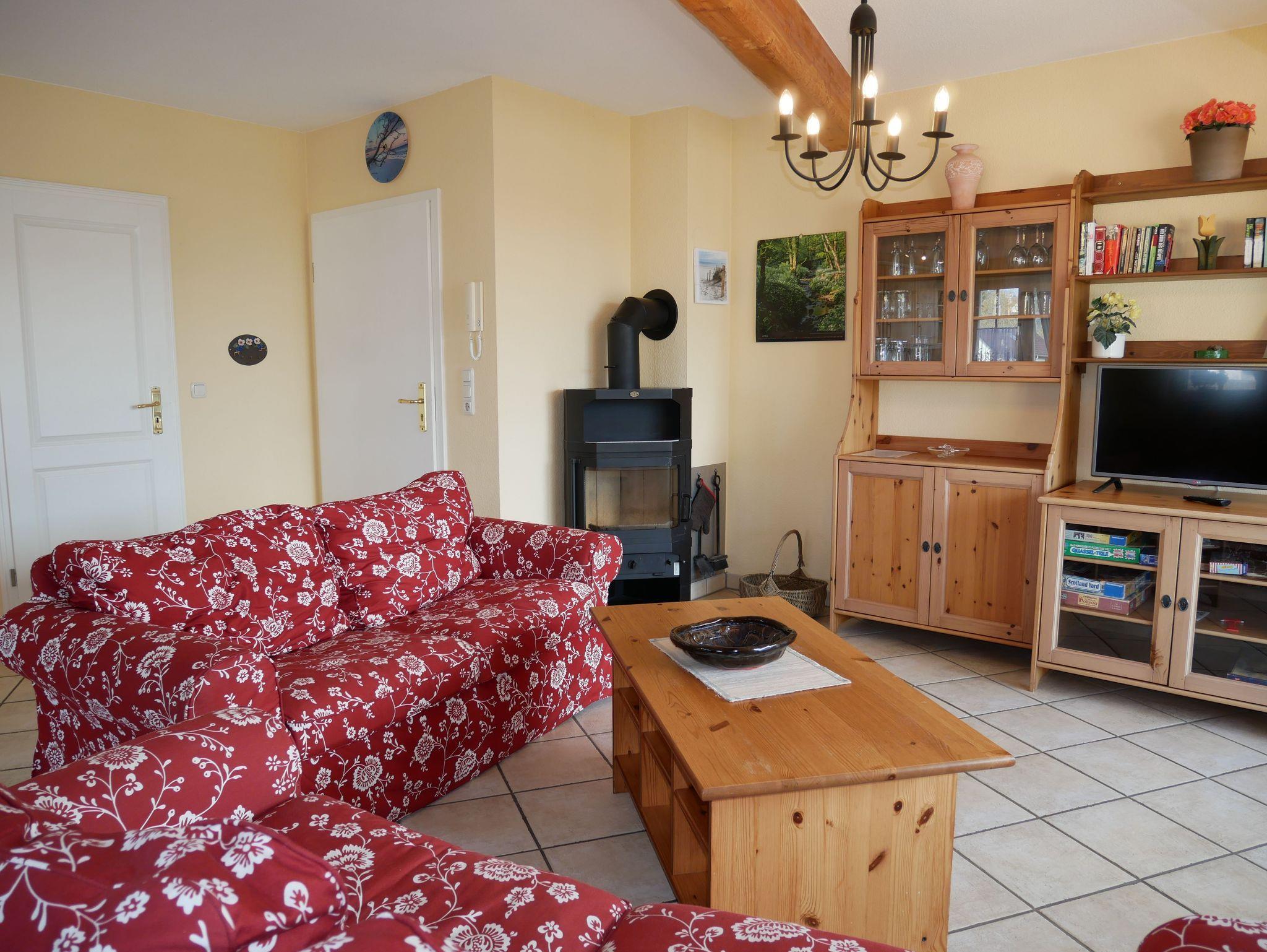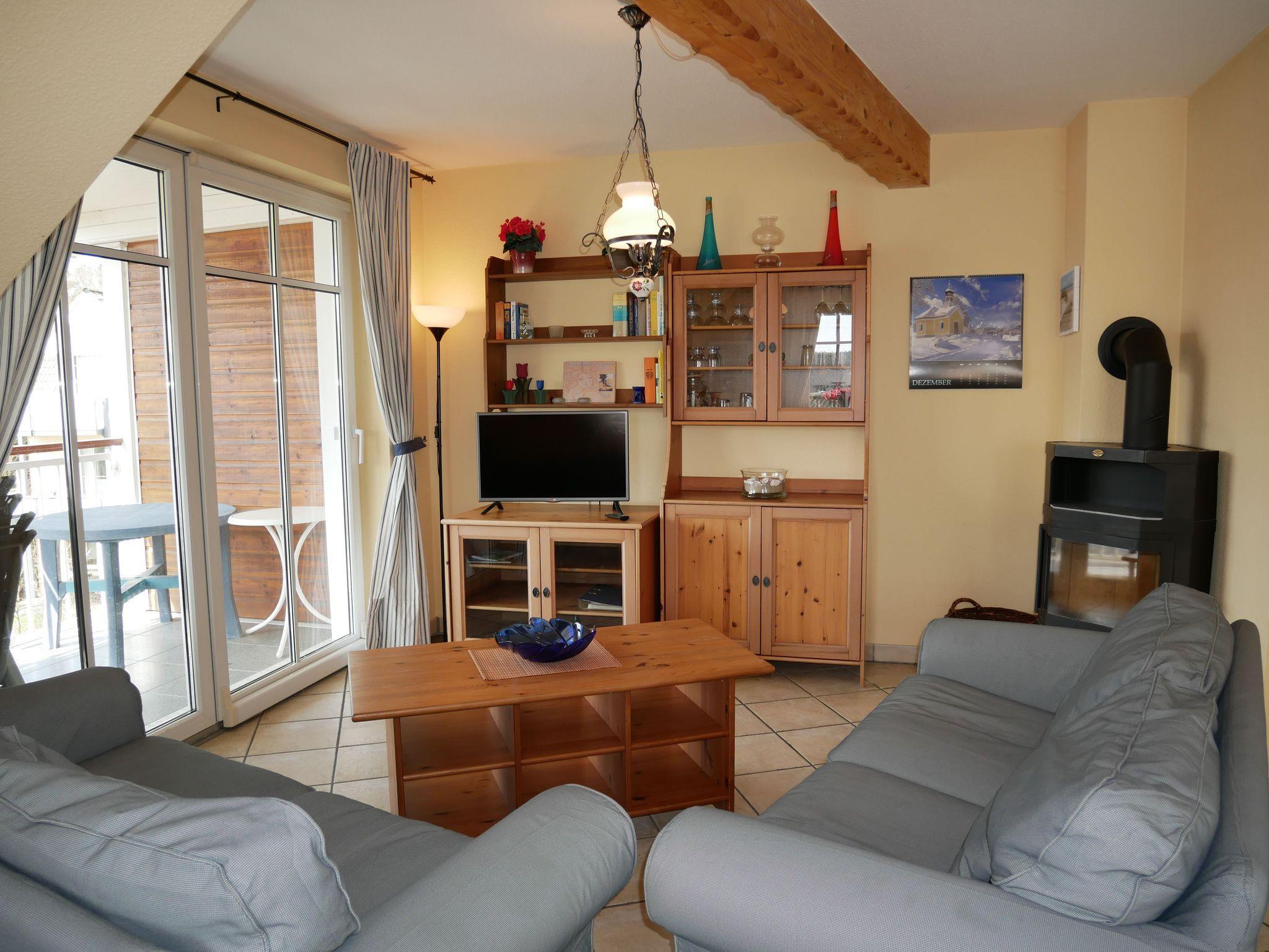 Die 65 qm große Ferienwohnung befindet sich im 2. Obergeschoss eines Mehrfamilienhauses. Das Wohnzimmer ist mit zwei gemütlichen Sofas, Flachbildfernseher und CD-Player ausgestattet. Ein Kamin lädt besonders in der kalten Jahreszeit zu gemütlichen Stunden ein. Die voll ausgestattete offene Einbauküche verfügt über eine Kücheninsel, Kühlschrank mit Gefriermöglichkeit, Geschirrspülmaschine, Mikrowelle, Koch- und Backofen. Ein Schlafzimmer ist mit einen Doppelbett und das zweite Schlafzimmer mit 2 Einzelbetten ausgestattet. Das Tageslichtbadezimmer verfügt über Dusche und WC.