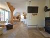 • Wohnraum mit Ledercouch (ausziehbare Schlafcouch), großer LG 43 HD-Flachbildschirmfernseher (Kabelanschluss), Holz-Kamin, Sideboard.