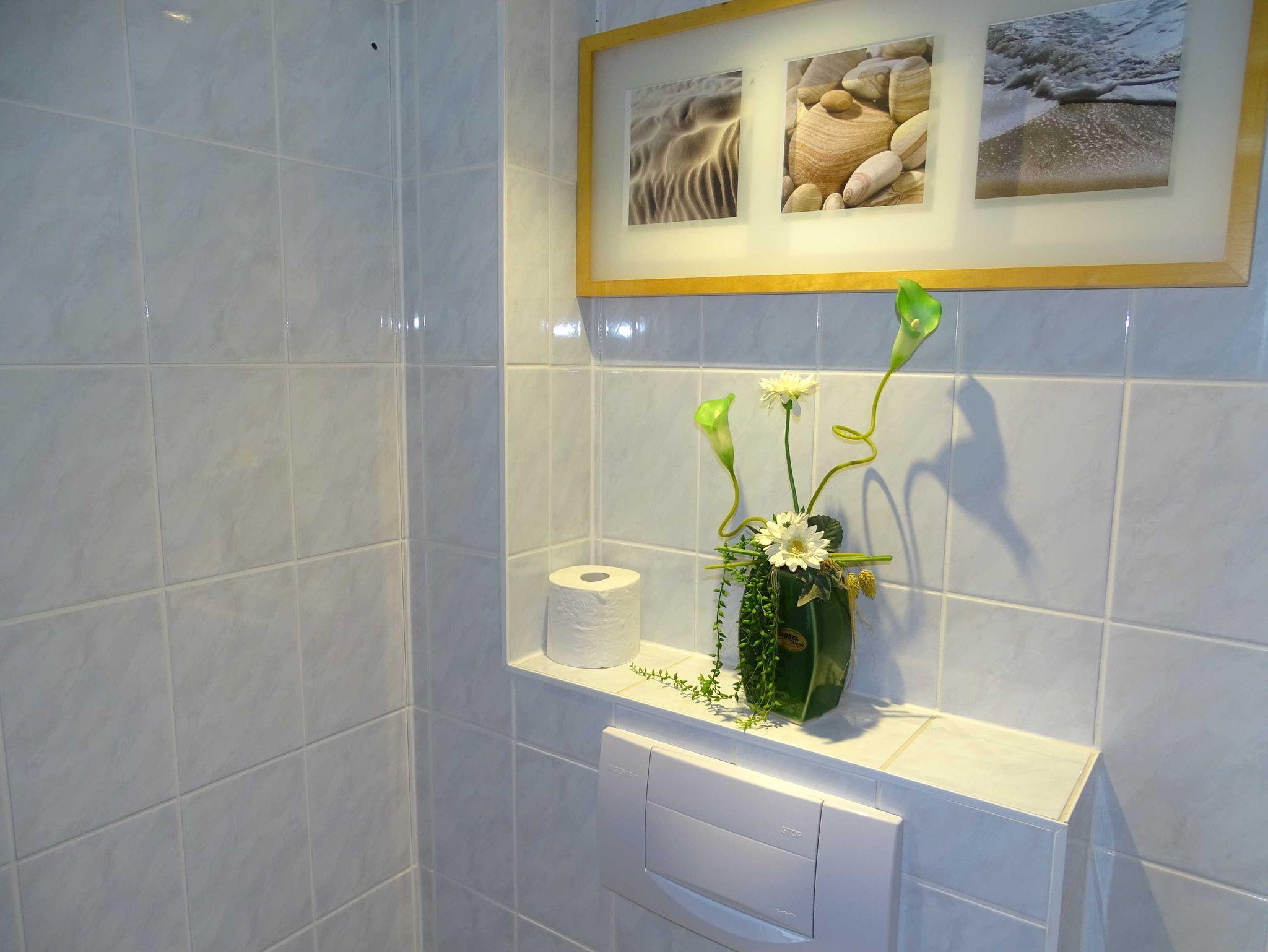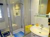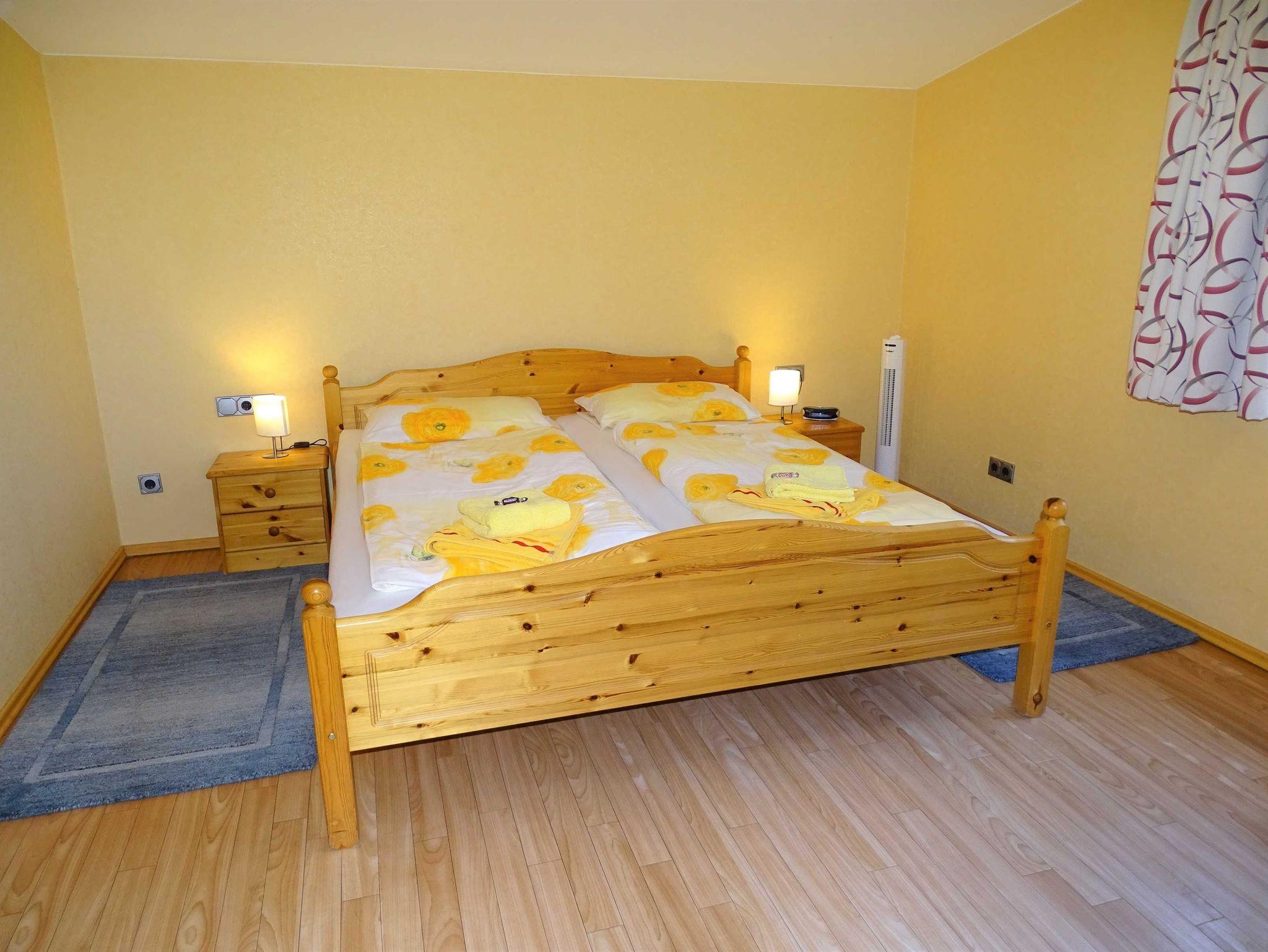 Im Obergeschoß befindet sich das geräumige Schlafzimmer mit einem Doppelbett und einer Schlafcouch als Aufbettungsmöglichkeit. Das Badezimmer ist eingerichtet mit Dusche und WC. Ein Fön ist auch vorhanden.