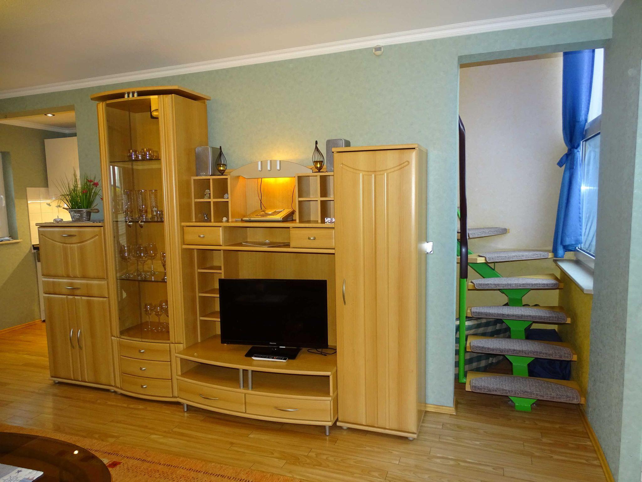 Im Erdgeschoß des Hauses finden Sie das gemütlich eingerichtete Wohnzimmer mit einer bequemen Couch (keine Schlafcouch), Fernseher und Radio, einen großzügigen Essplatz und die offene Küche. Die Küche ist komplett ausgestattet mit Geschirrspüler, Kaffeemaschine, Toaster, Wasserkocher, Geschirr und einem Kühlschrank mit Gefrierfach.